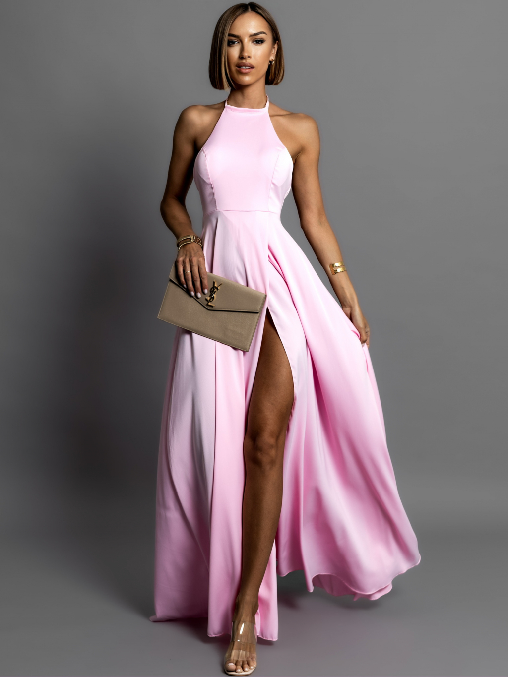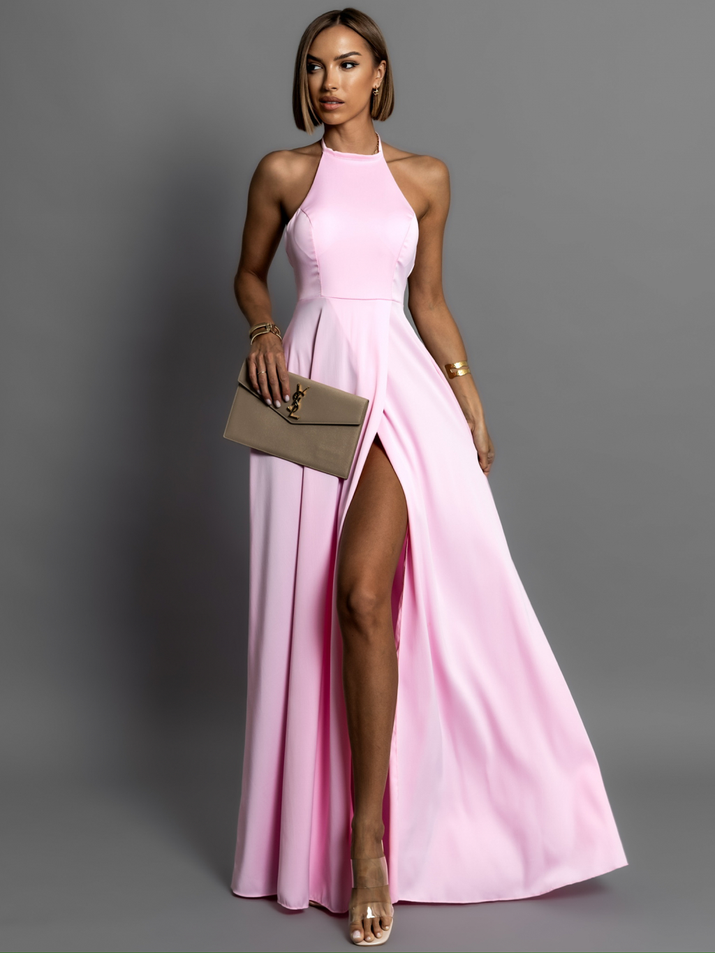 Růžové saténové dlouhé šaty HAMBUR s rozparkem