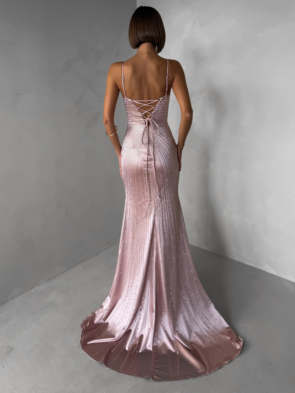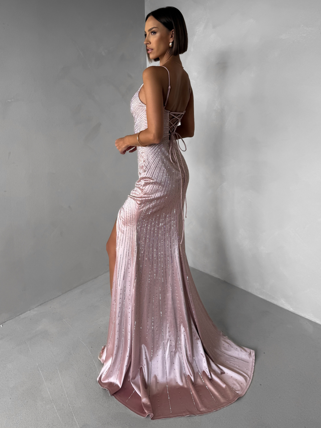 Starorůžové luxusní plesové třpytivé šaty RAVELLE s rozparkem