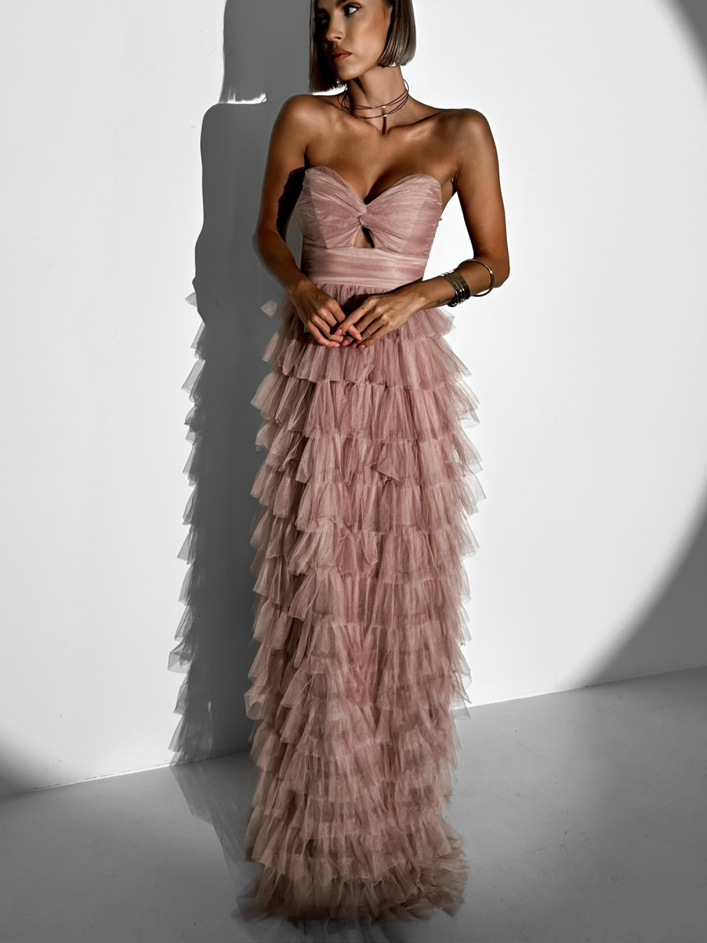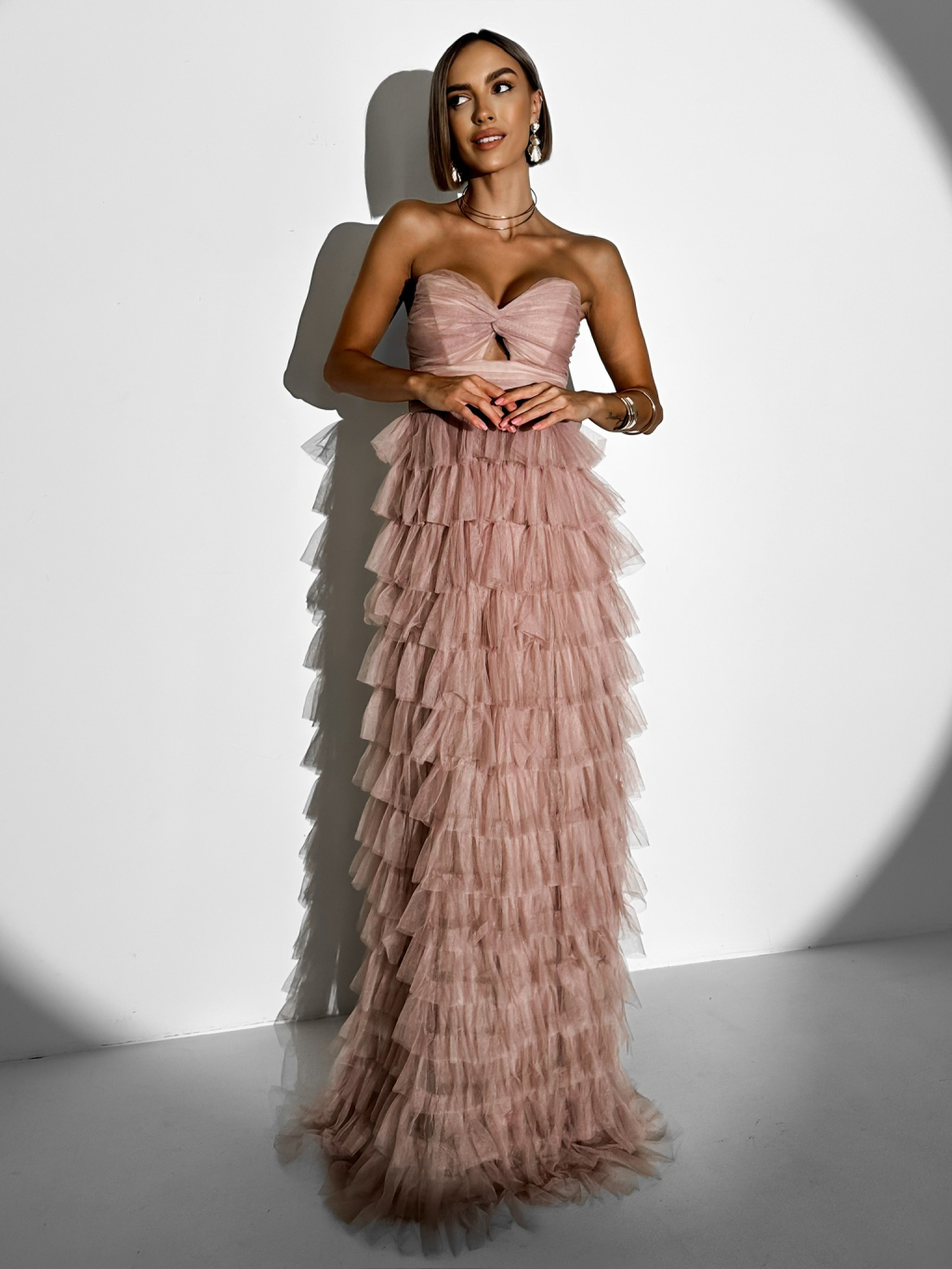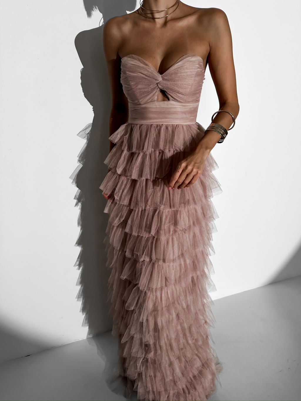 Starorůžové plesové tylové šaty BRUNHIL s volánky