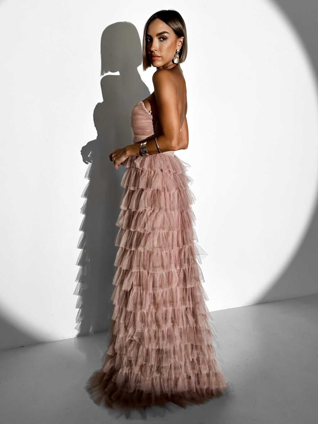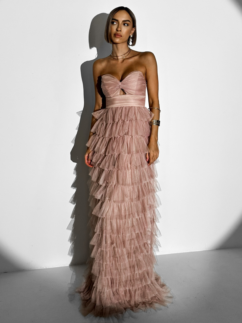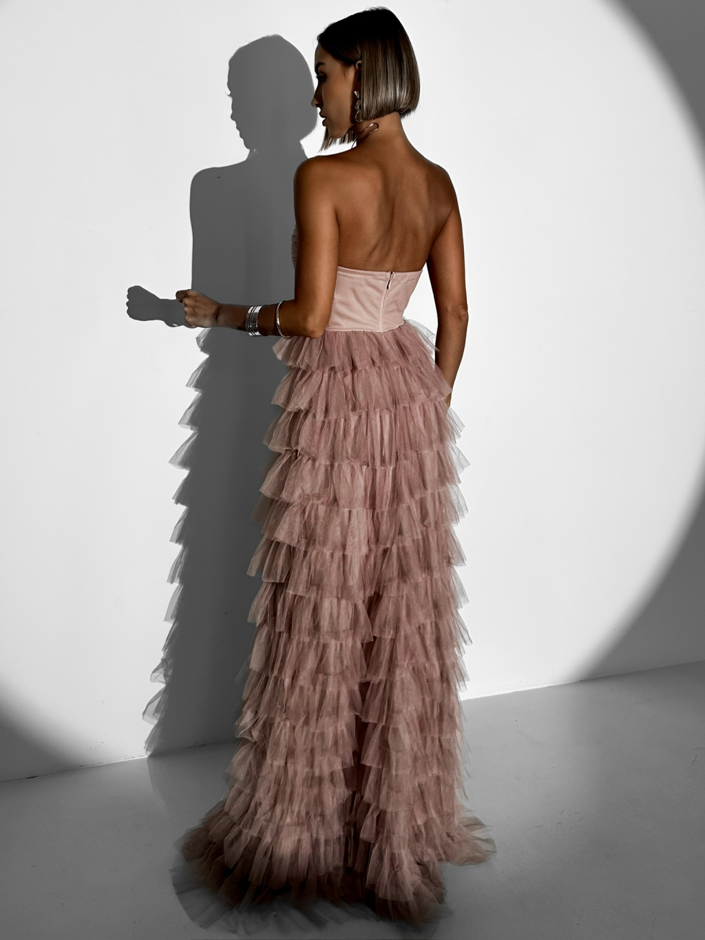 Starorůžové plesové tylové šaty BRUNHIL s volánky