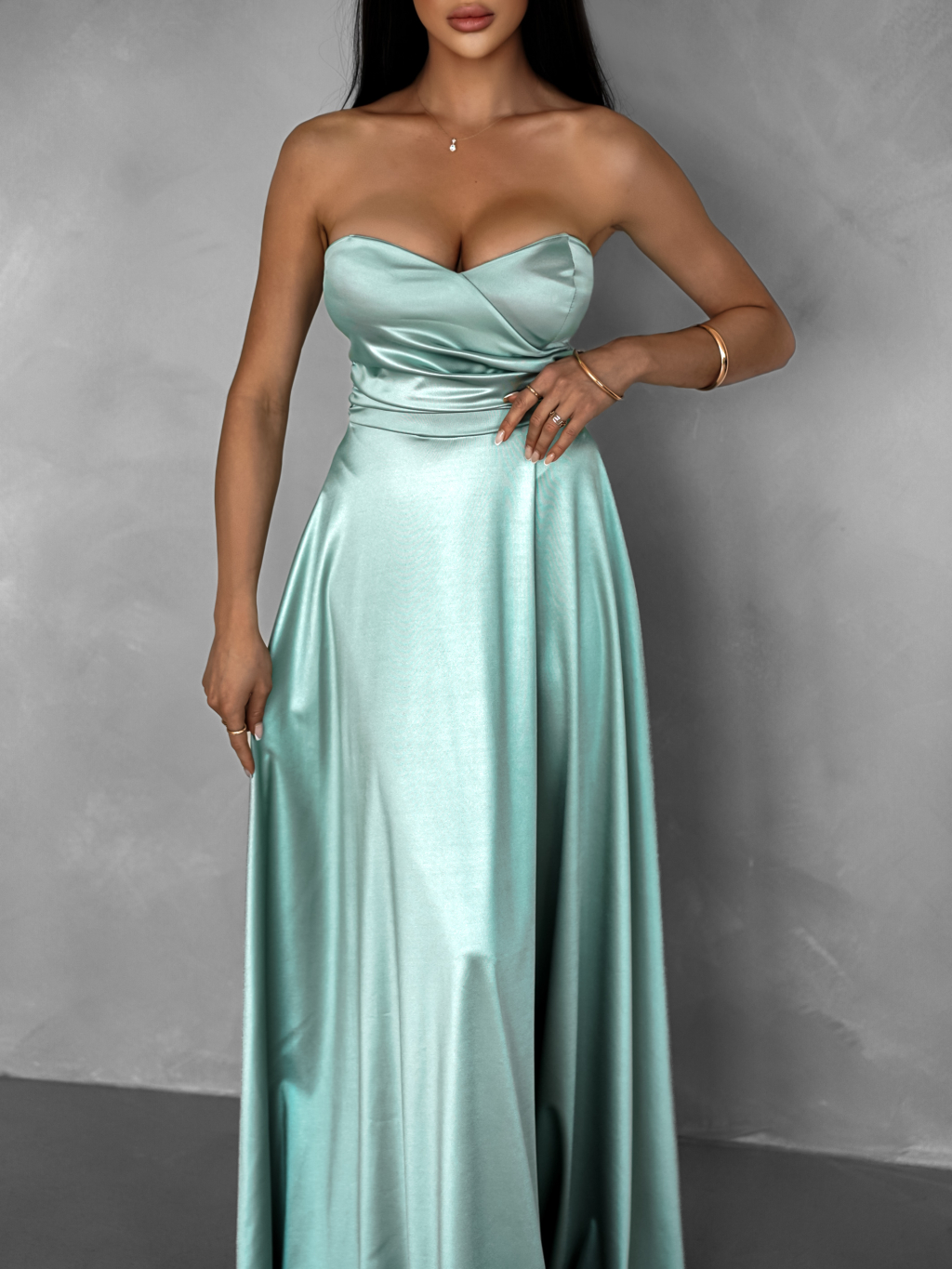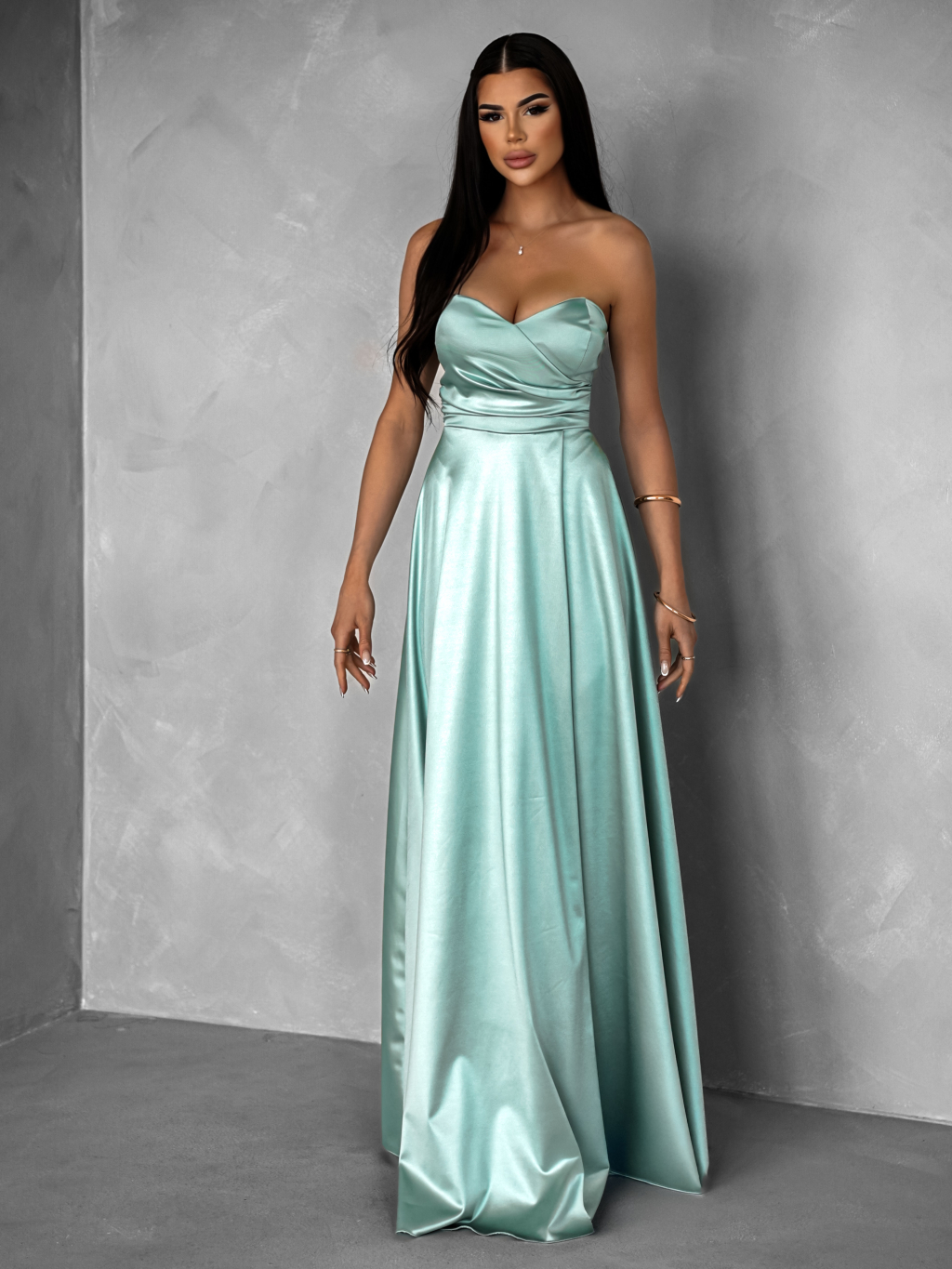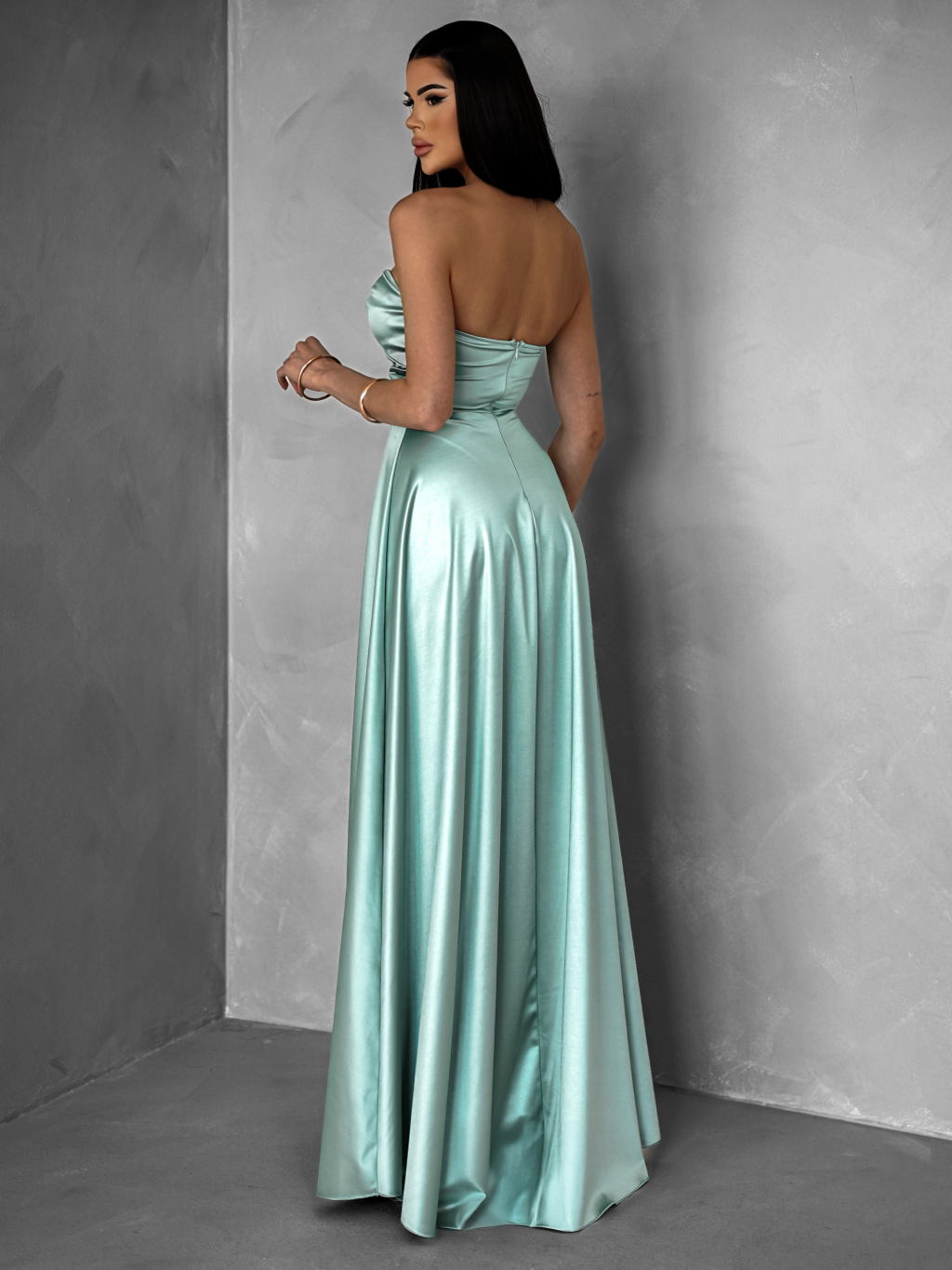 Světle zelené saténové dlouhé šaty SYCHAEUS bez ramínek