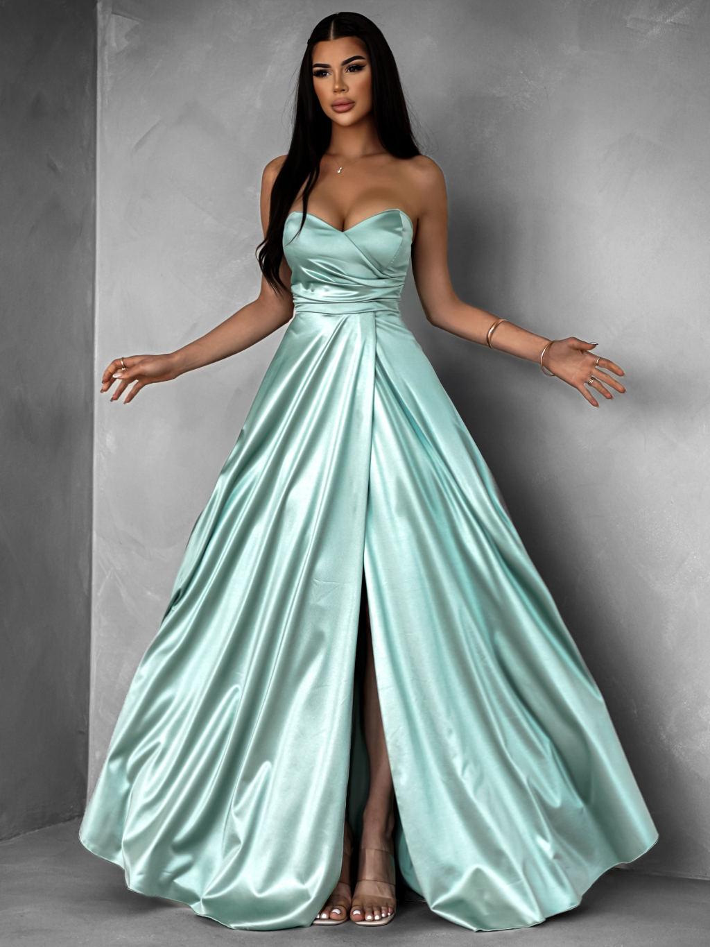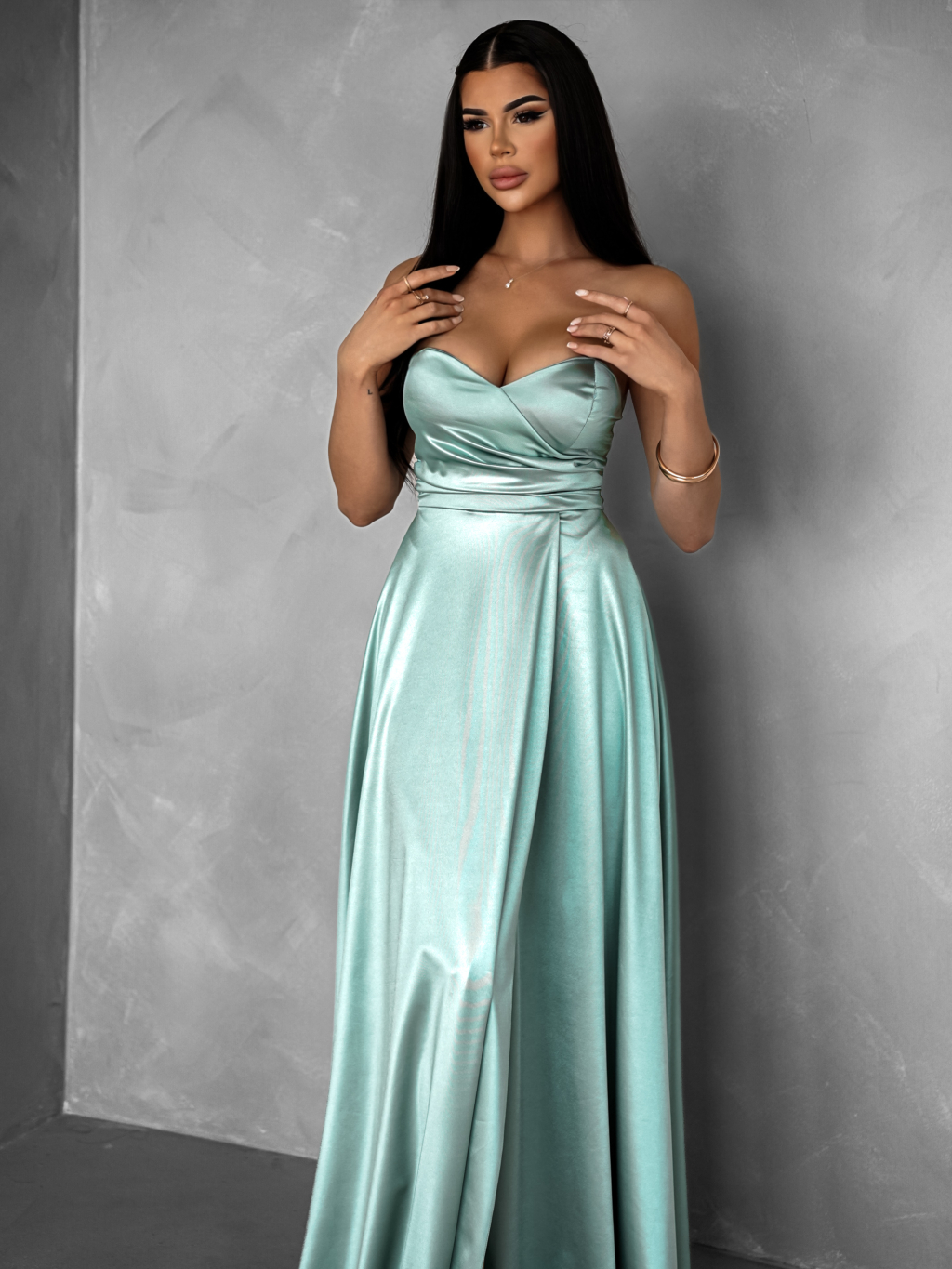 Dopřejte si jedinečný vzhled v saténových společenských šatech, které podtrhnou vaši ženskost a šarm. Šaty mají smyslný střih bez ramínek, jemné řasení v oblasti pasu a výrazný rozparek, který dodává outfitu odvážný i sofistikovaný nádech. Lehký saténový materiál krásně splývá, pohodlně se nosí a působí luxusně. Skvěle se hodí na plesy, večerní akce, svatby či jiné slavnostní příležitosti.