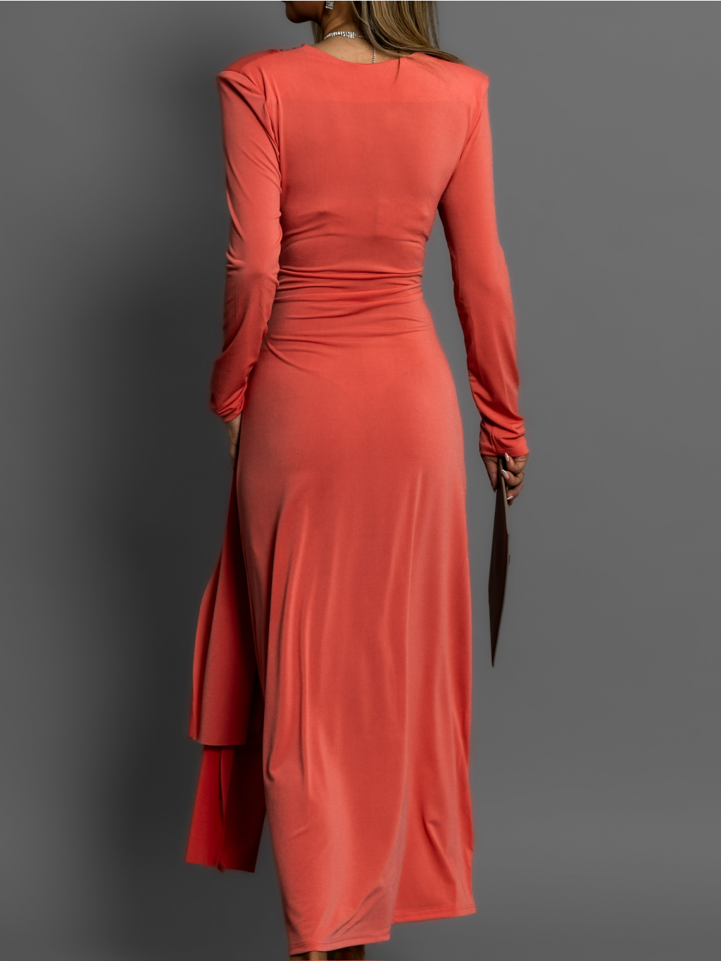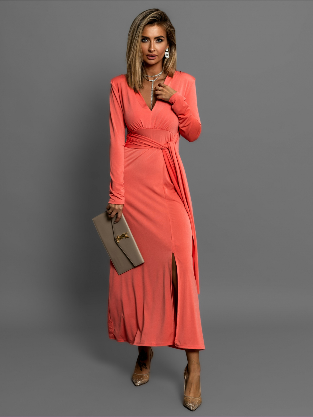 Korálové šaty BOTTOM na zavázání s dlouhým rukávem