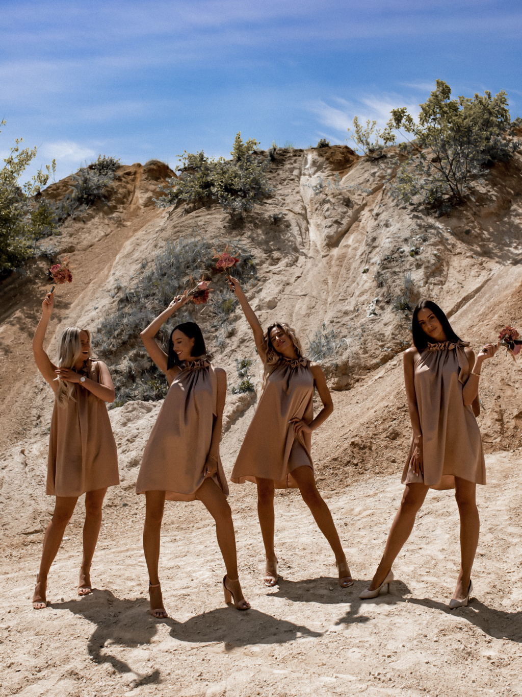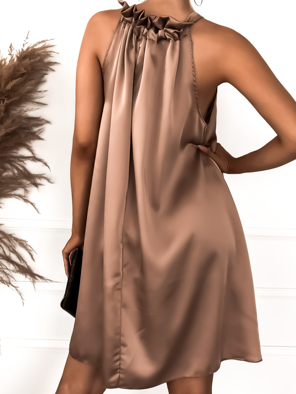 Hnědé lesklé šaty FUENTE s vázáním kolem krku