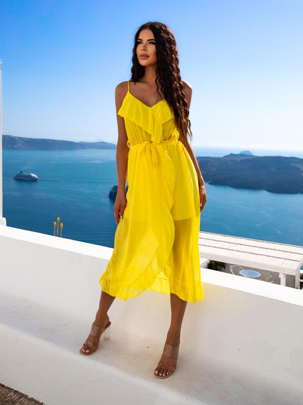 Tmavě žluté volánkové šaty RHEA na ramínka