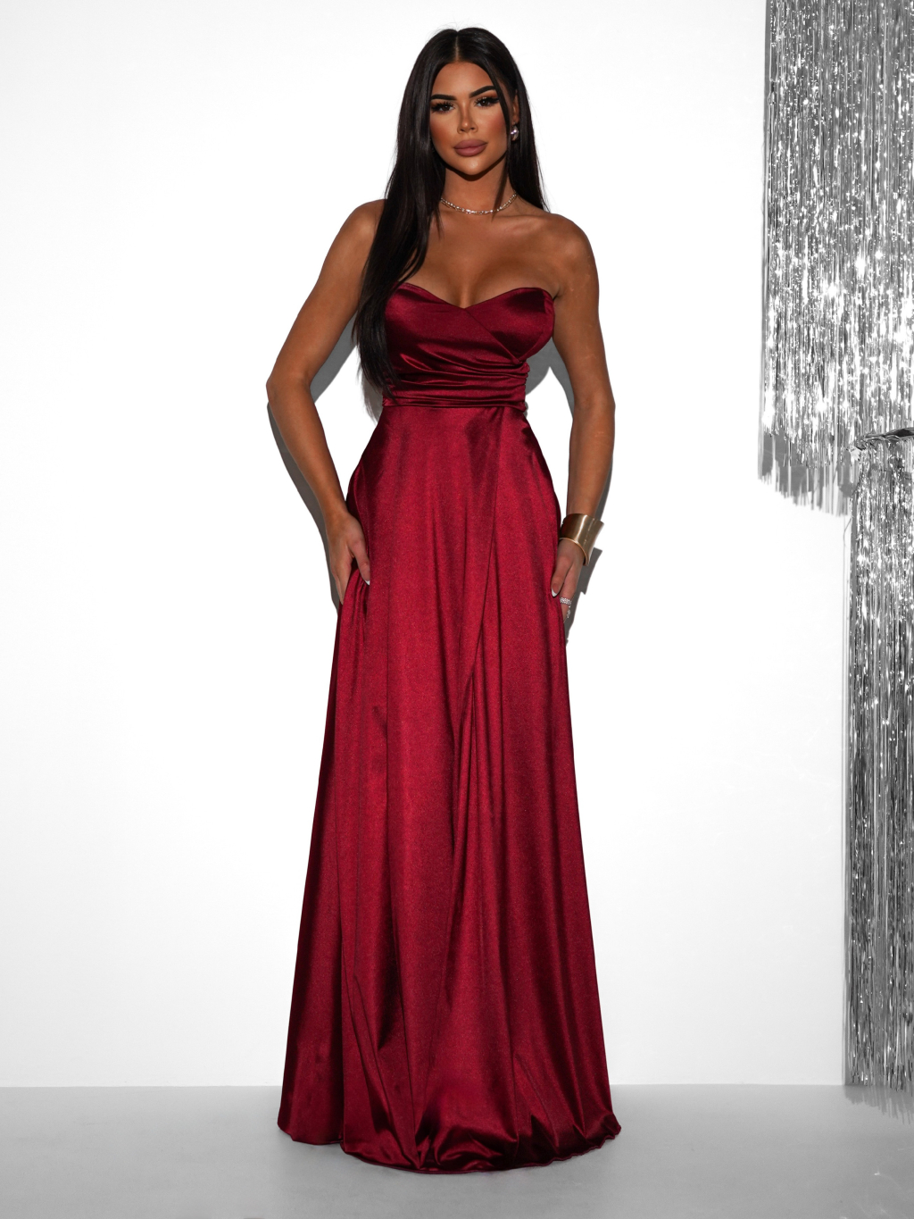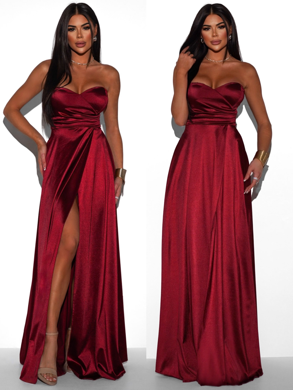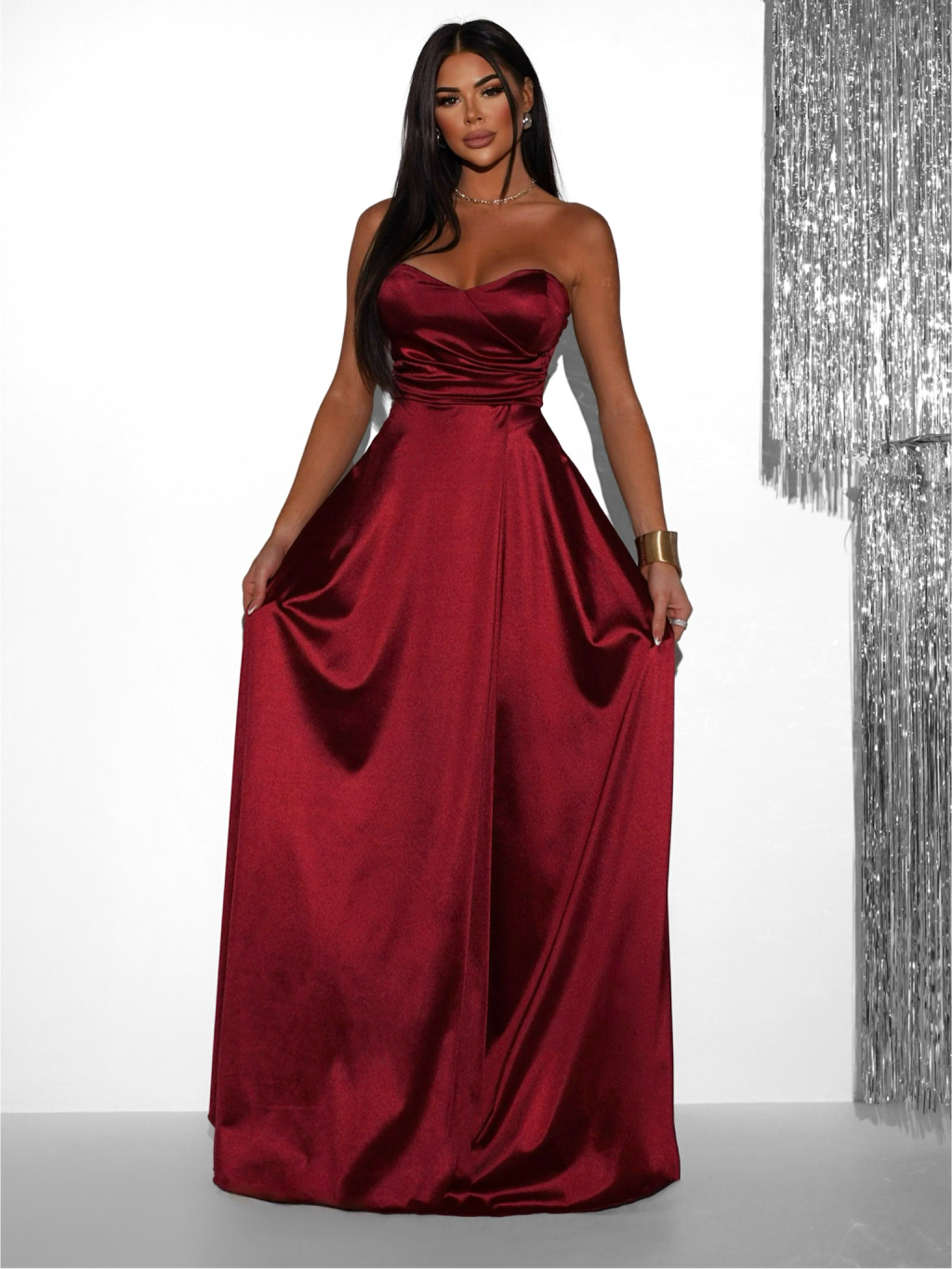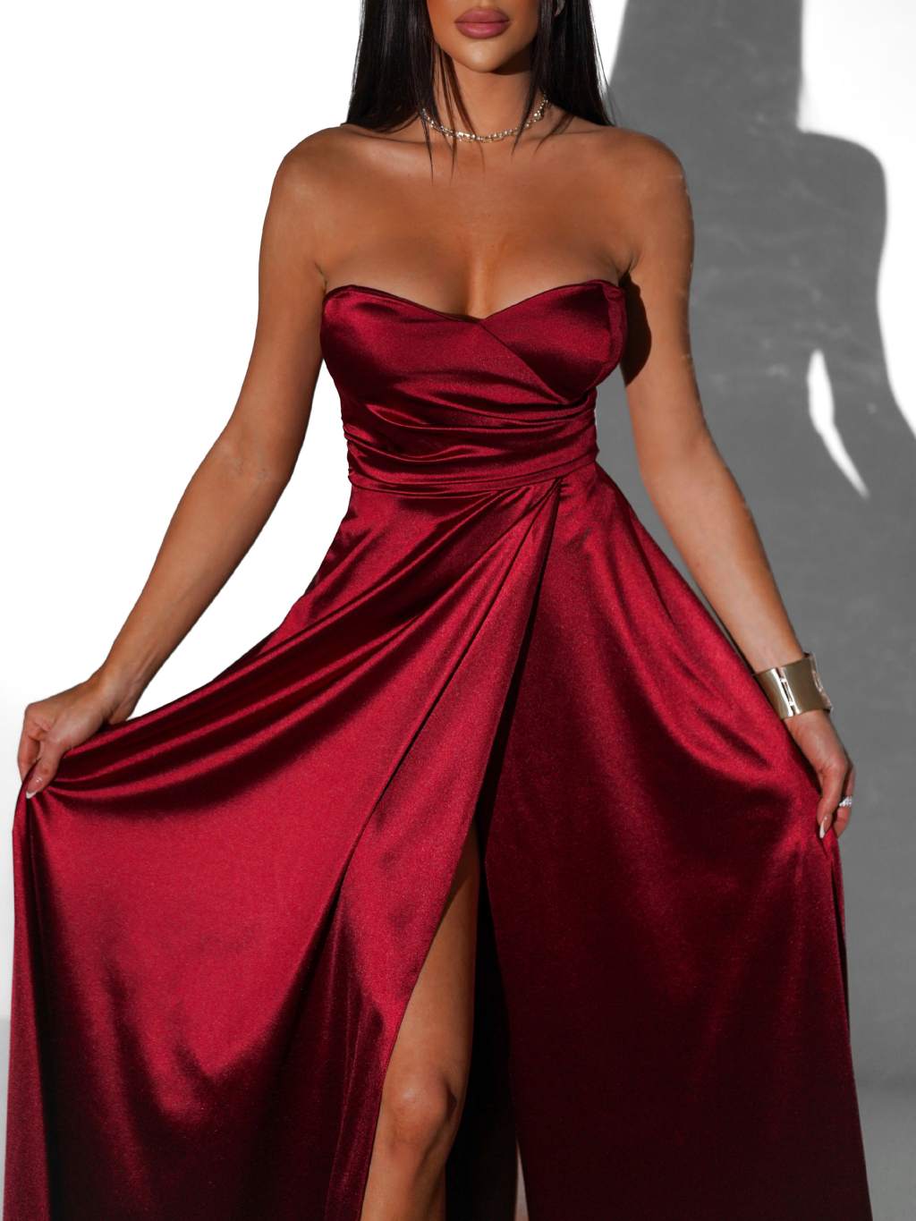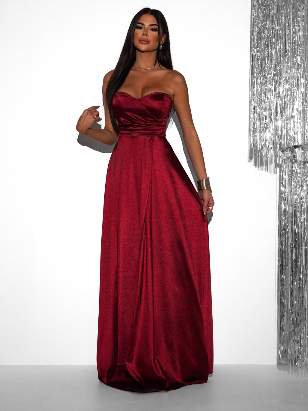 Dopřejte si jedinečný vzhled v saténových společenských šatech, které podtrhnou vaši ženskost a šarm. Šaty mají smyslný střih bez ramínek, jemné řasení v oblasti pasu a výrazný rozparek, který dodává outfitu odvážný i sofistikovaný nádech. Lehký saténový materiál krásně splývá, pohodlně se nosí a působí luxusně. Skvěle se hodí na plesy, večerní akce, svatby či jiné slavnostní příležitosti.