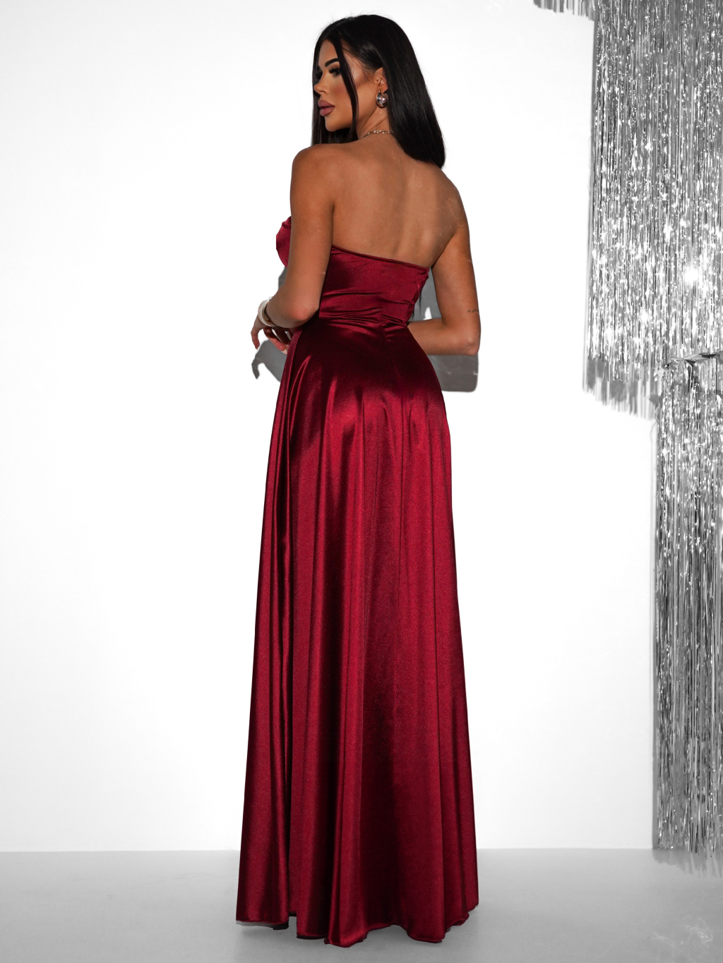 Vínové plesové saténové šaty SYCHAEUS bez ramínek