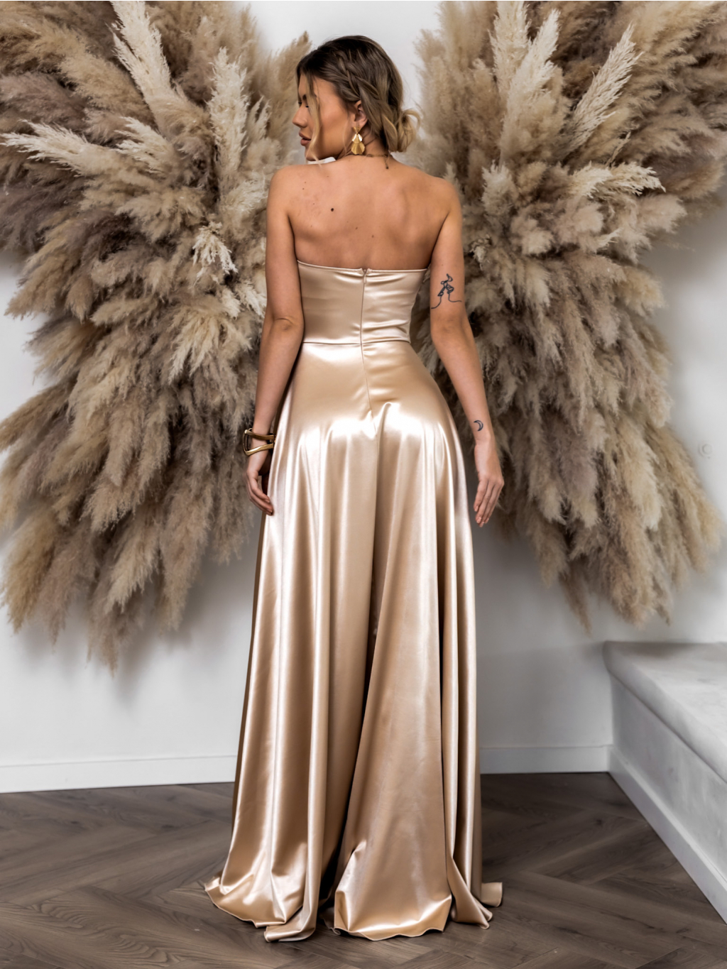 Dopřejte si jedinečný vzhled v saténových společenských šatech, které podtrhnou vaši ženskost a šarm. Šaty mají smyslný střih bez ramínek, jemné řasení v oblasti pasu a výrazný rozparek, který dodává outfitu odvážný i sofistikovaný nádech. Lehký saténový materiál krásně splývá, pohodlně se nosí a působí luxusně. Skvěle se hodí na plesy, večerní akce, svatby či jiné slavnostní příležitosti.