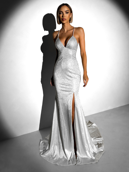 Stříbrné plesové dlouhé třpytivé šaty ELUREYA s rozparkem