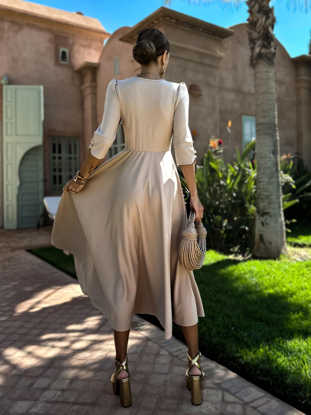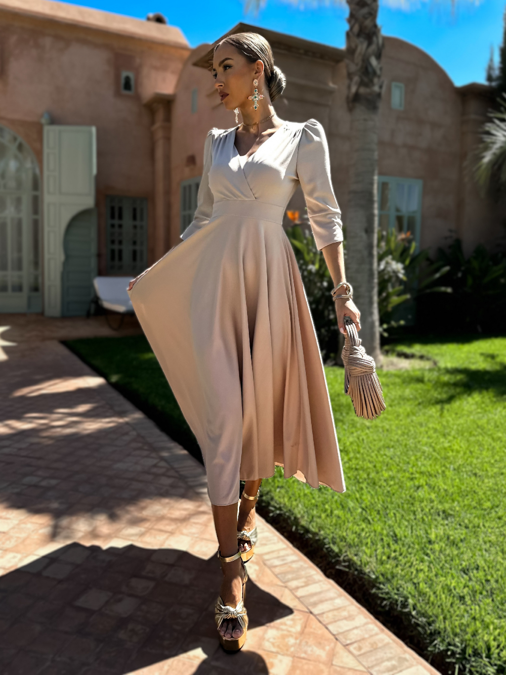 Béžové dlouhé áčkové šaty LAPATA s výstřihem