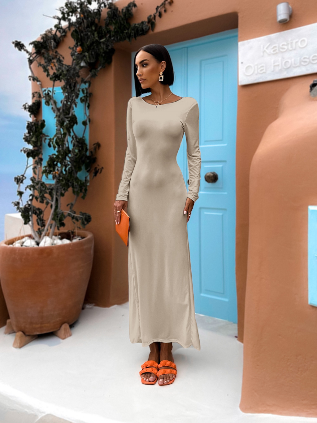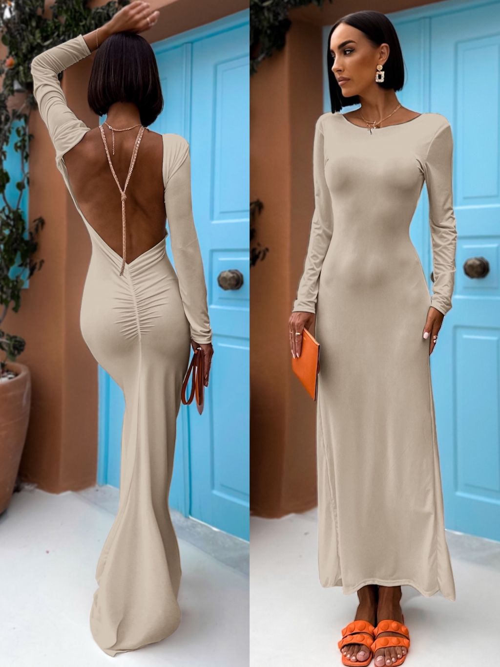 Béžové dlouhé elegantní šaty NINTENI s průstřihem na zádech