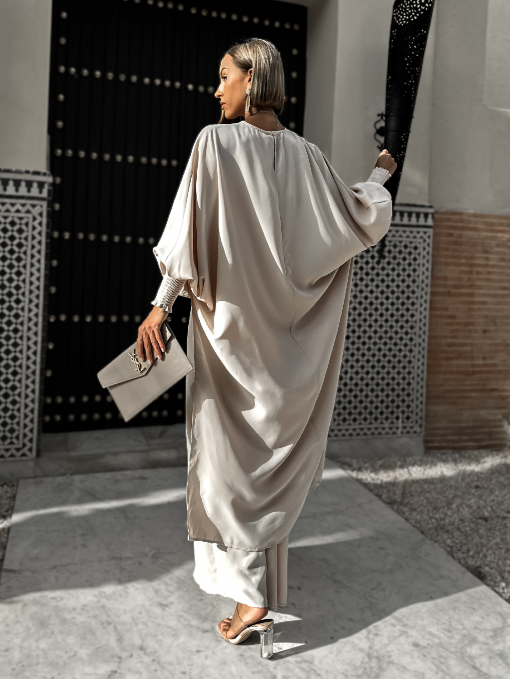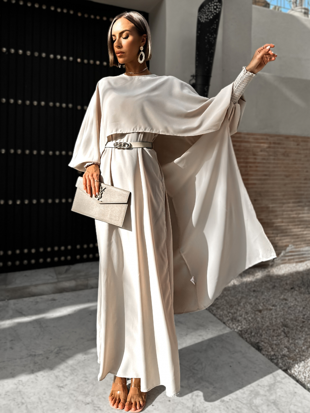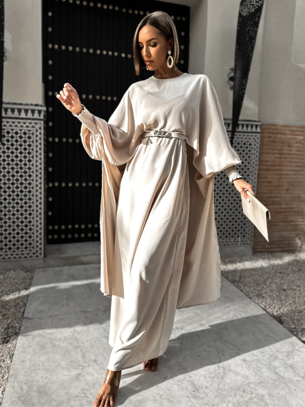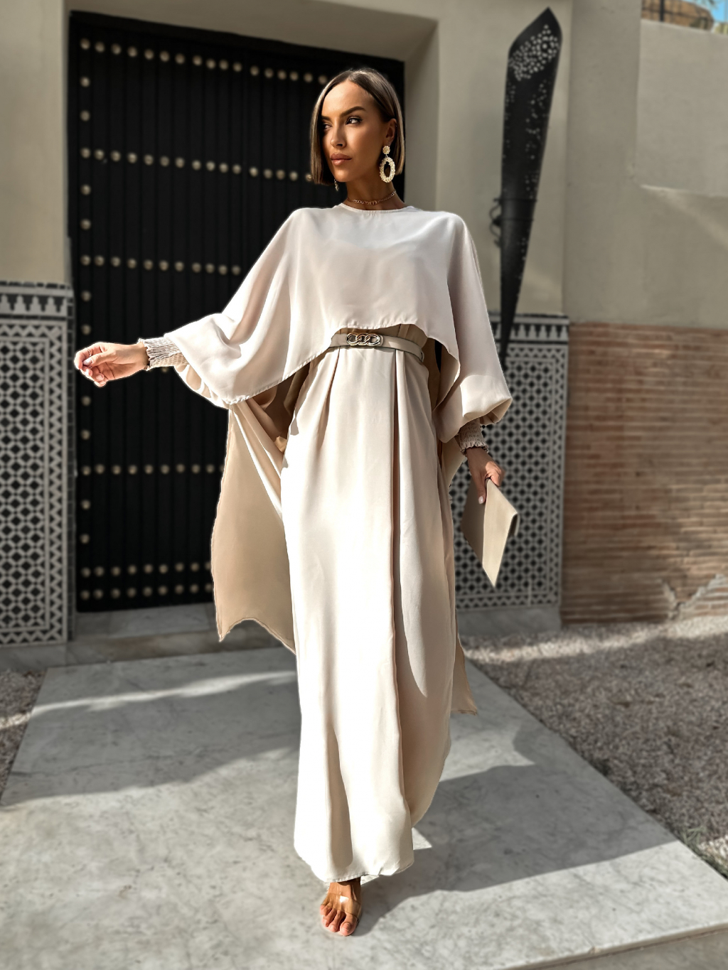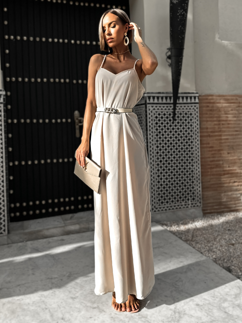 Béžové dlouhé maxi šaty oversize JAYLE s páskem