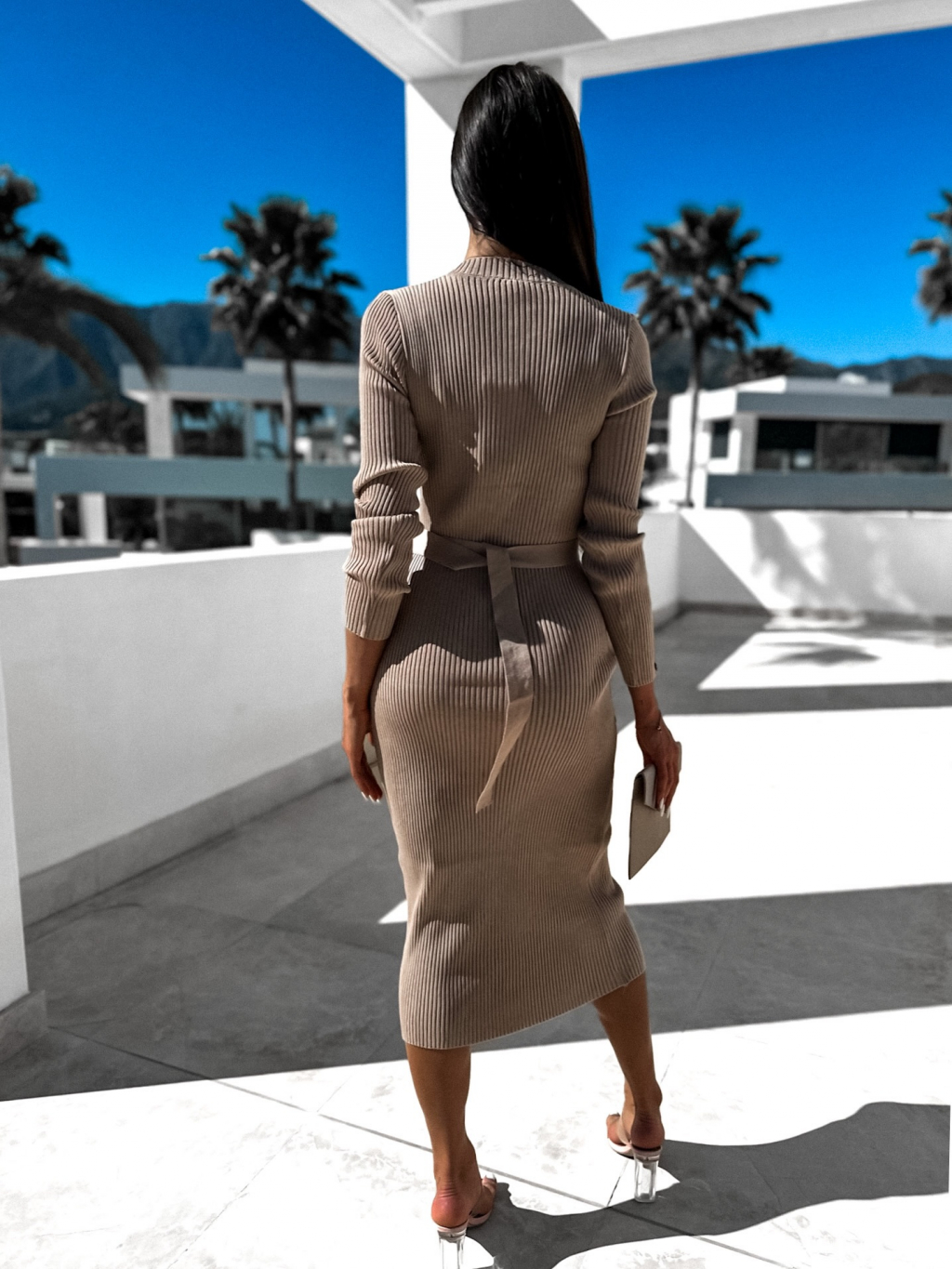 Béžové elegantní svetrové šaty JANUSEN na zavazování