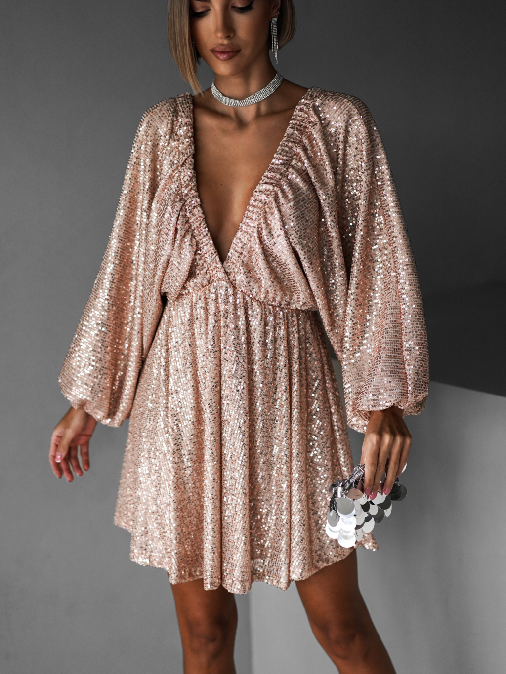 Béžové krátké flitrované šaty BERRON s výstřihem