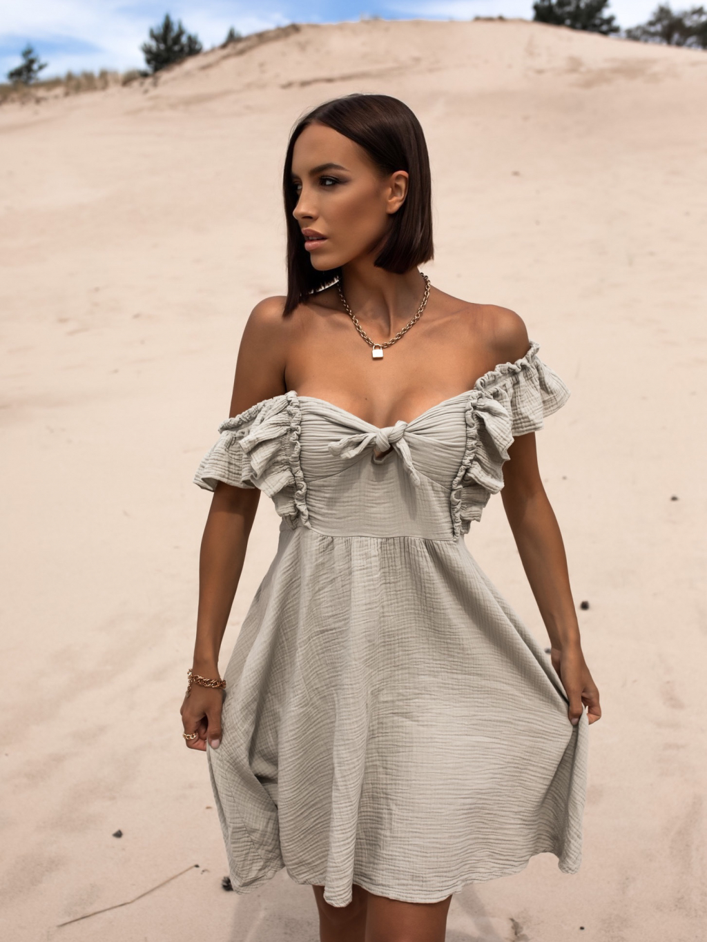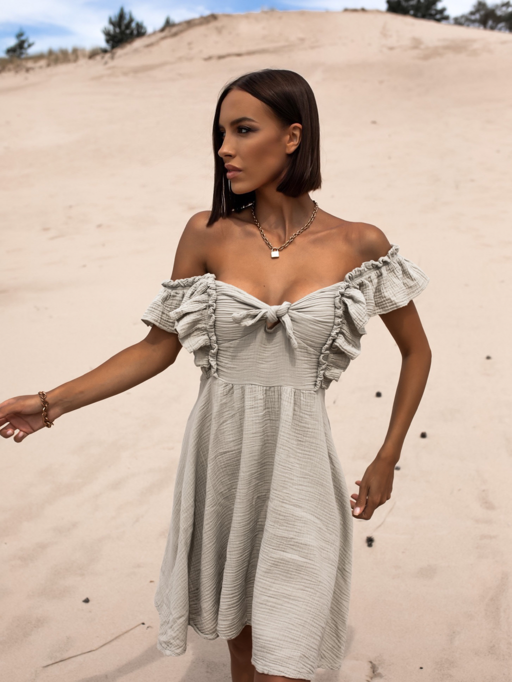 Béžové kratší šaty RUFFLE s volánkovými rukávy