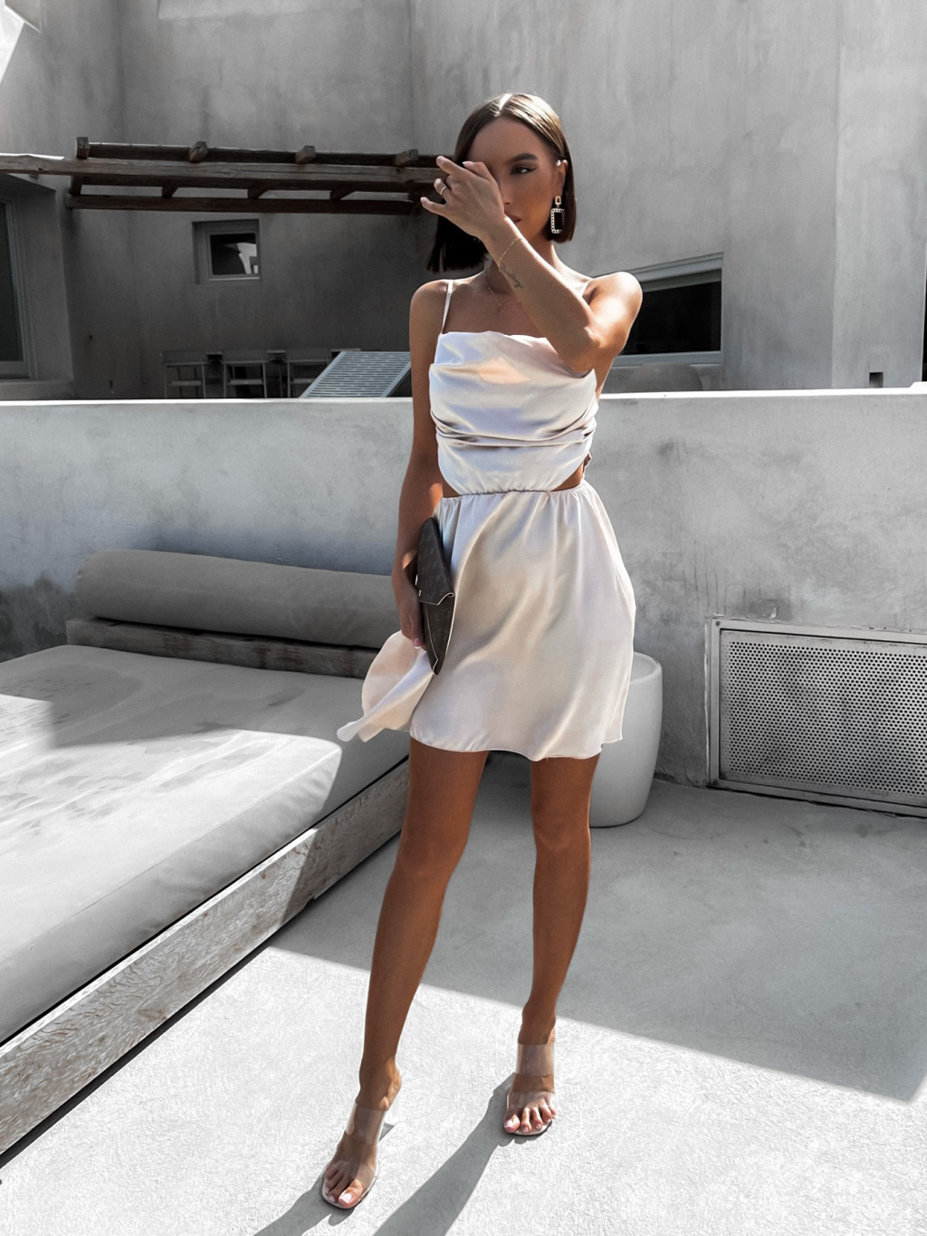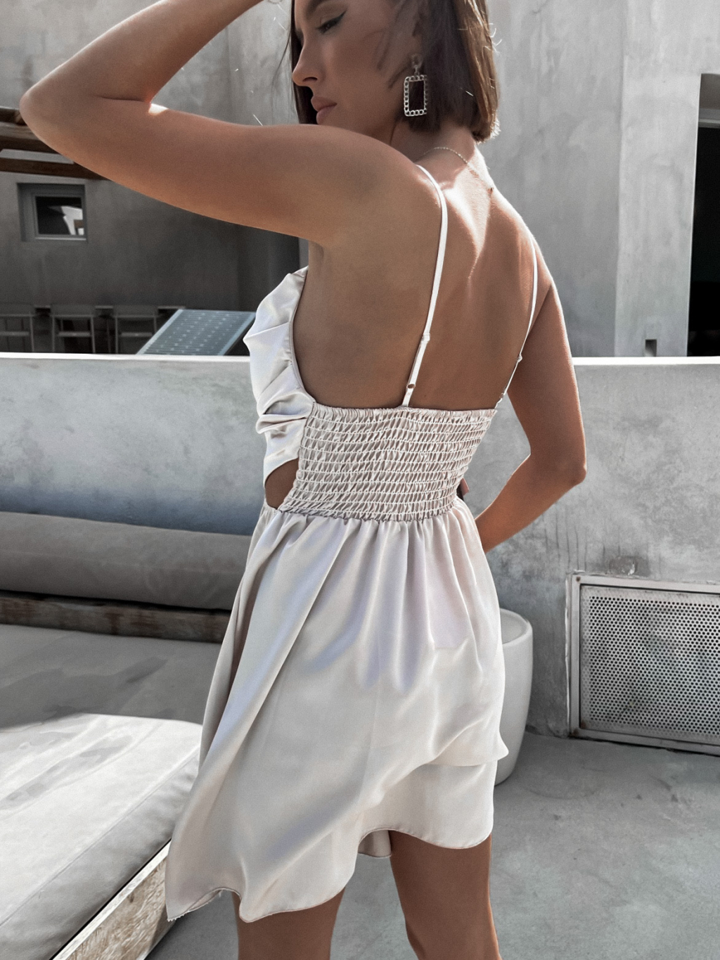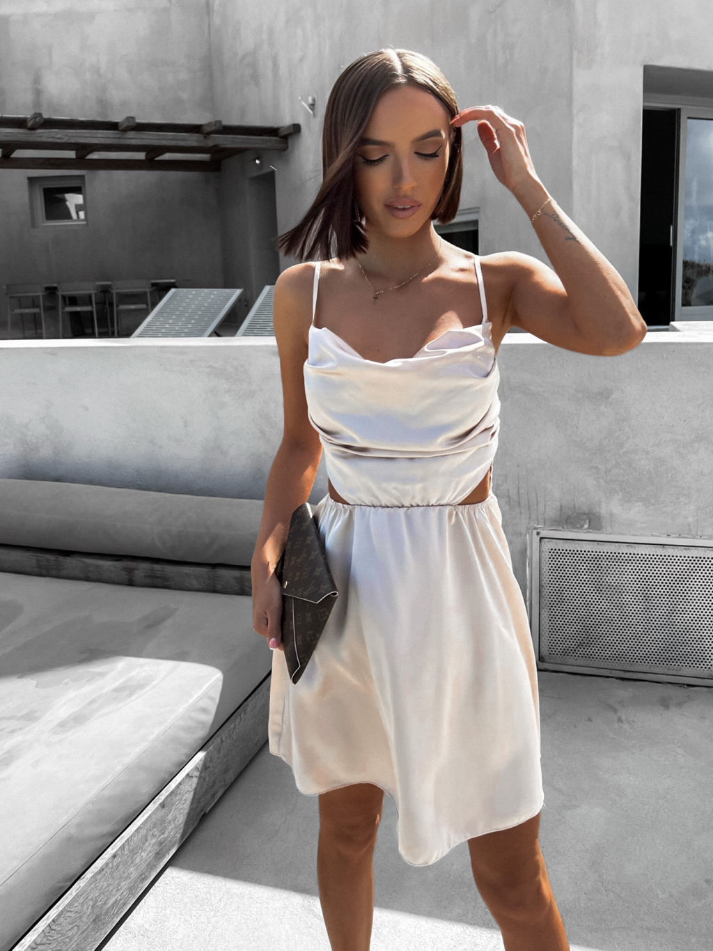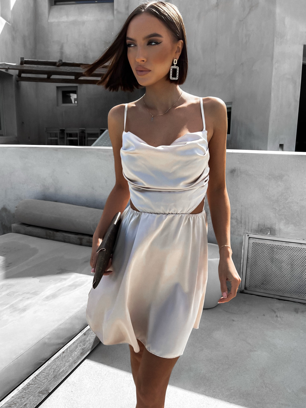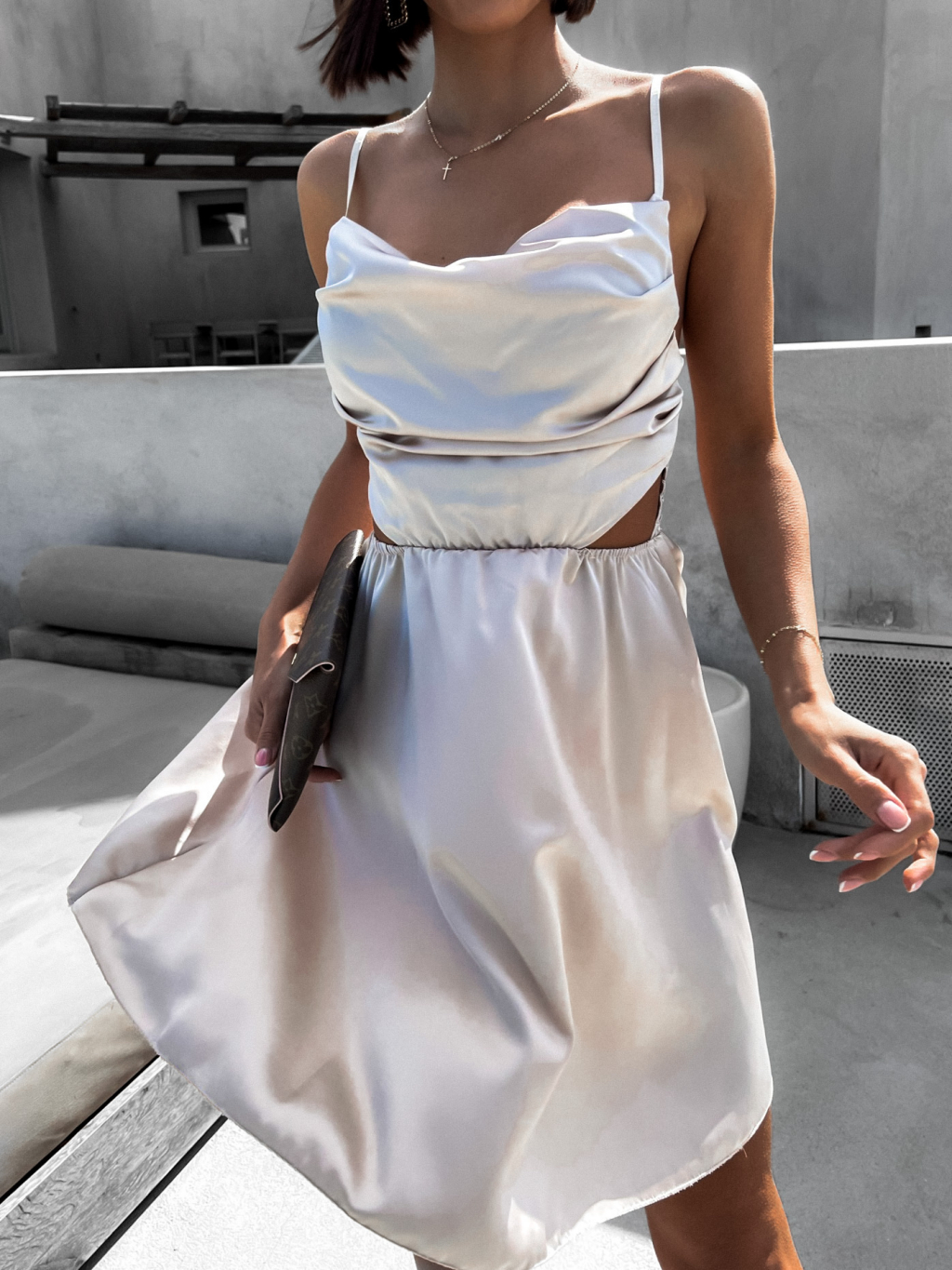 Béžové lesklé elegantní šaty JEWELRY s průstřihy