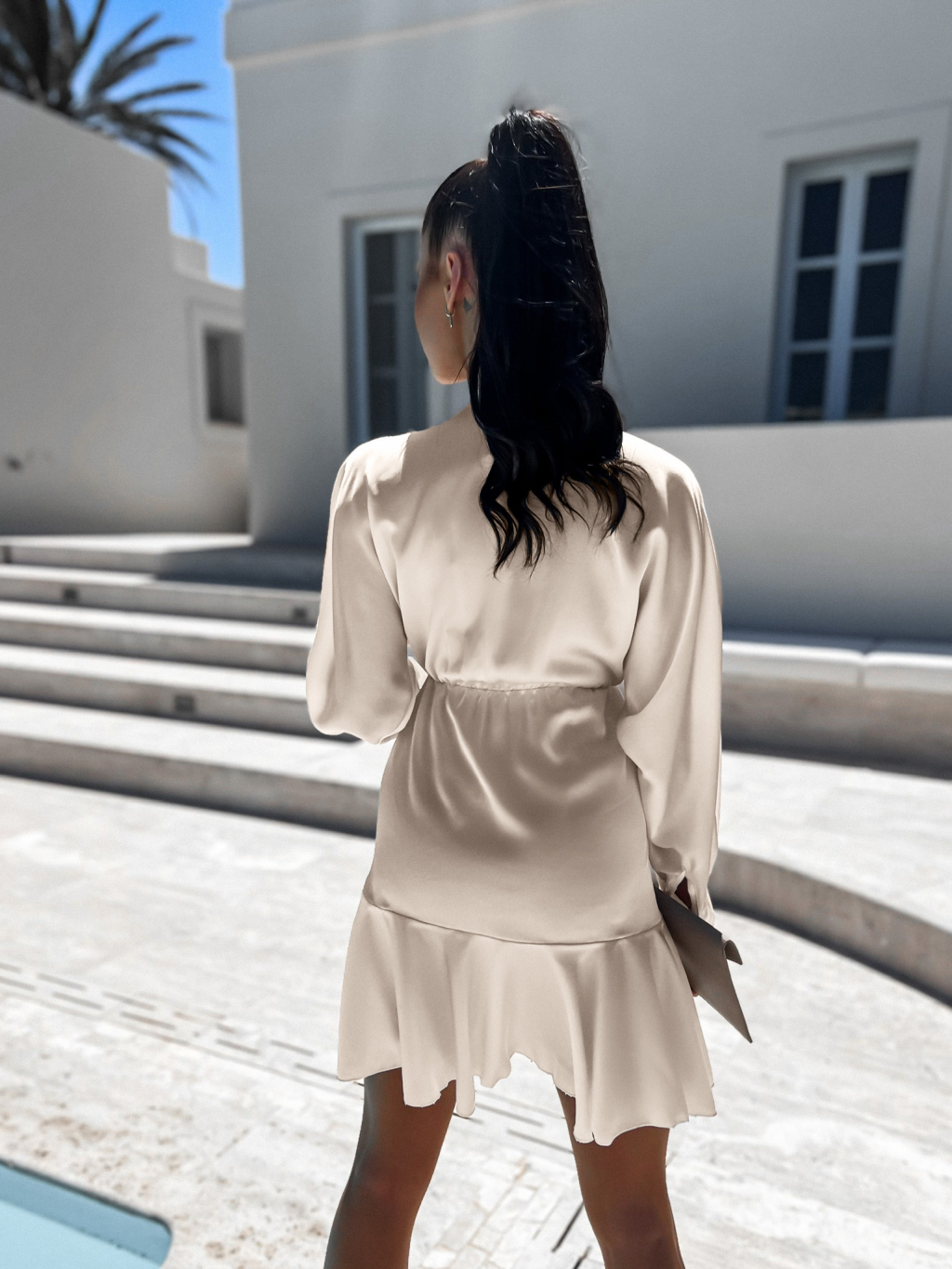 Béžové lesklé elegantní šaty POPPY s výstřihem do V