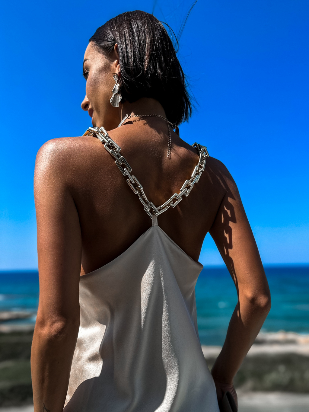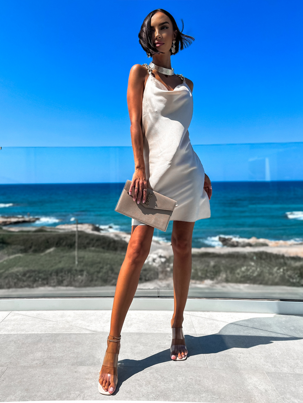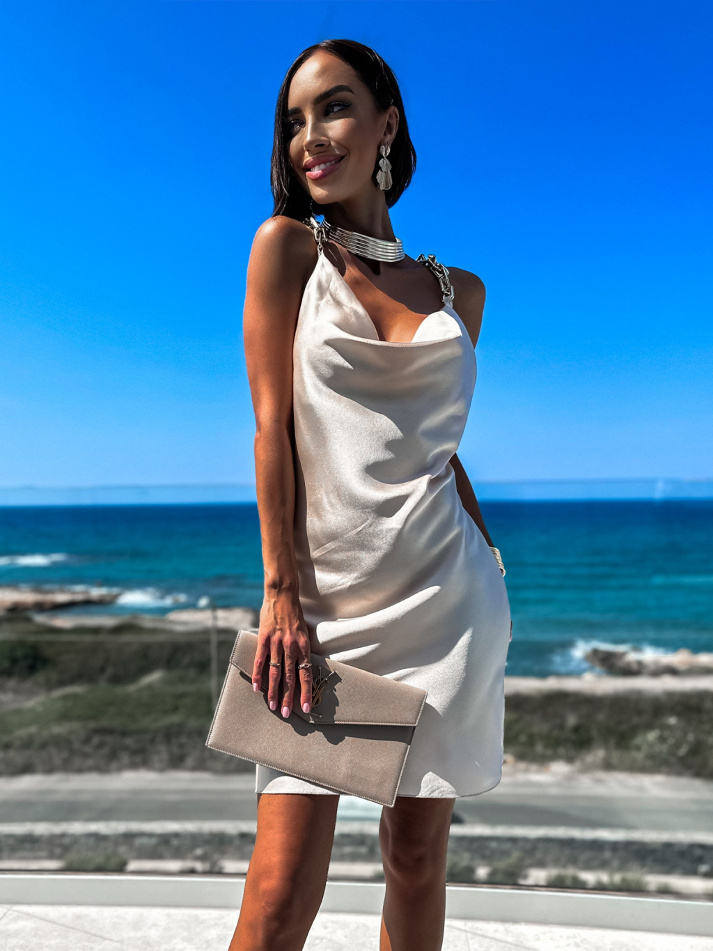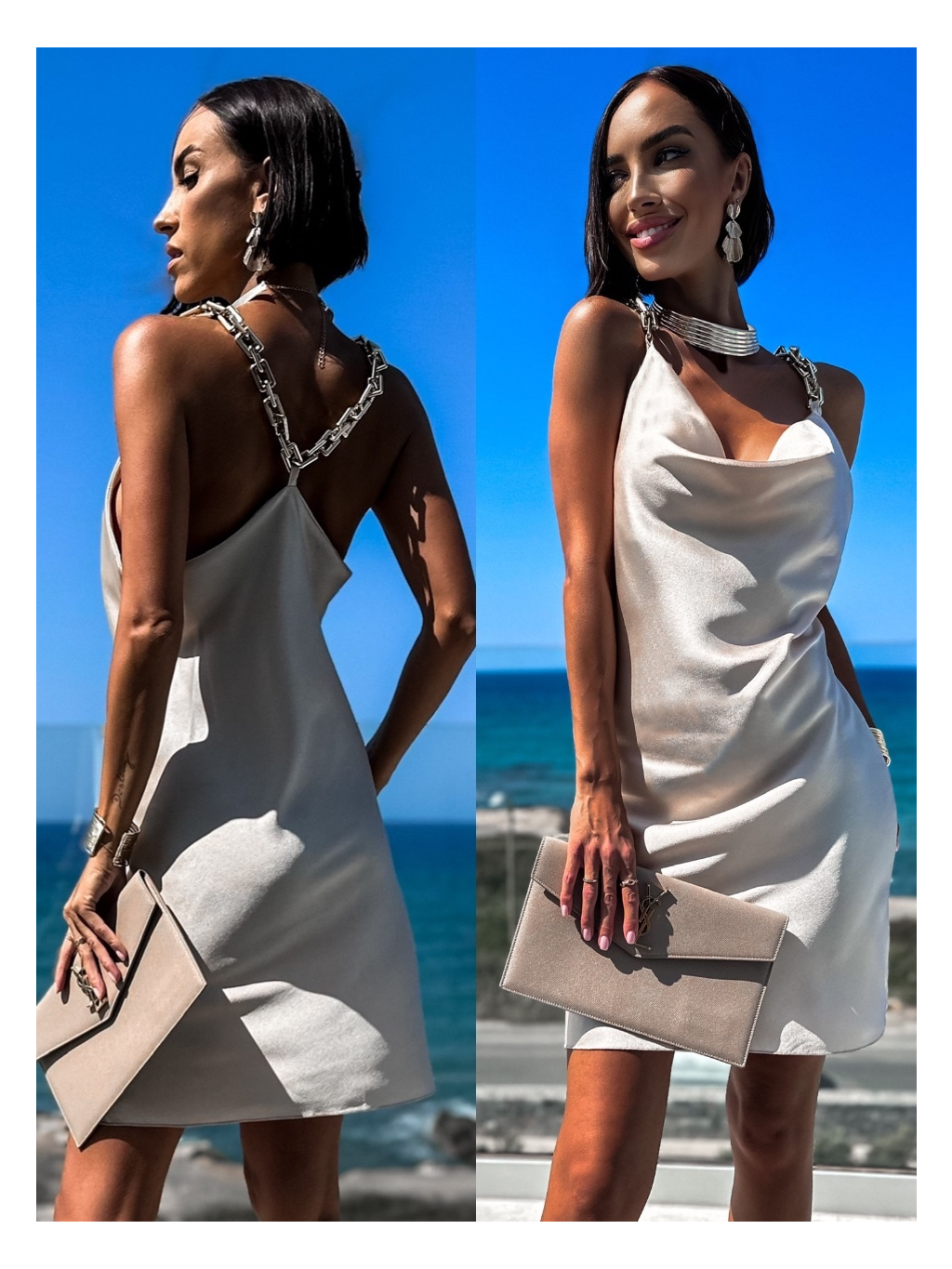 Béžové lesklé šaty IRELY se zlatými řetízky