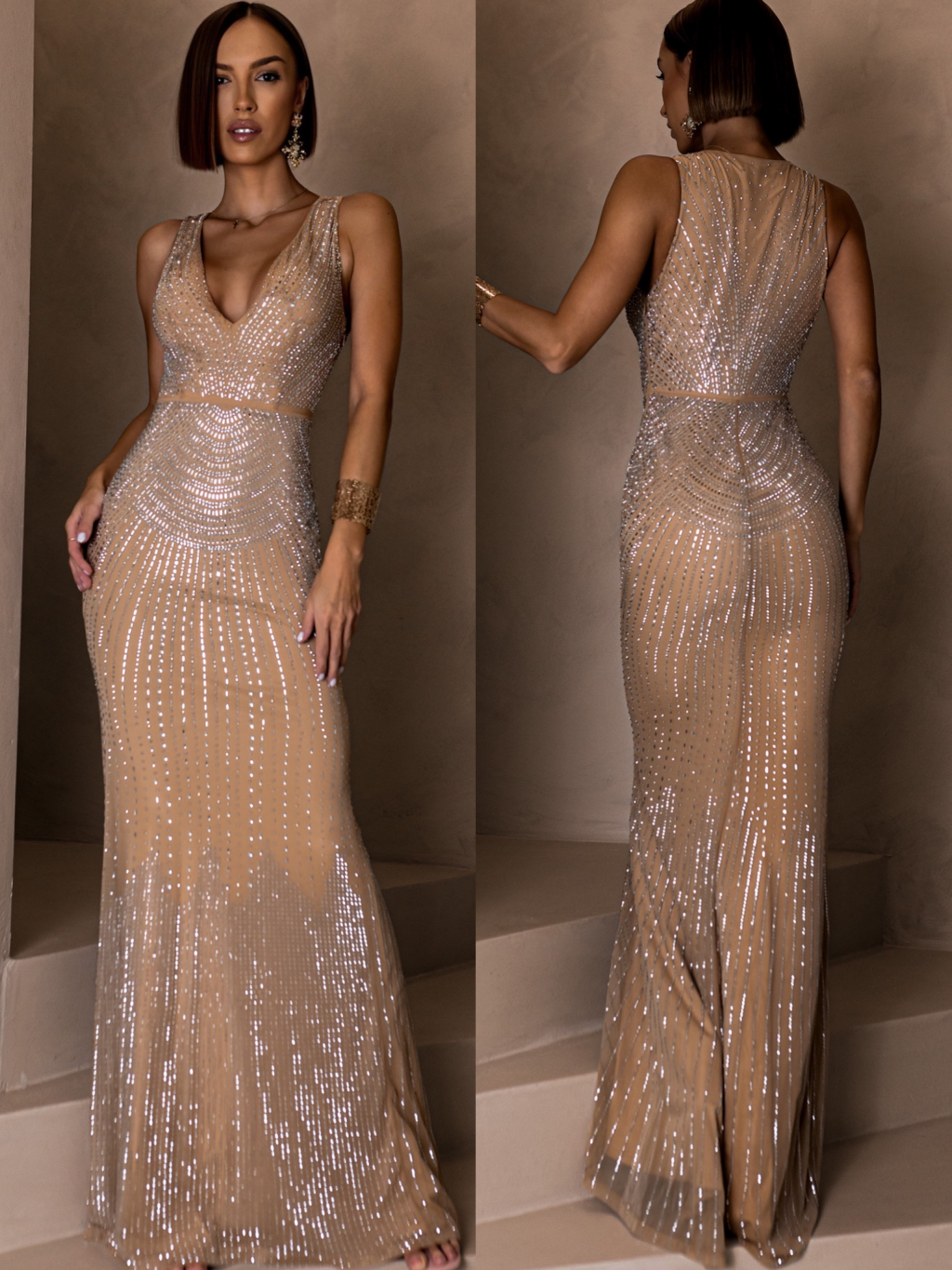 Béžové třpytivé večerní dlouhé šaty LOTFIT s kamínky
