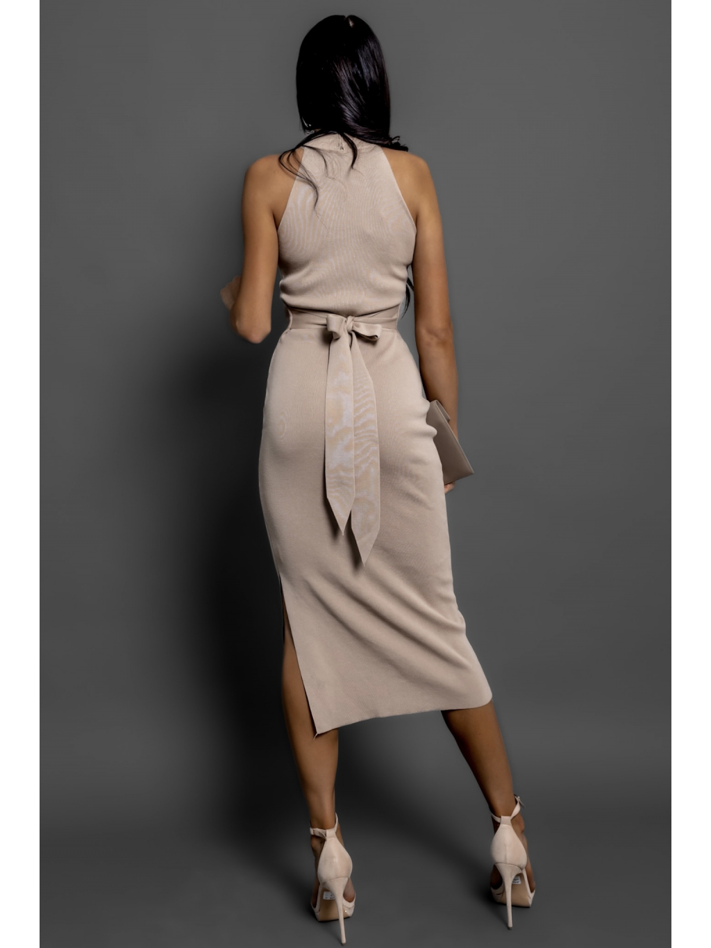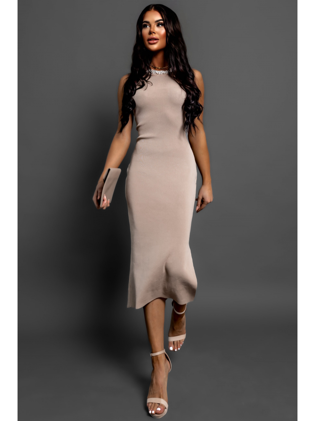 Béžové úpletové šaty KALANENI se zdobením u krku