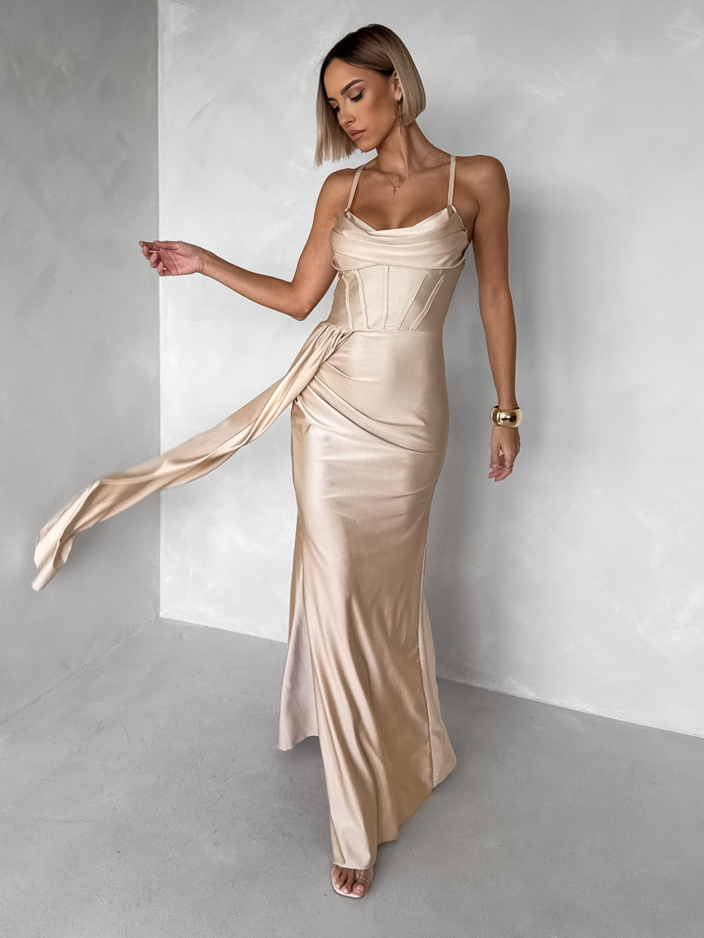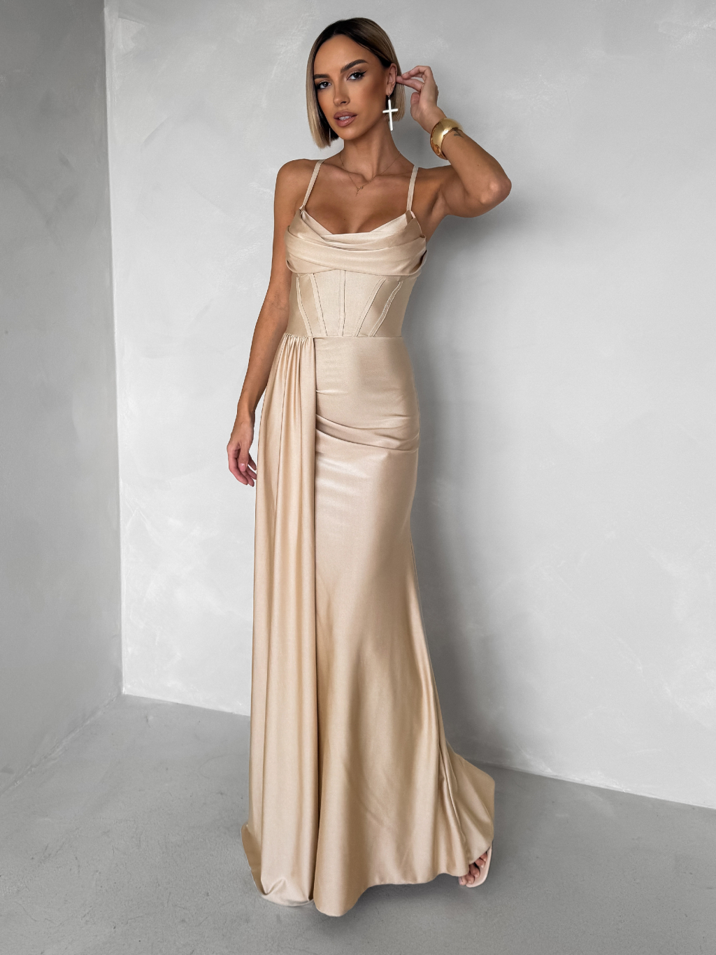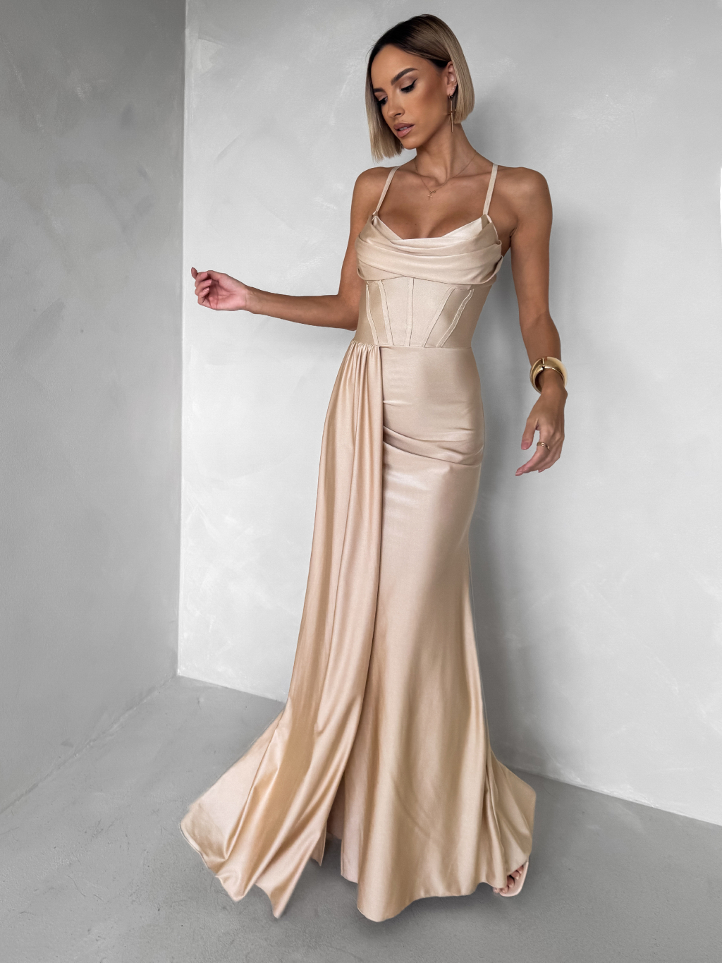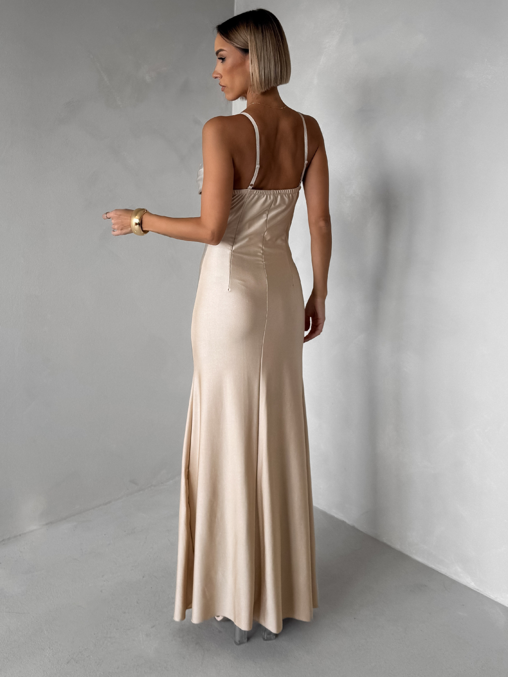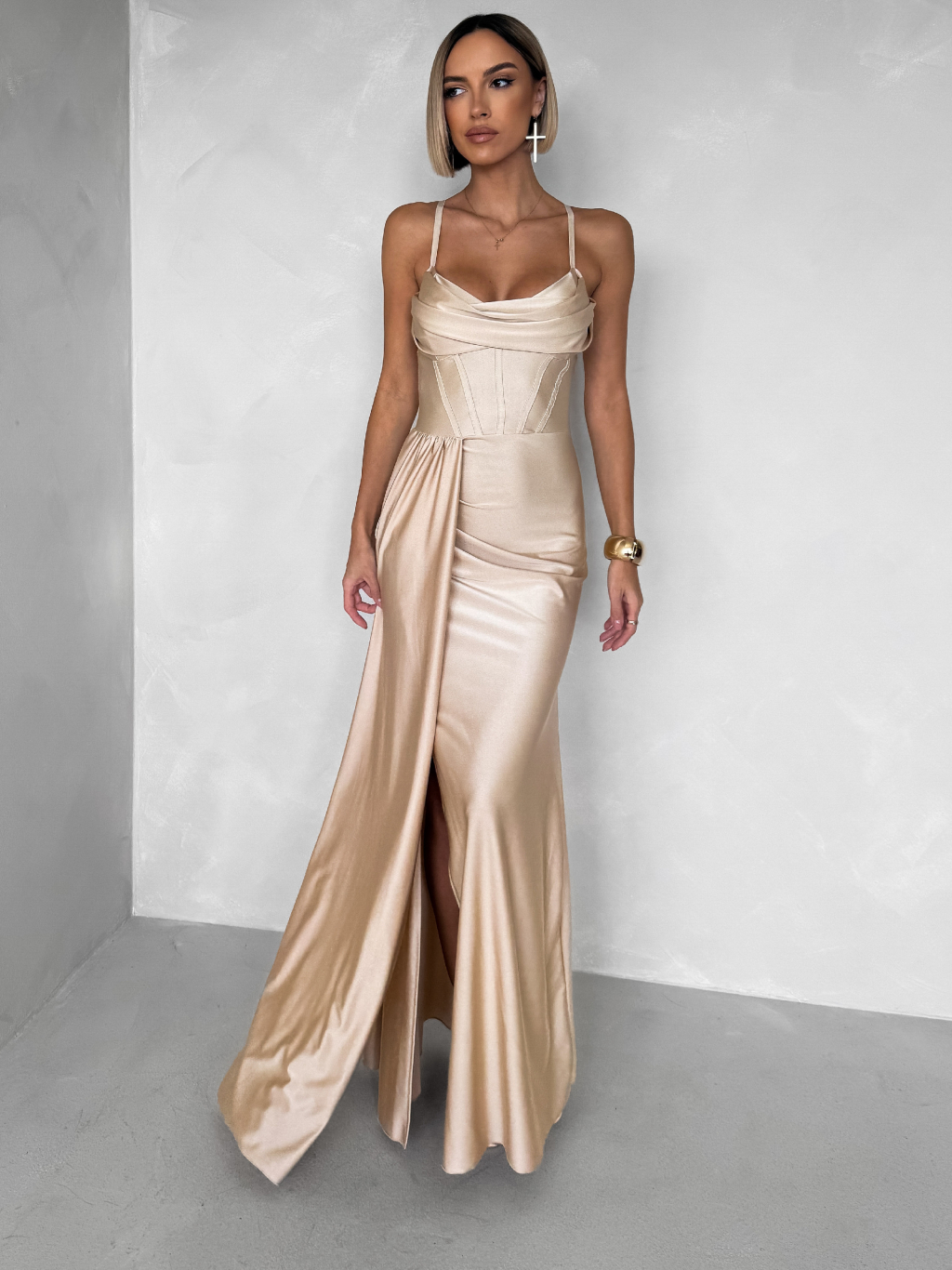 Béžové zlaté společenské dlouhé šaty SATIN s rozparkem