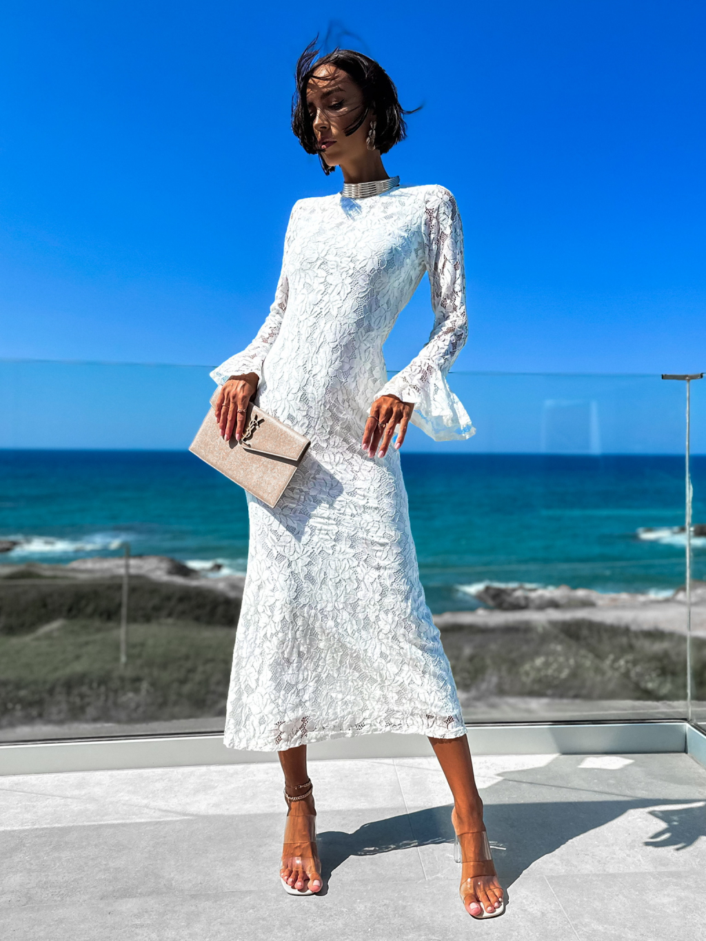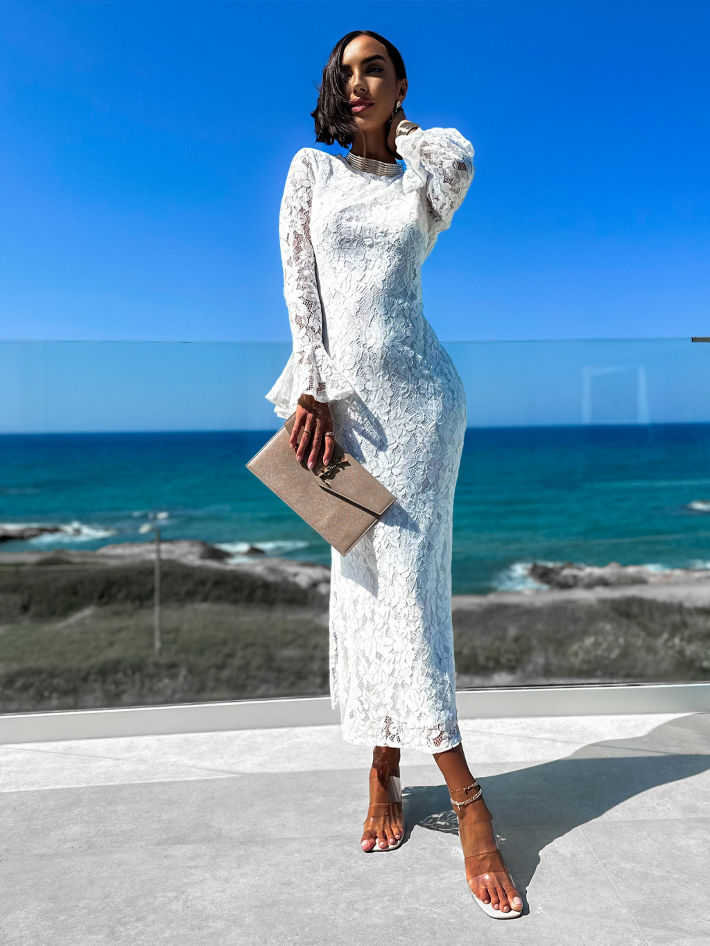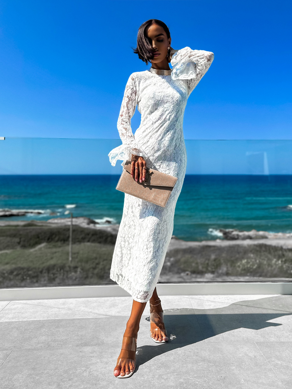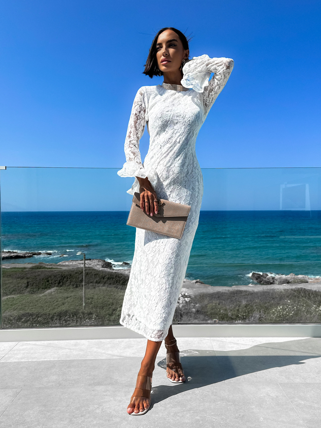 Bílé dlouhé krajkové šaty SAMULES s volánky