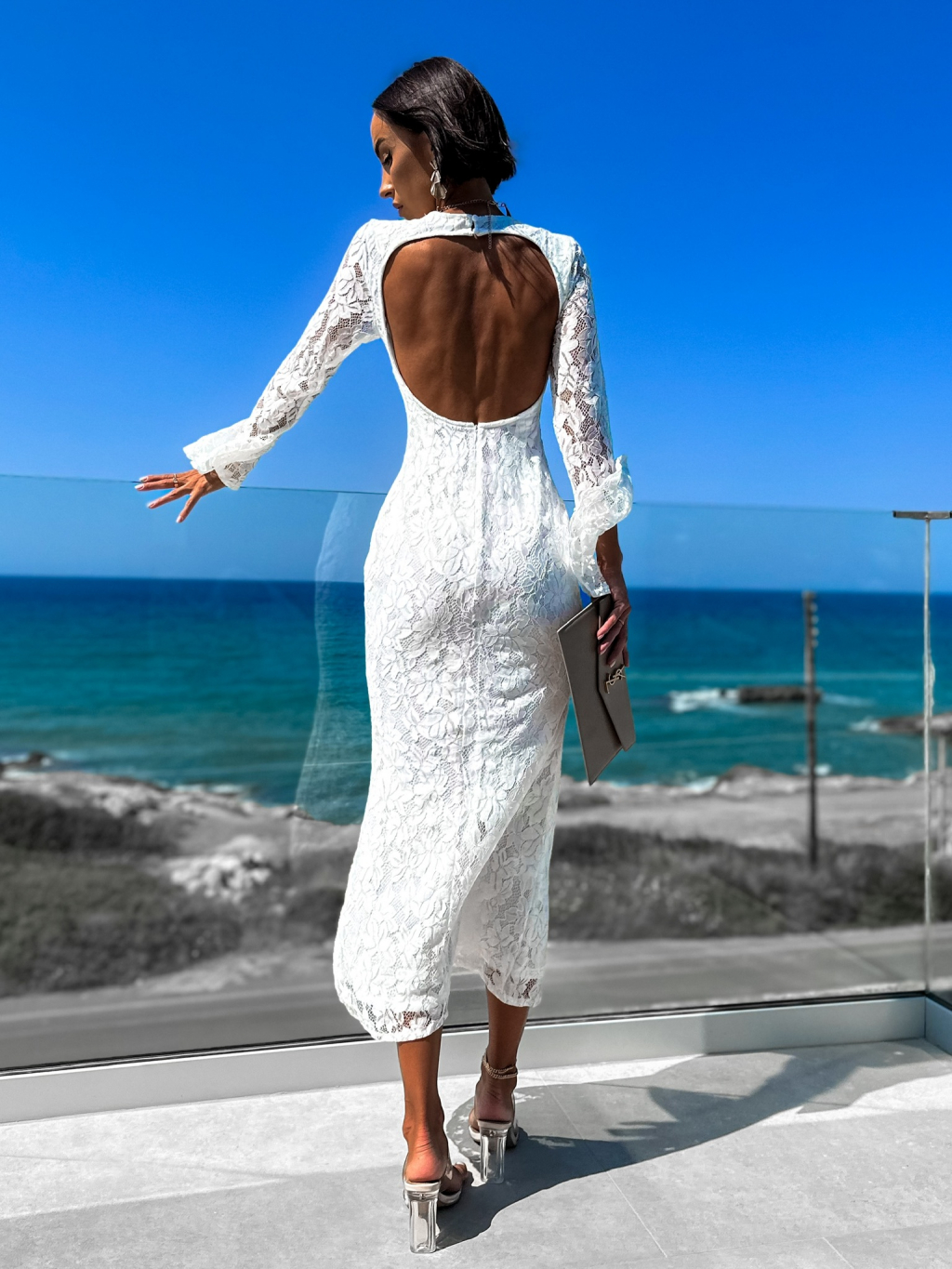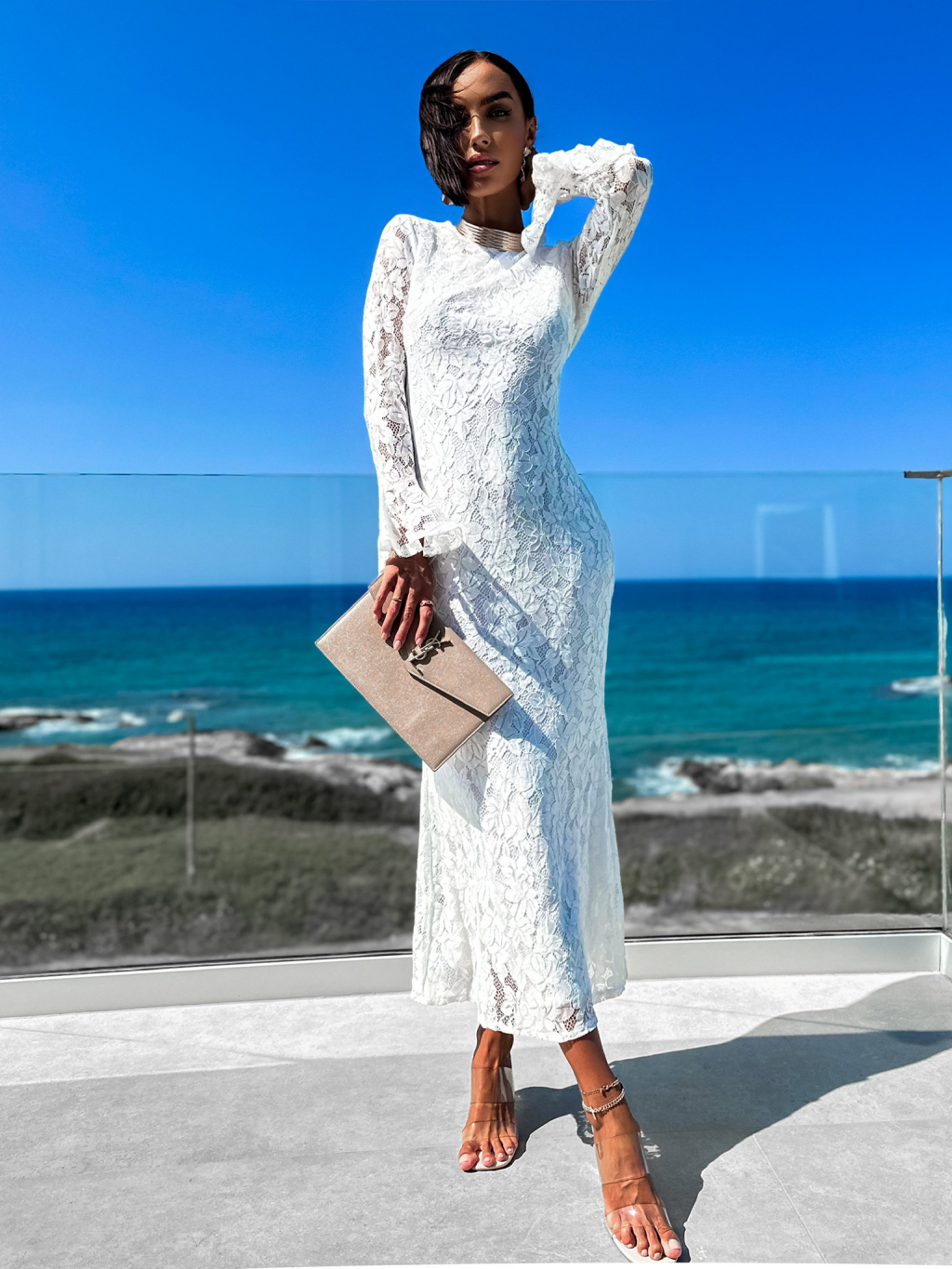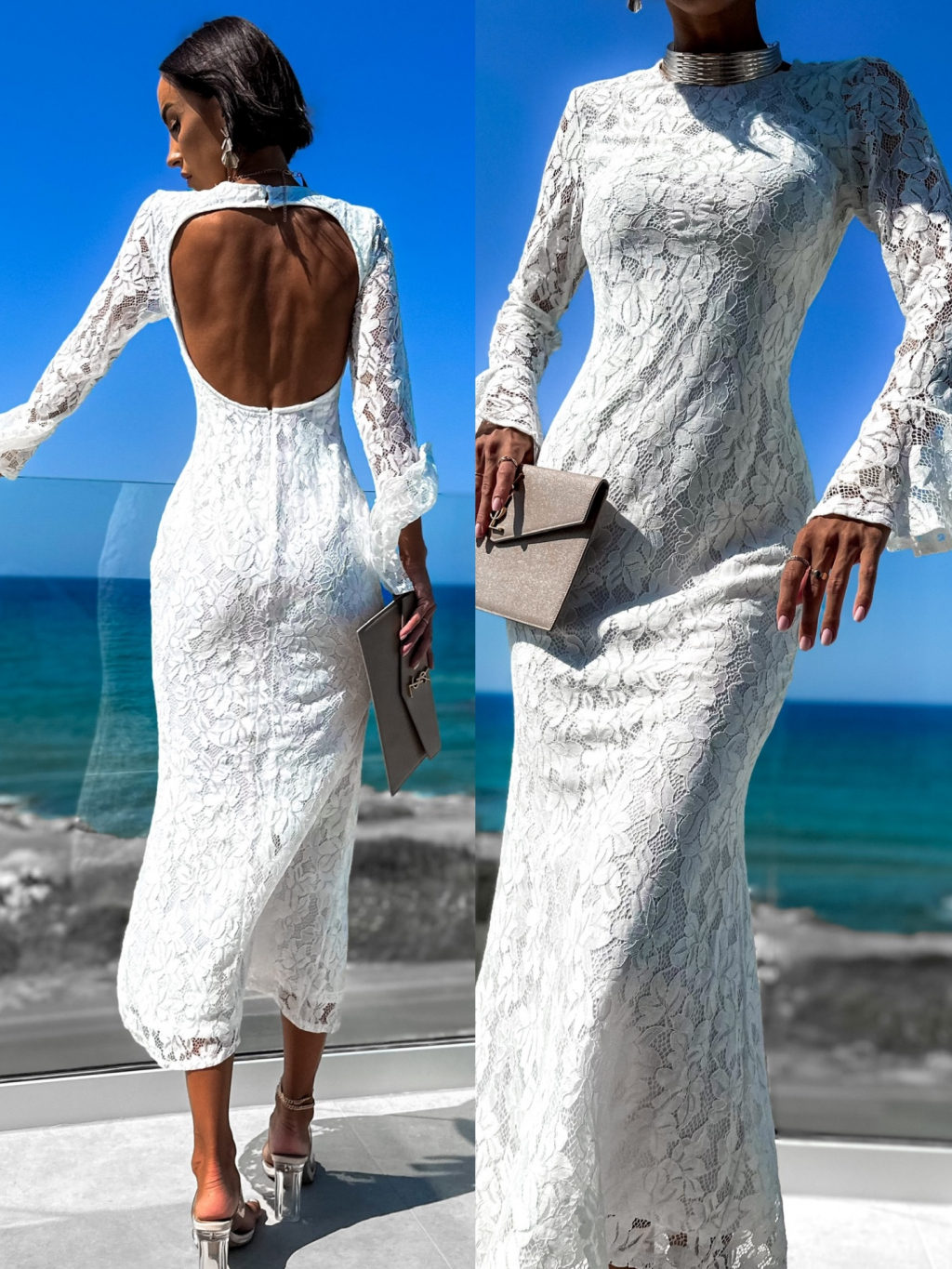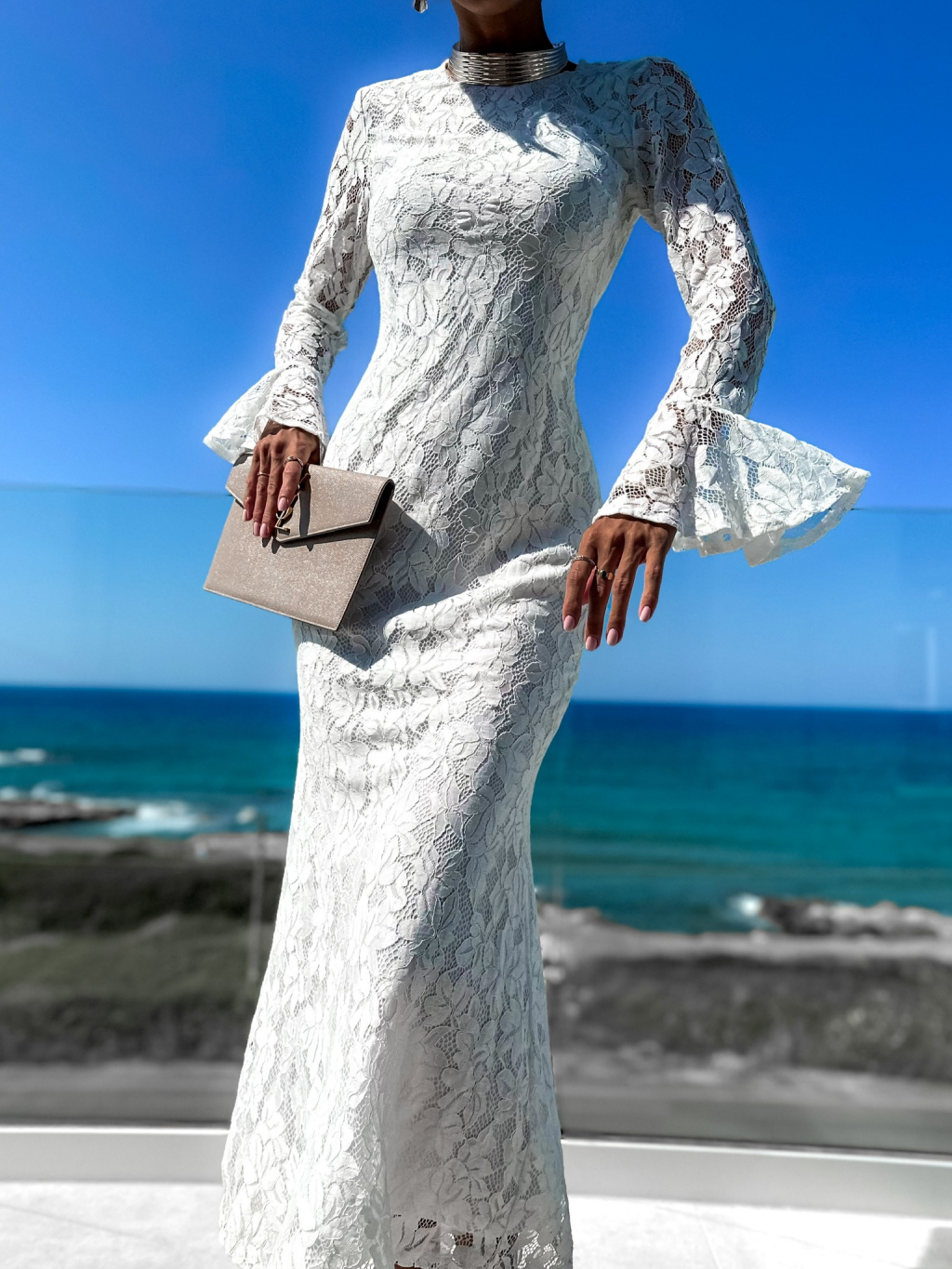 Bílé dlouhé krajkové šaty SAMULES s volánky