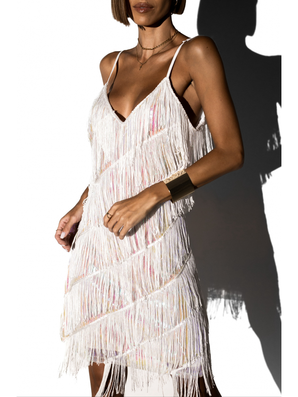 Bílé elegantní šaty PUTRI s flitry a třásněmi