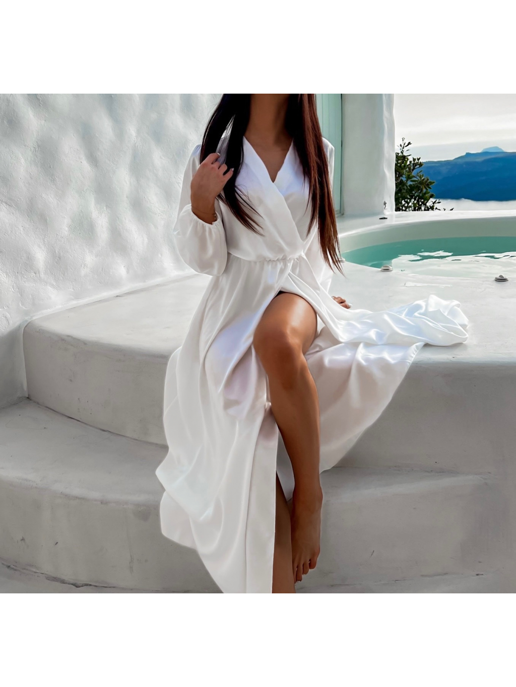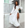 Elegantní saténové maxi šaty, které okouzlí svou lehkostí a ženskostí. Hladký lesklý materiál jemně splývá po postavě a vytváří luxusní efekt při každém kroku. Zavazování v pase krásně zvýrazní siluetu a dodá modelu sofistikovaný nádech. Výrazný rozparek na sukni působí svůdně a zároveň zajišťuje maximální pohodlí a volnost pohybu. Perfektní volba pro společenské události, večírky či slavnostní příležitosti.
