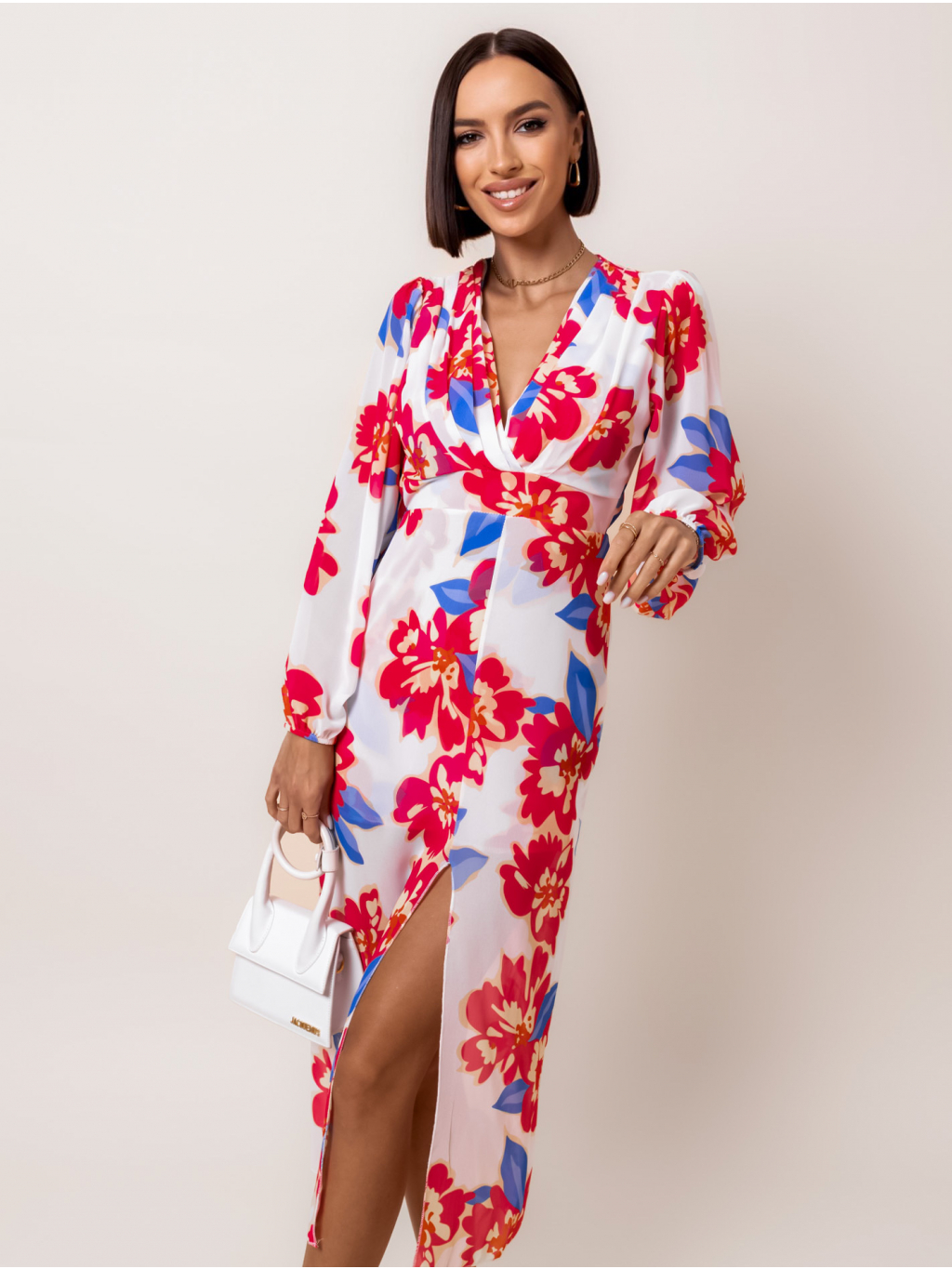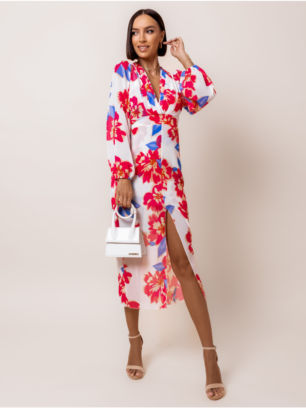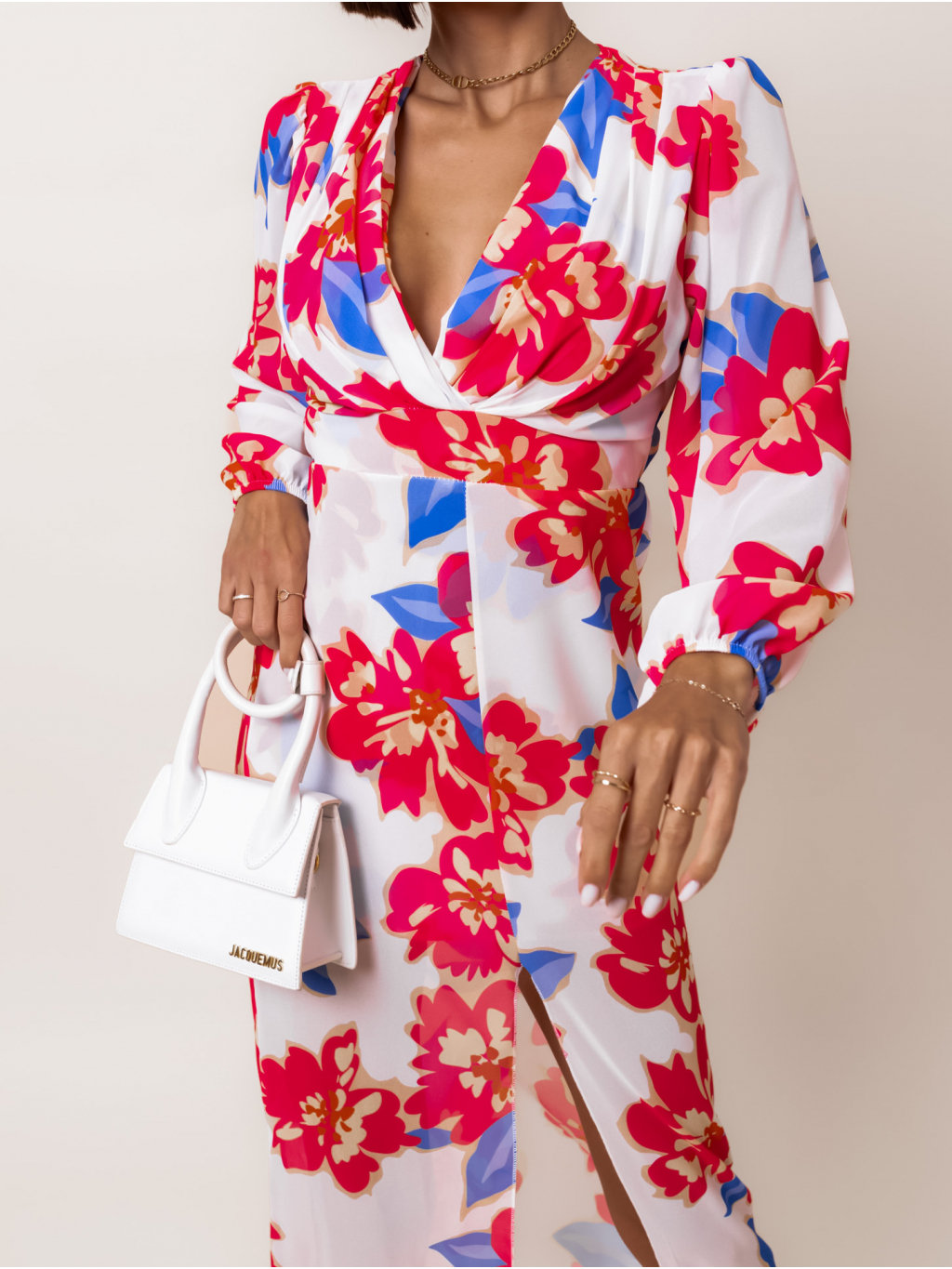 Bílé květinové elegantní šaty DALIS s výstřihem do V