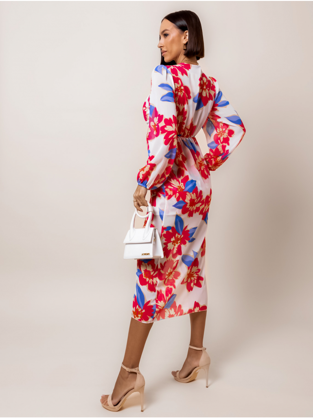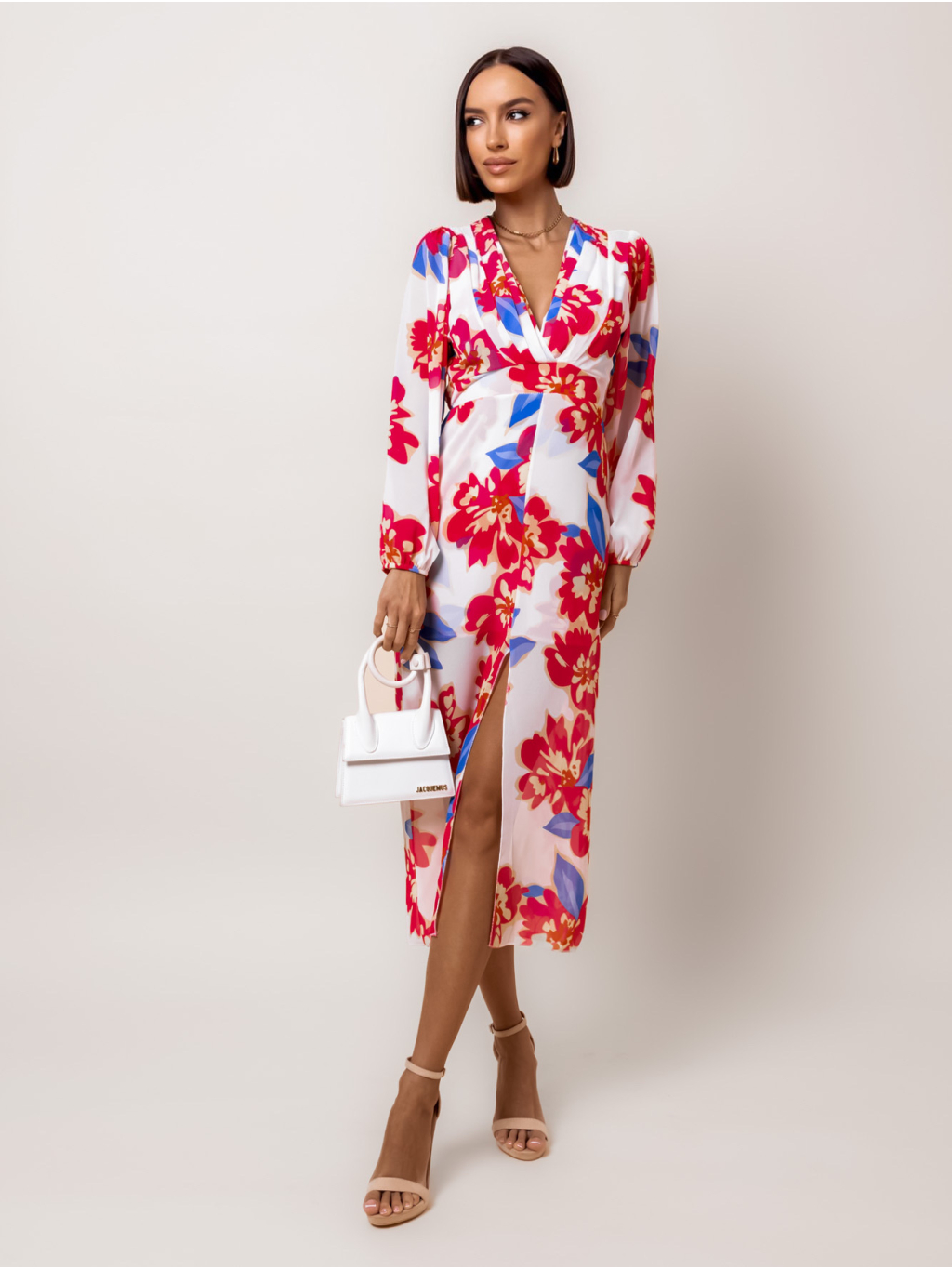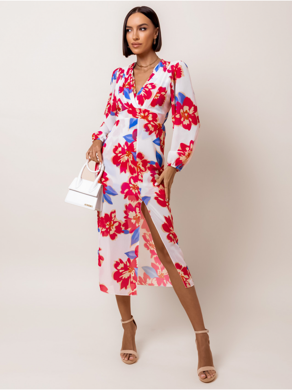 Bílé květinové elegantní šaty DALIS s výstřihem do V