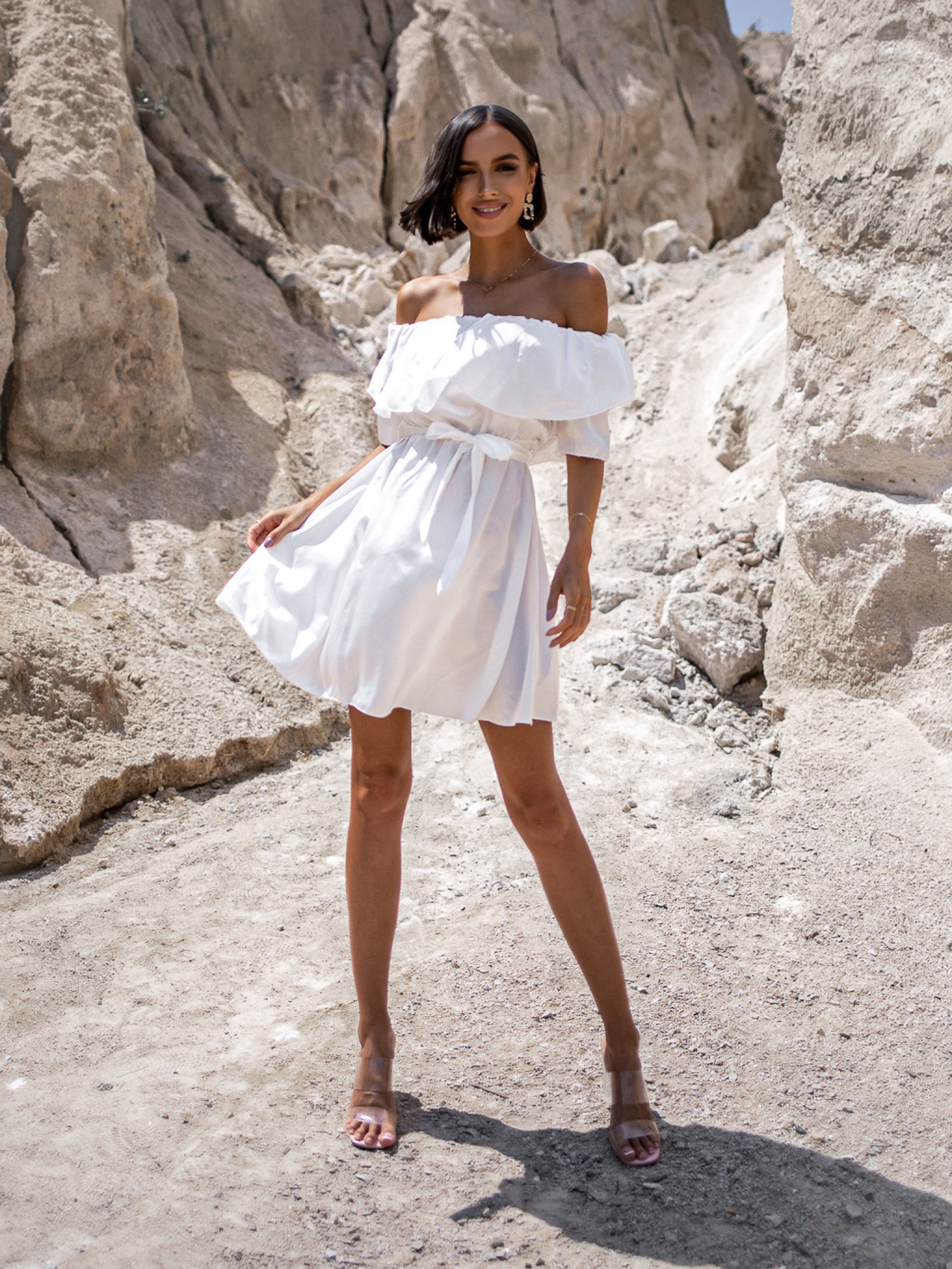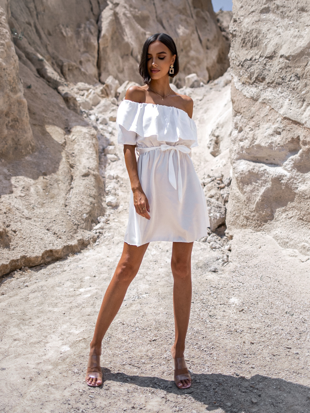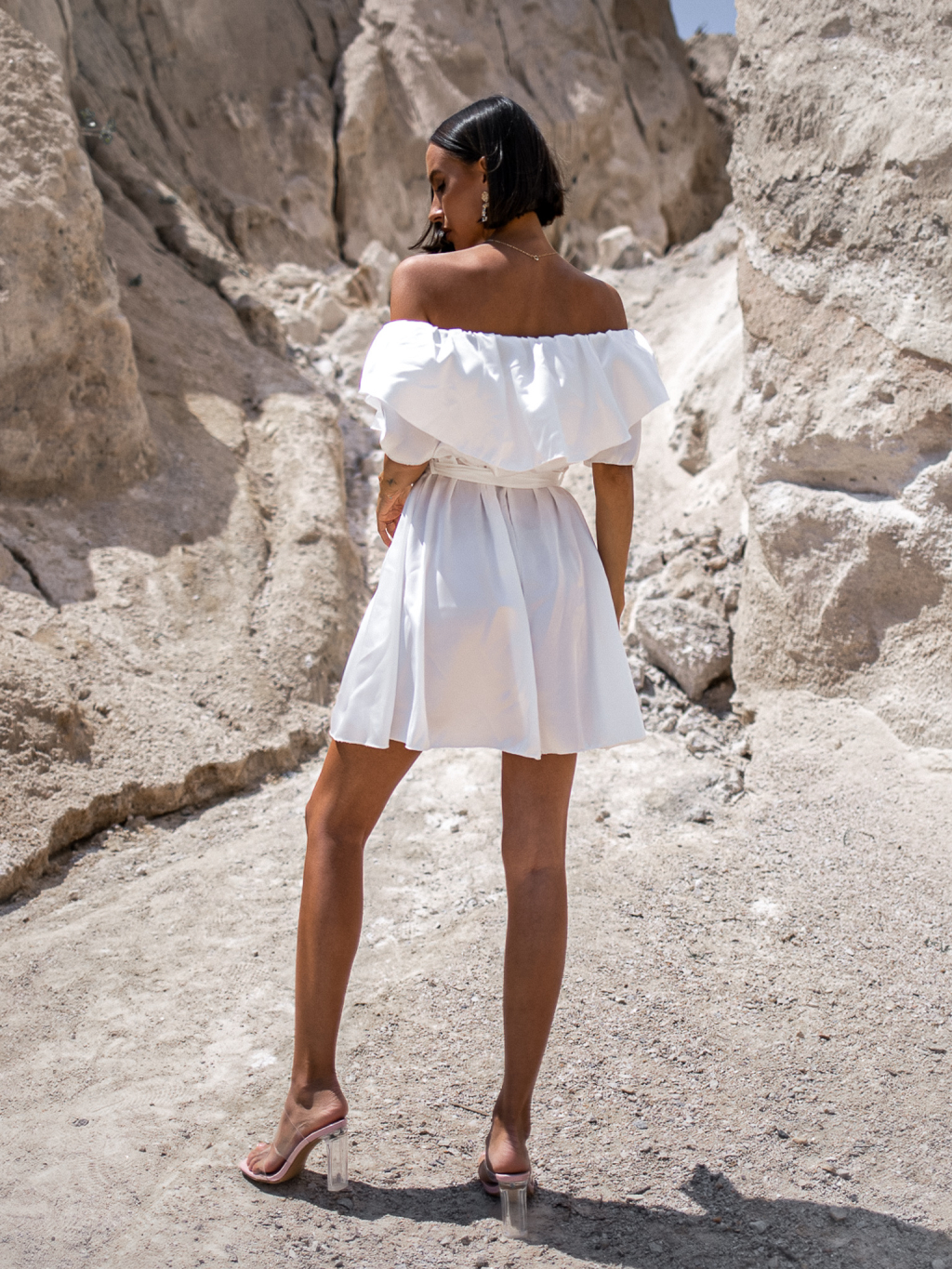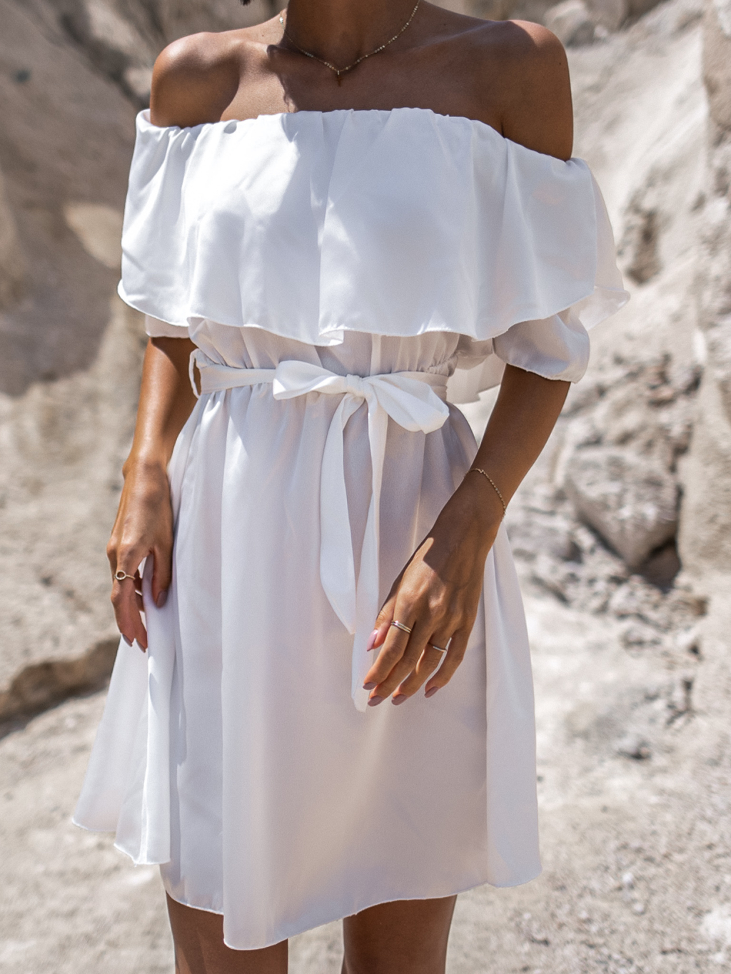 Bílé lesklé elegantní šaty PHITTY s volánky