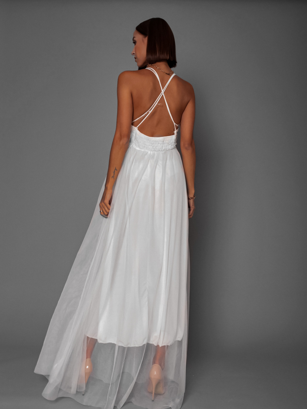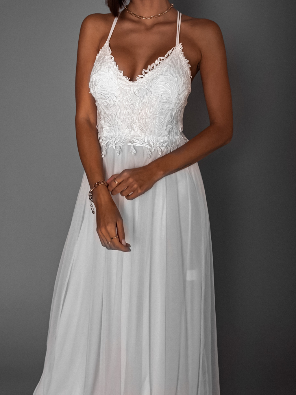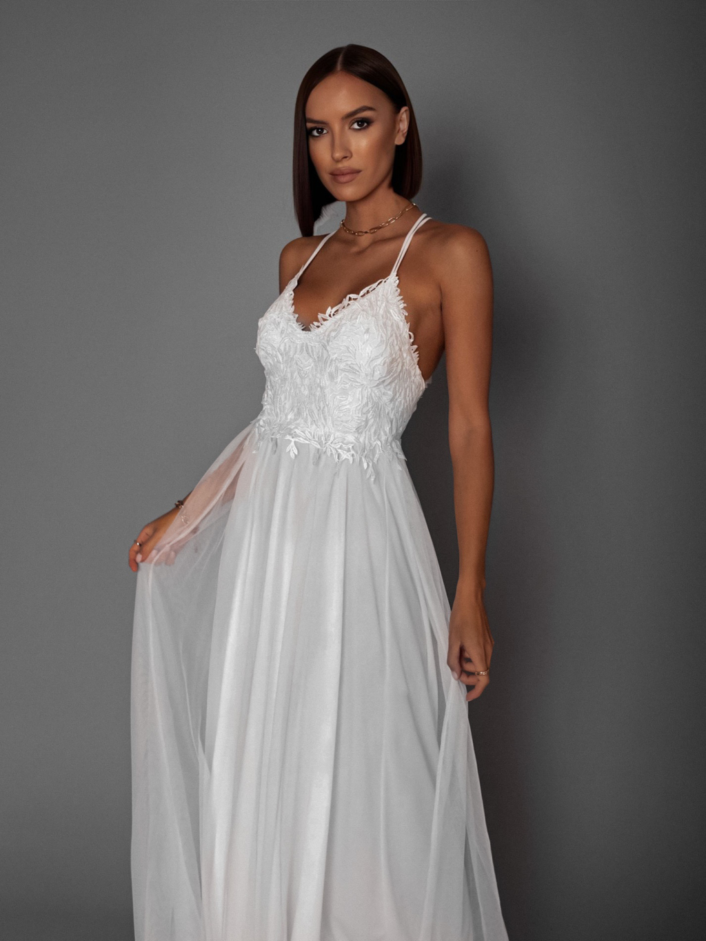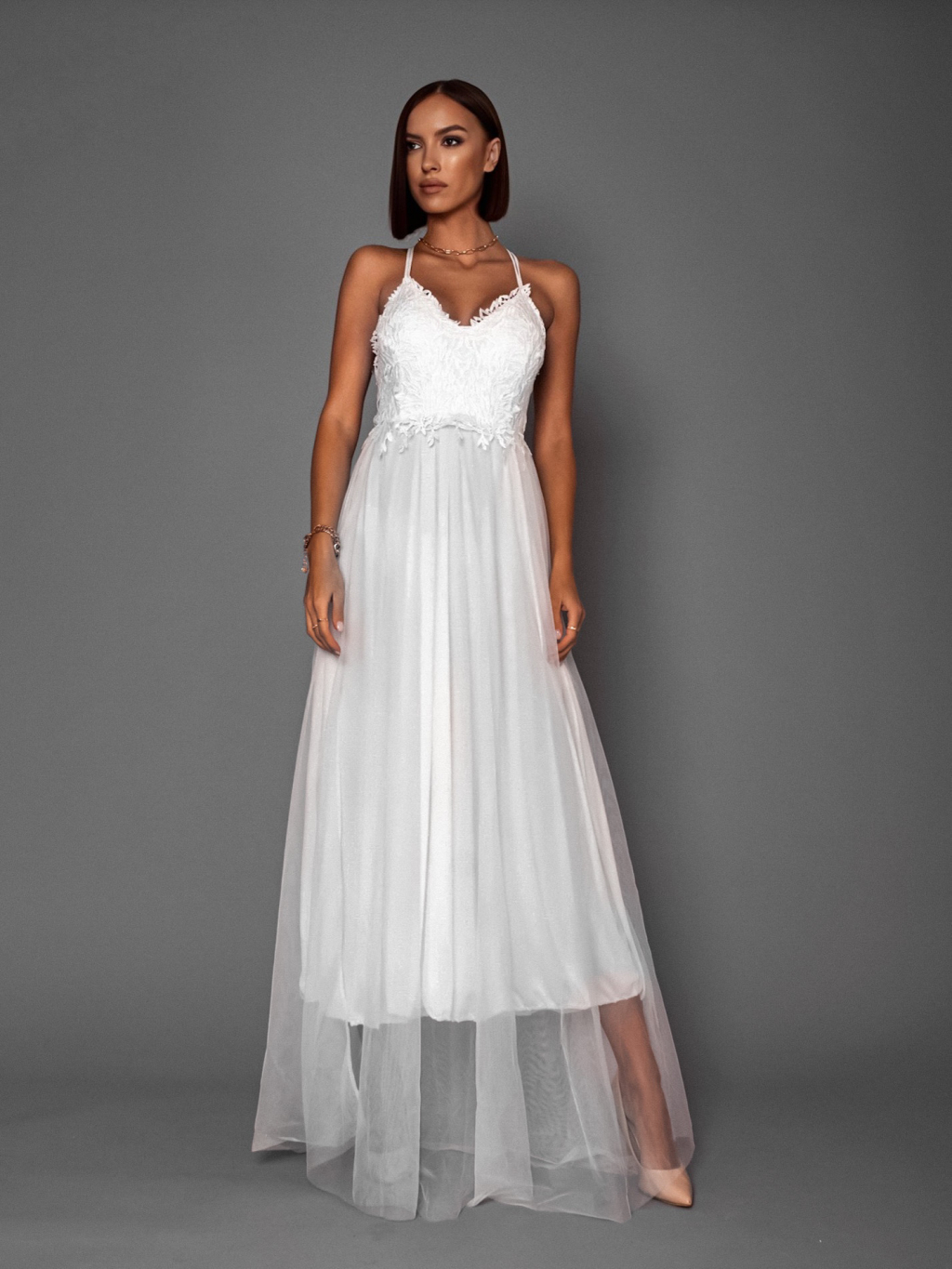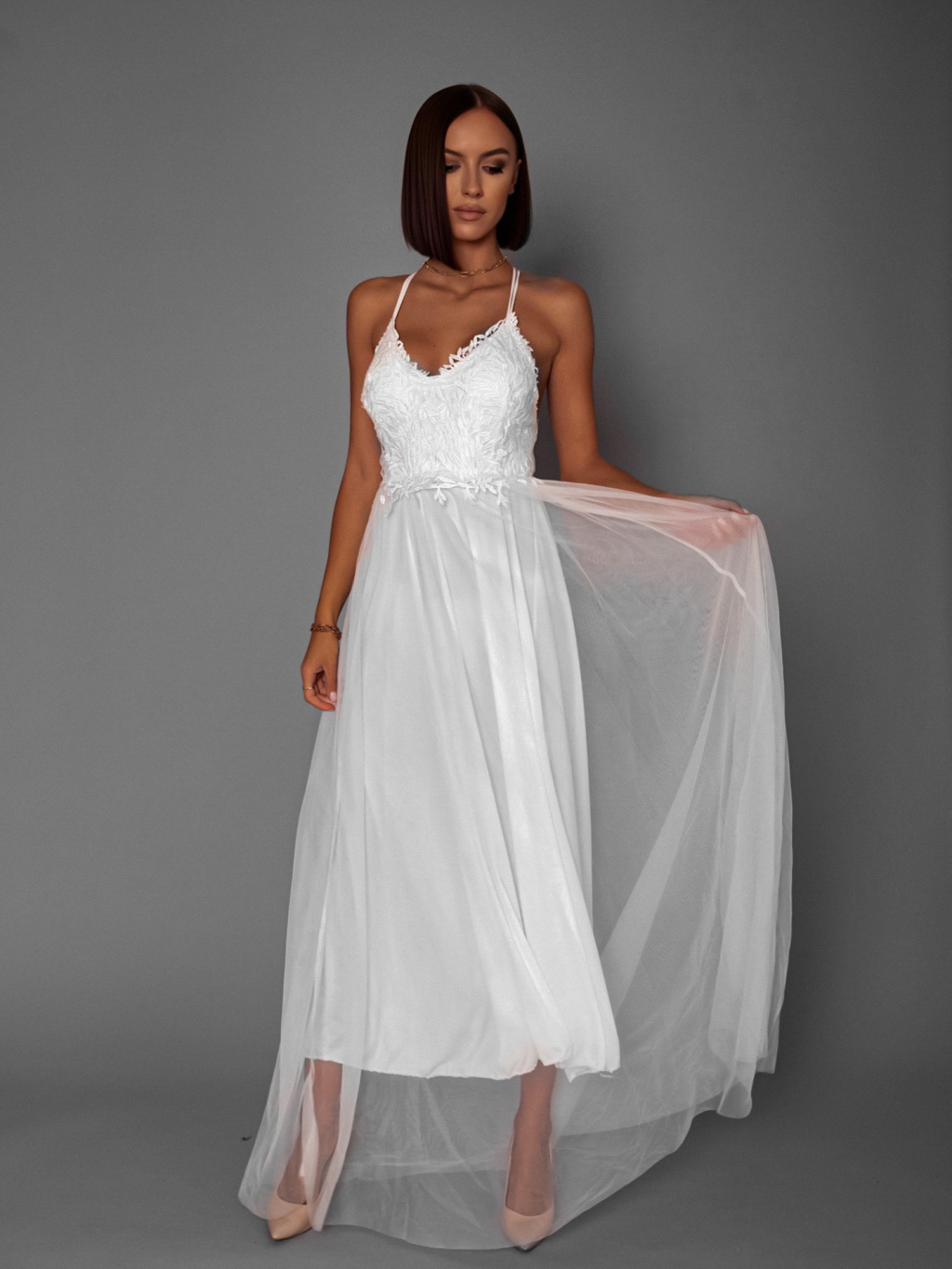 Bílé plesové šaty SWANNY s tylovou sukní a krajkovým topem