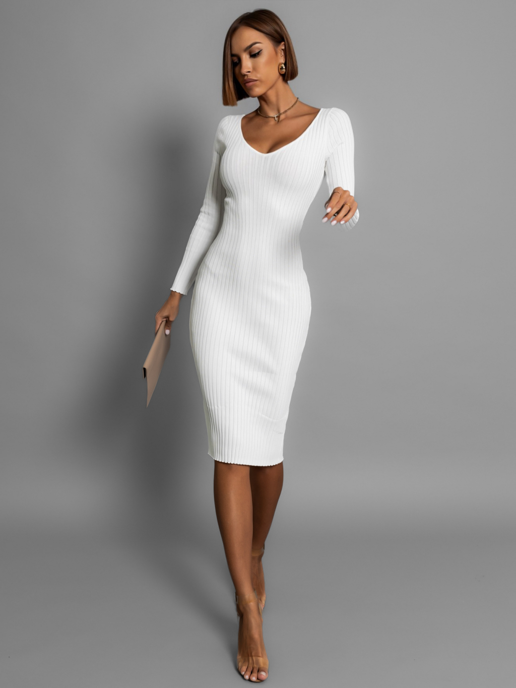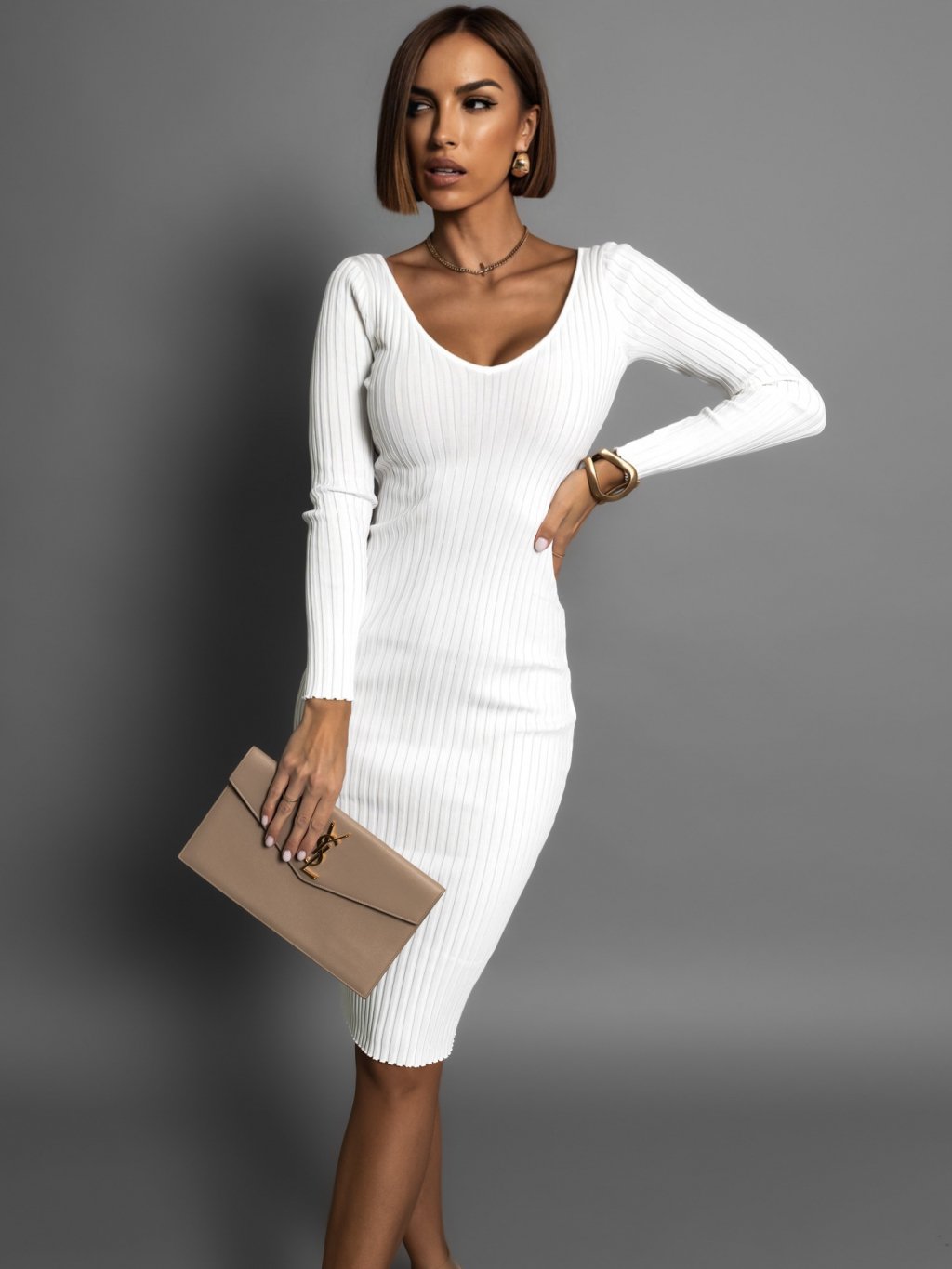 Bílé žebrované midi šaty LOUTEN s dlouhým rukávem