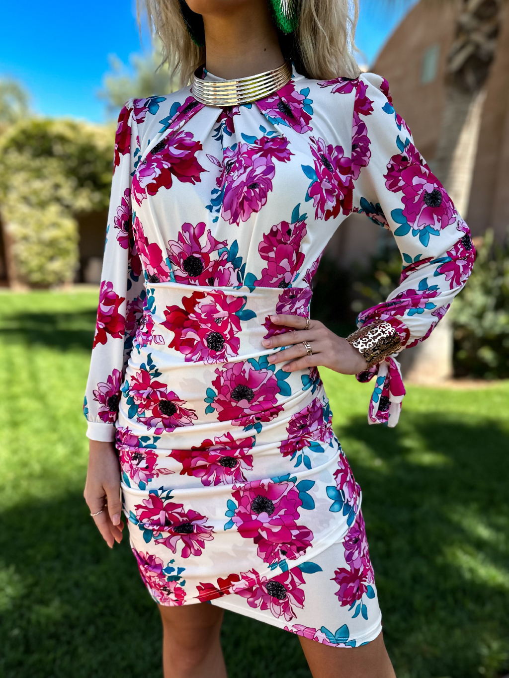 Bílorůžové krátké květinové šaty YARMUR s dlouhým rukávem
