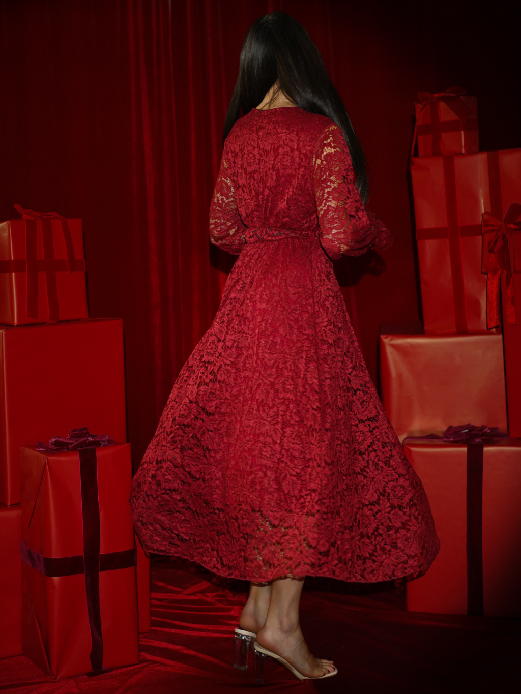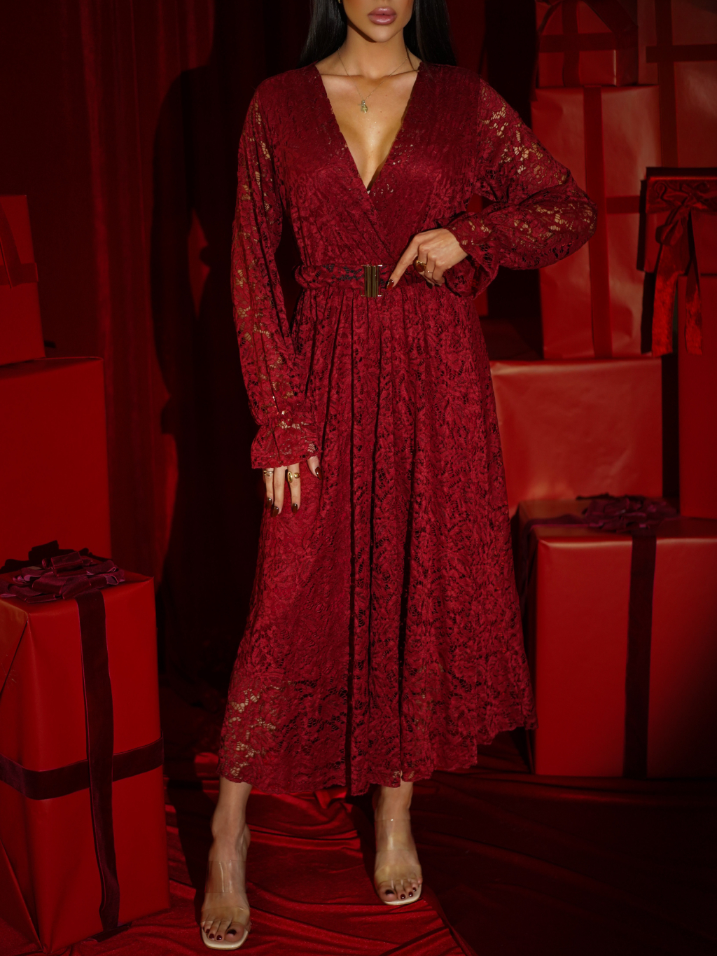 Bordó krajkové společenské midi šaty LIRONDE