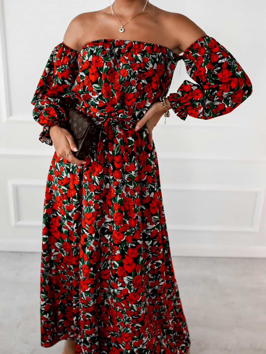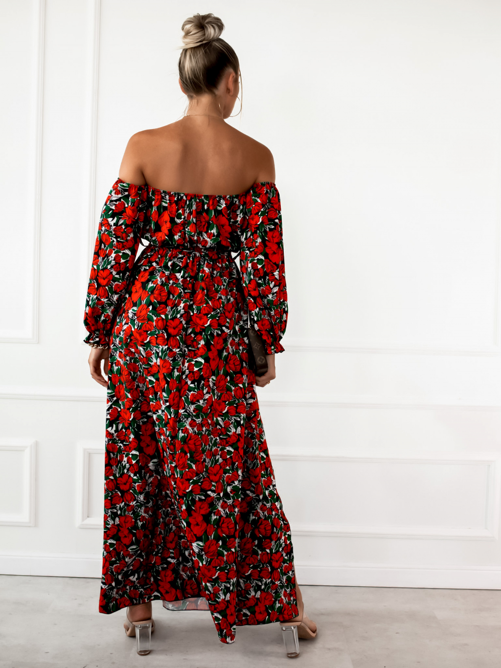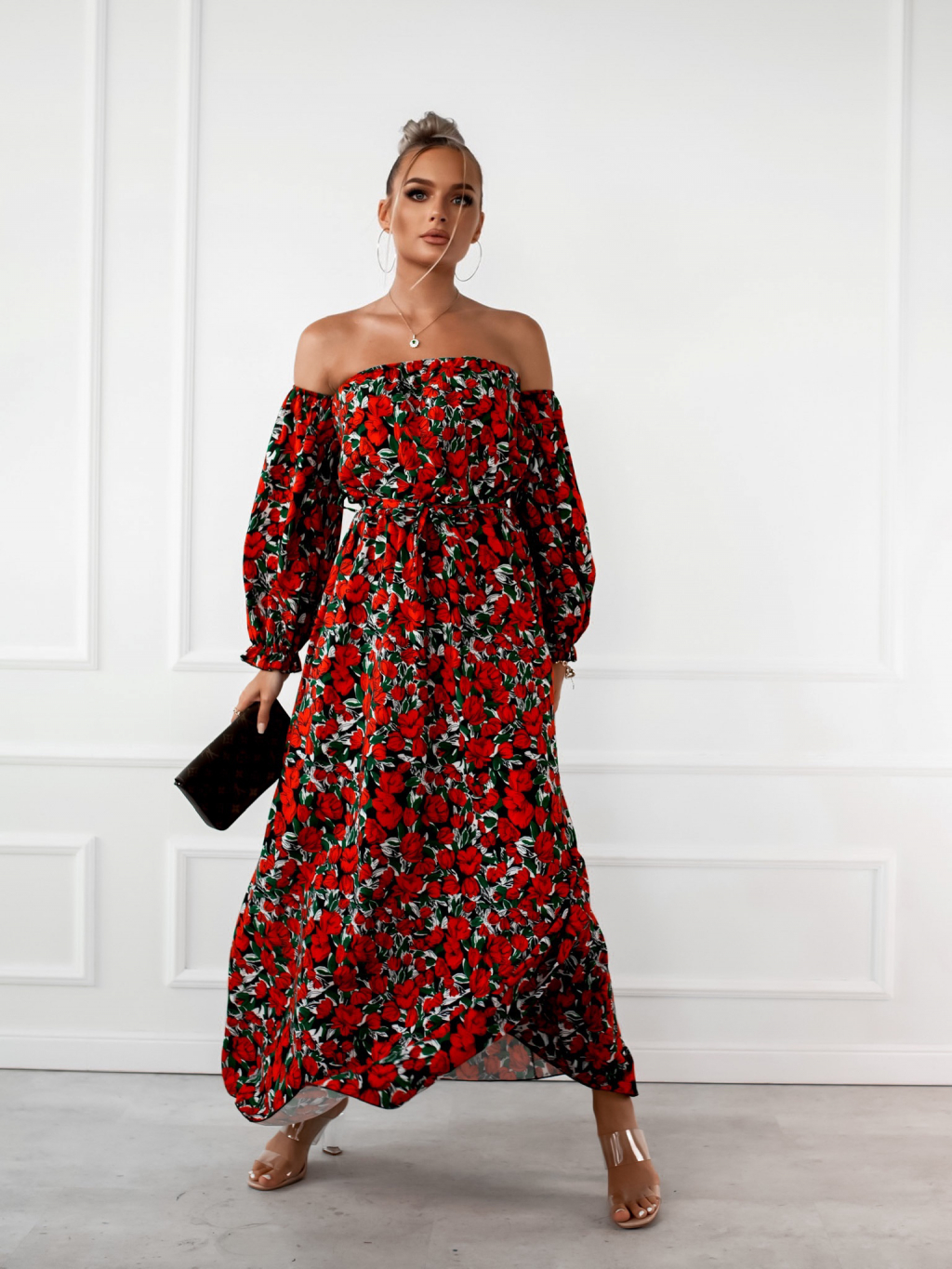 Černé dlouhé šaty CARMENNO s květinovým potiskem