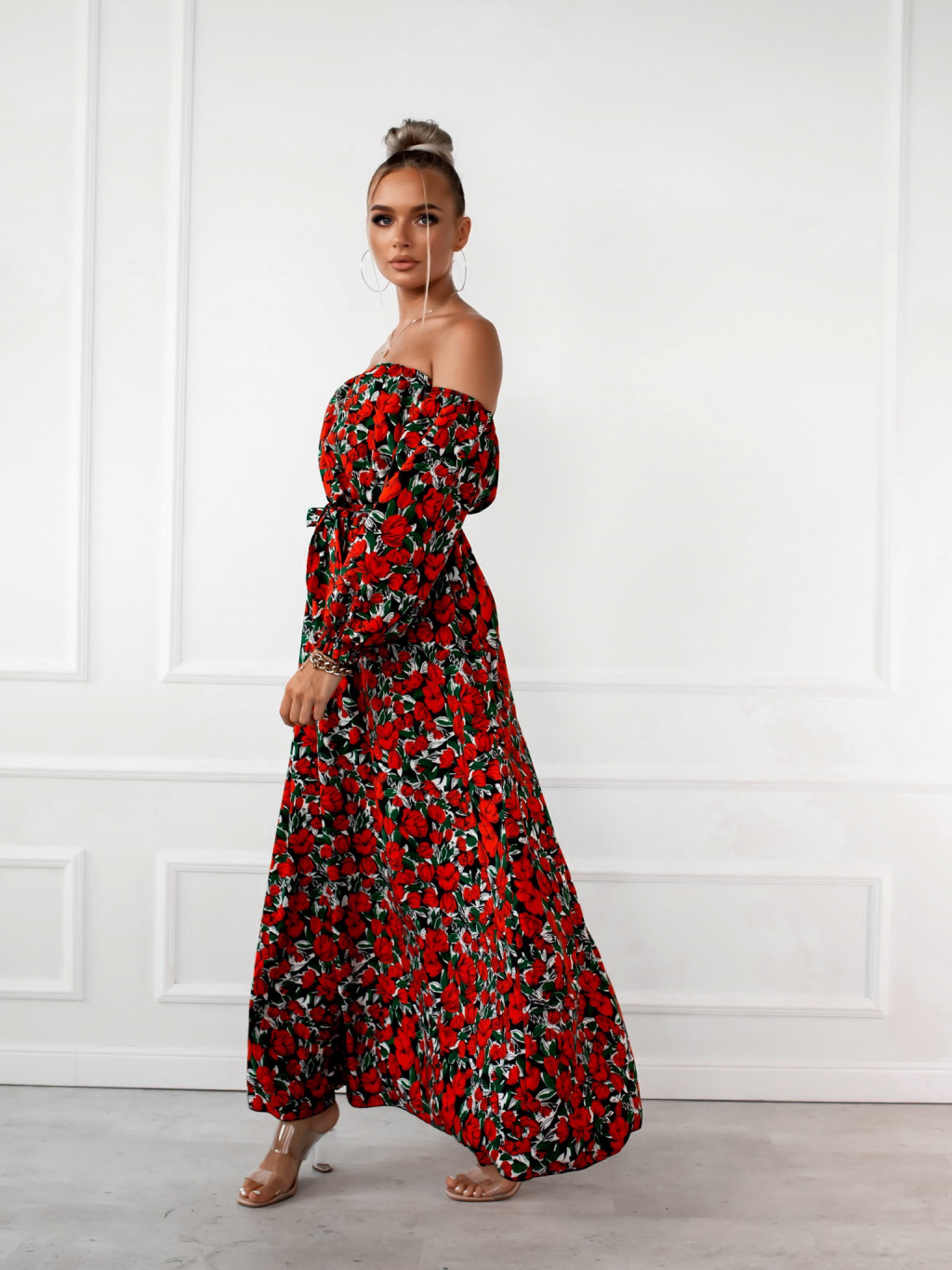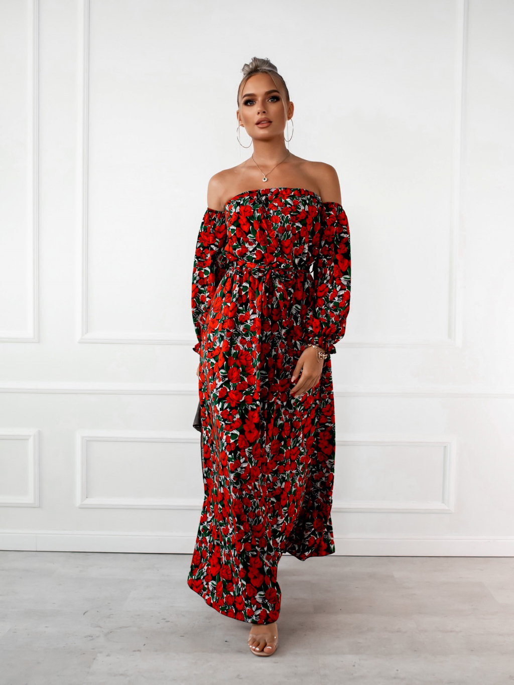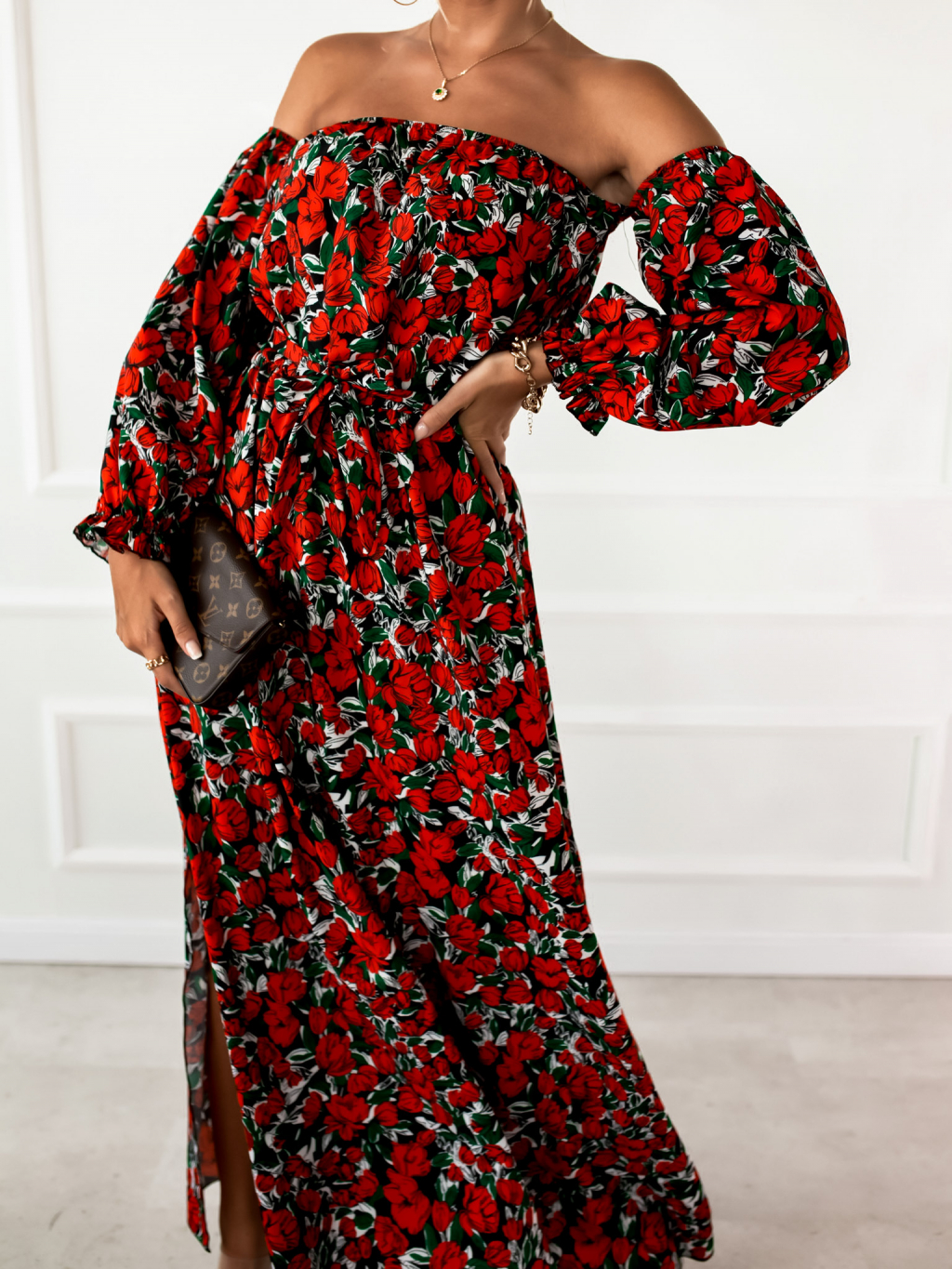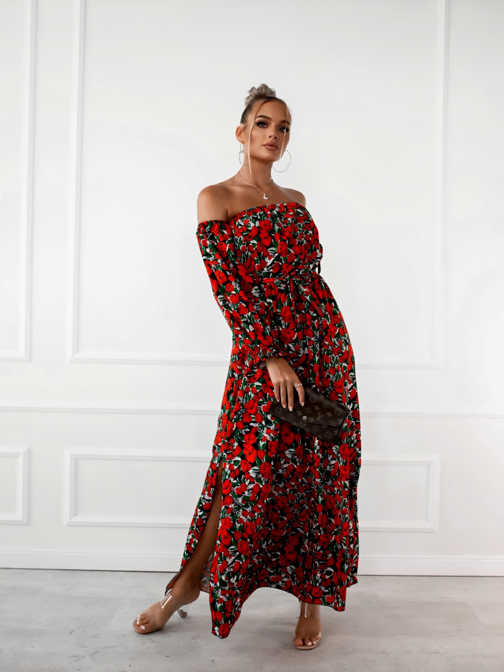 Černé dlouhé šaty CARMENNO s květinovým potiskem