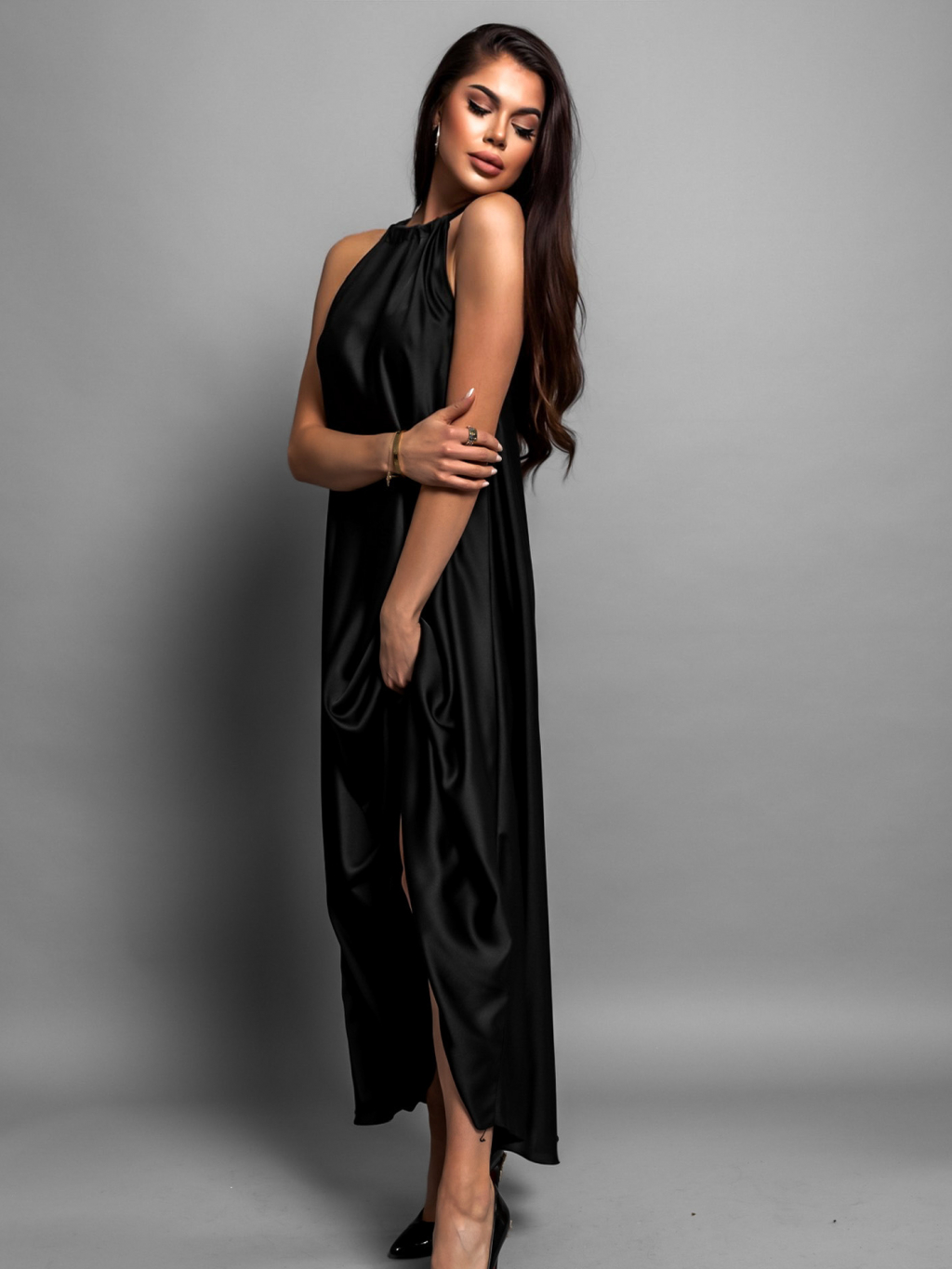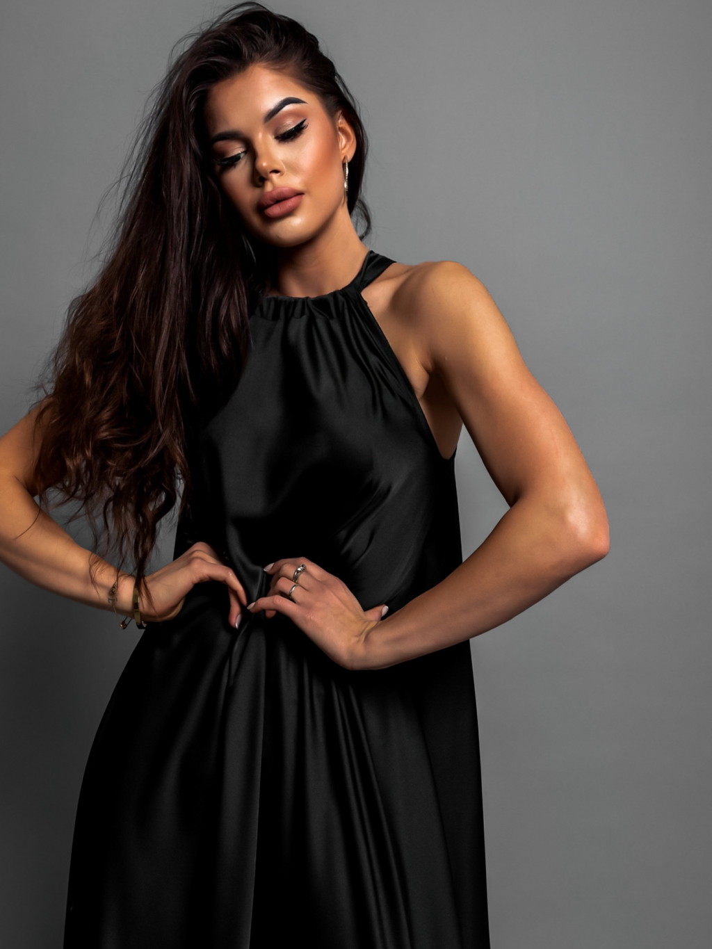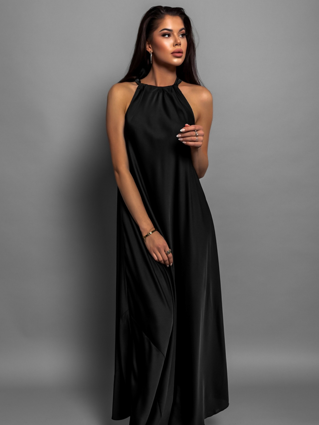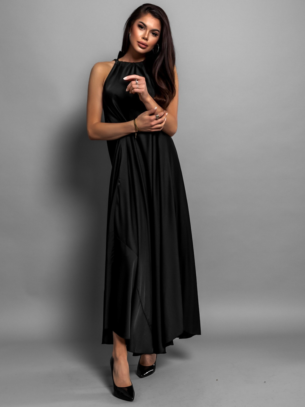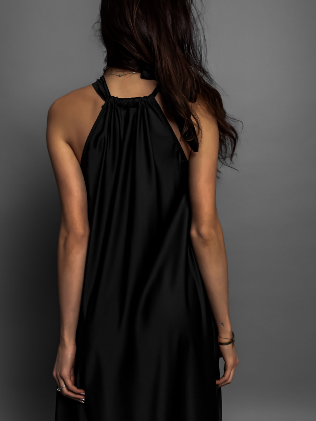 Černé elegantní lesklé šaty CORALLINE s vázáním kolem krku