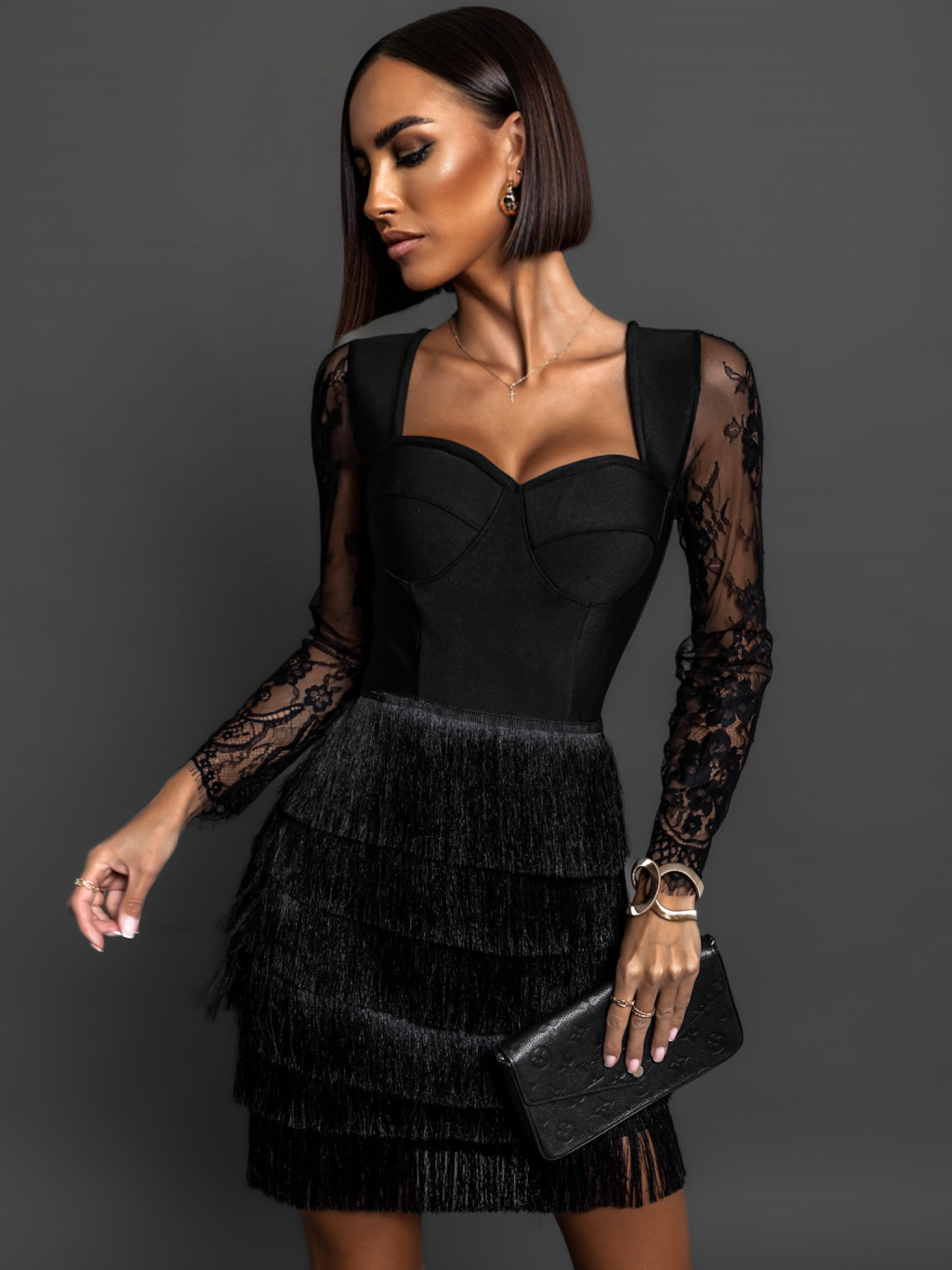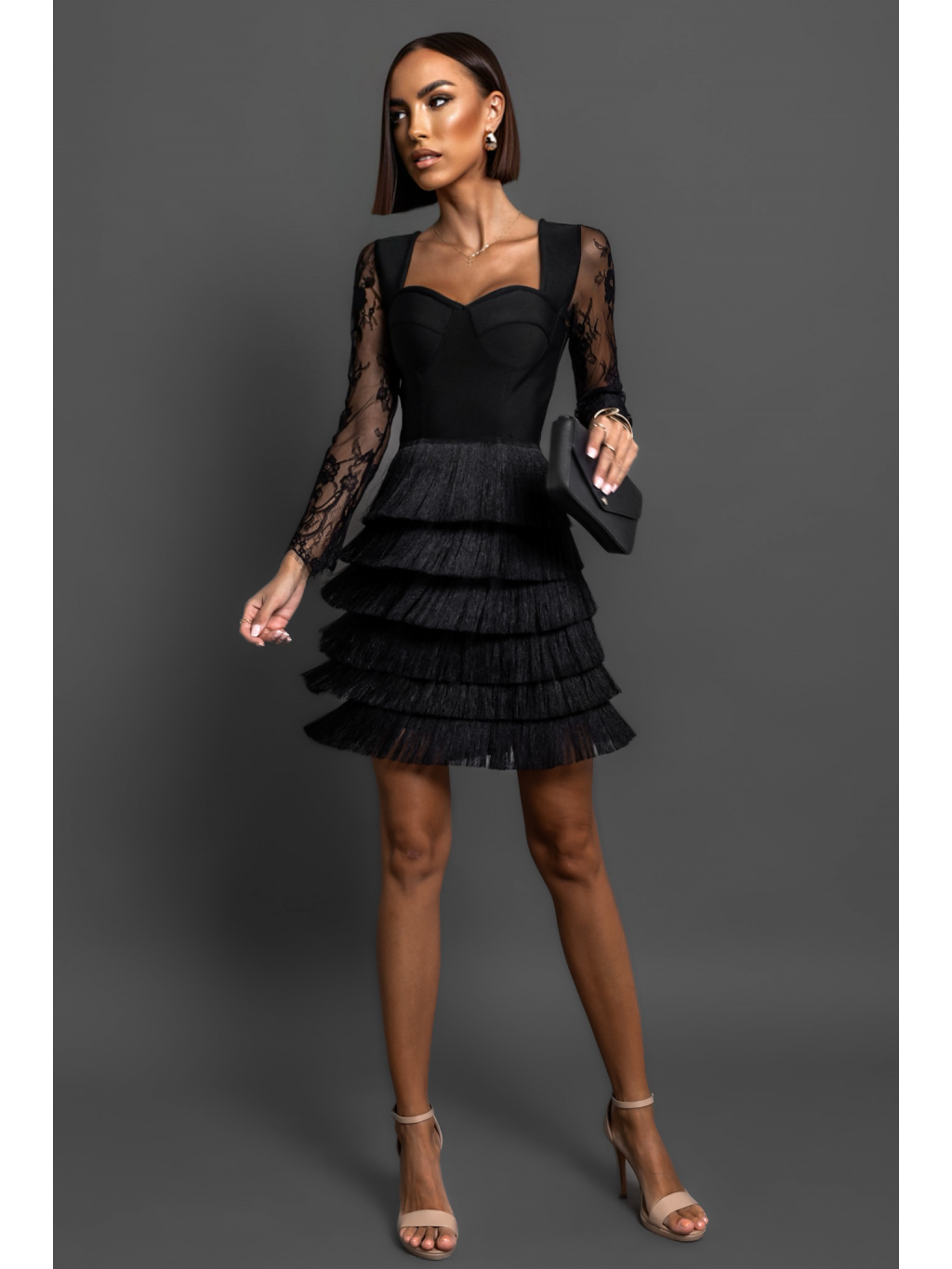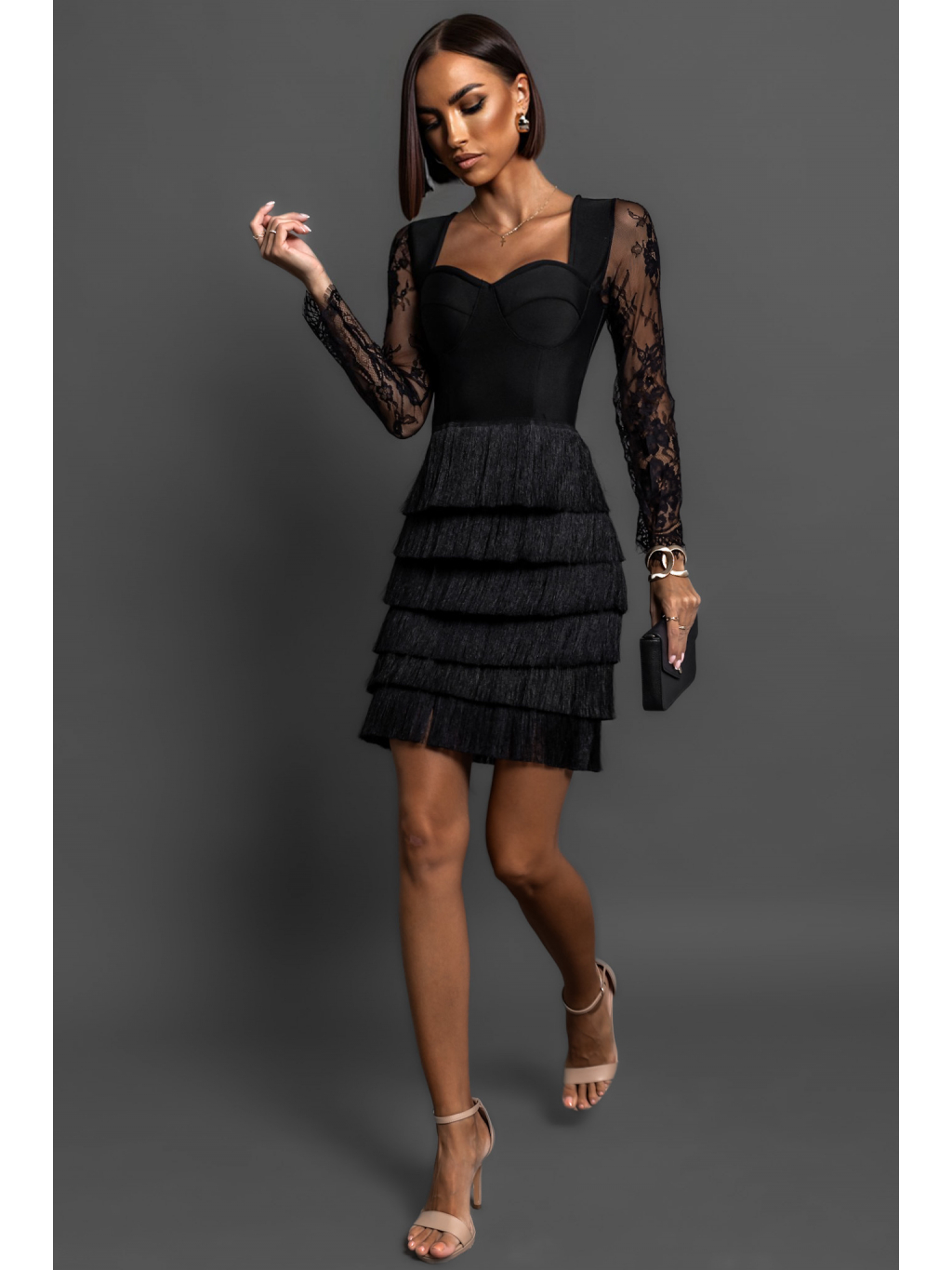 Černé koktejlové elegantní šaty HOLLDER s třásněmi