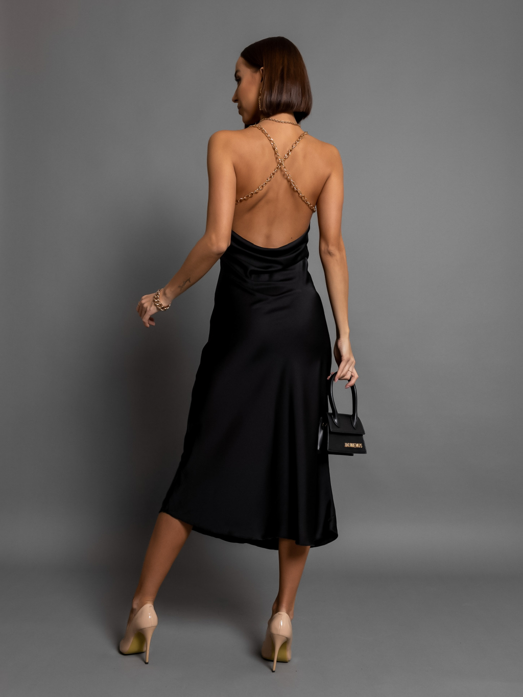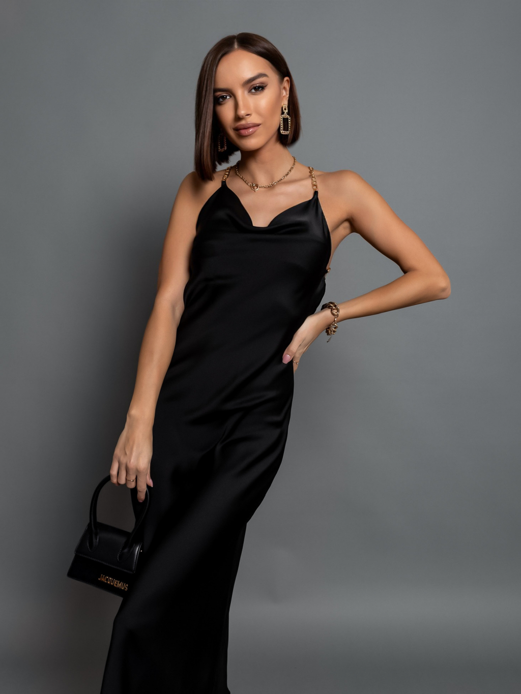 Černé lesklé delší šaty MINTY s řetízkovými ramínky