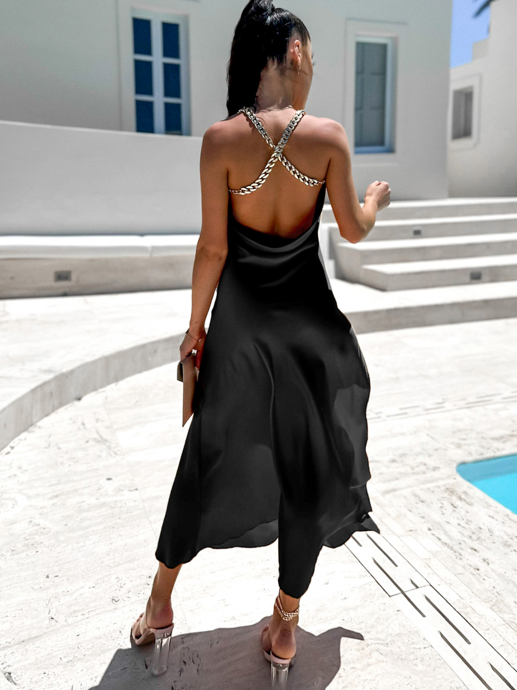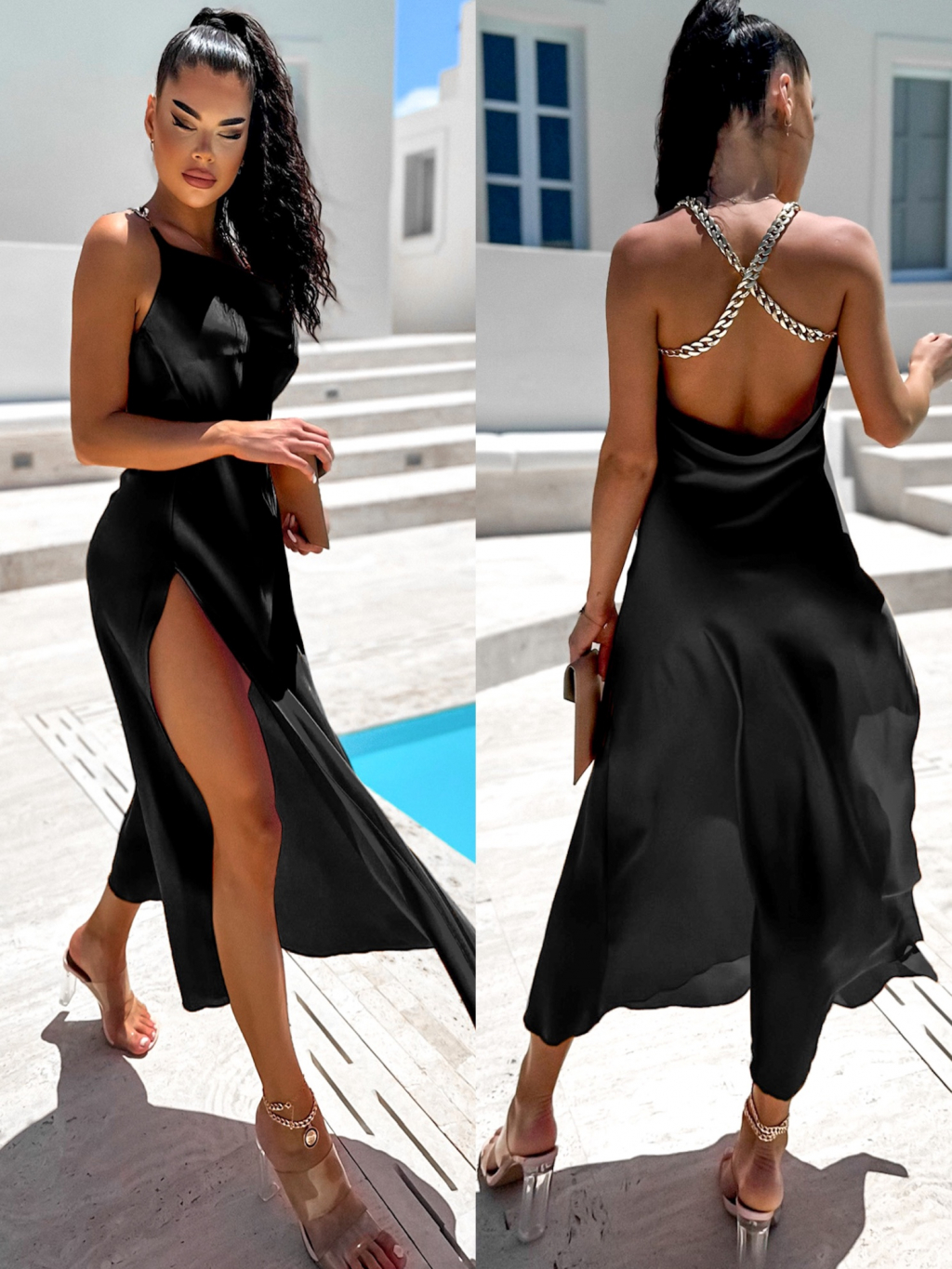 Černé lesklé elegantní šaty MENLEYS se zlatými ramínky