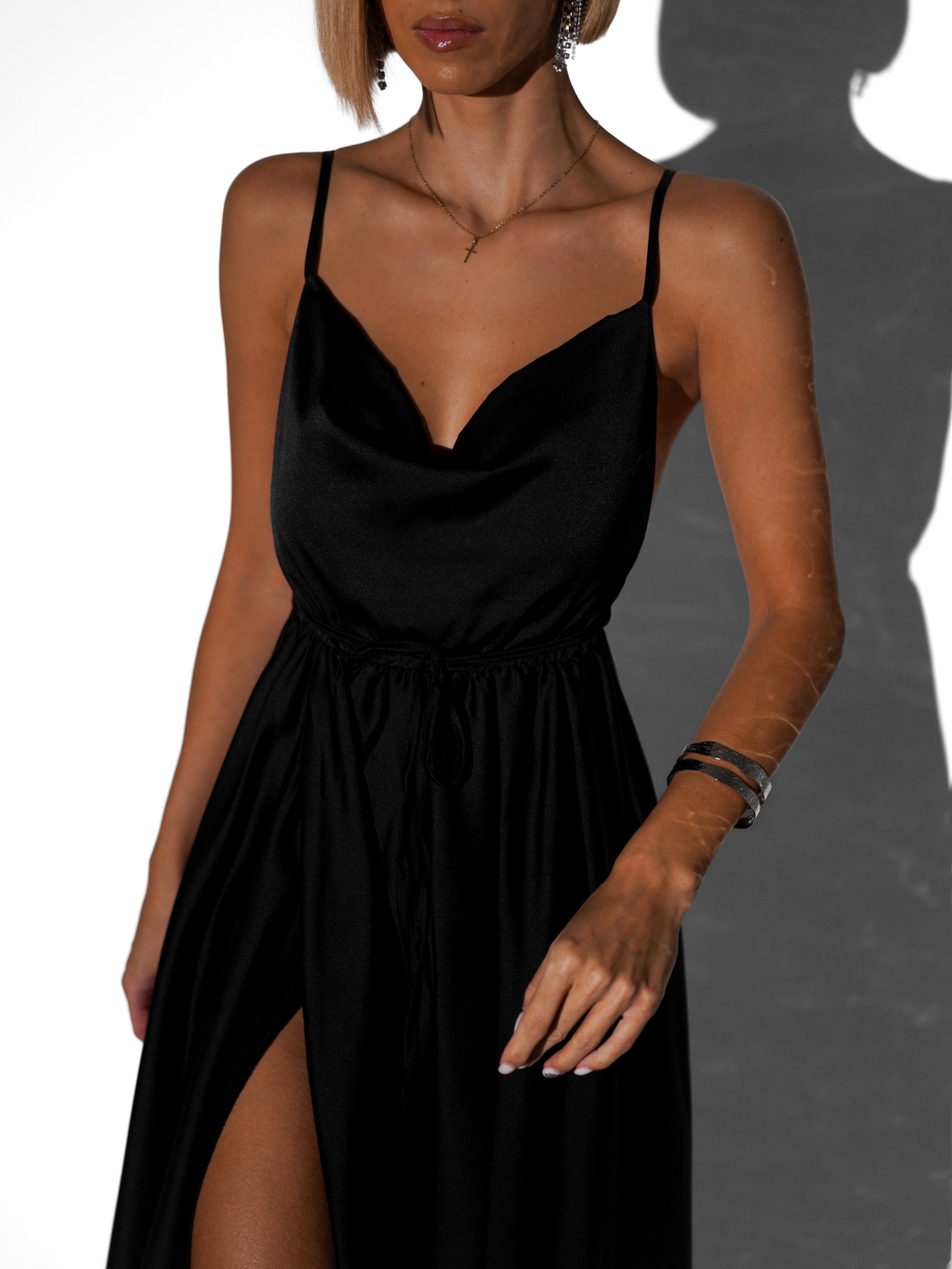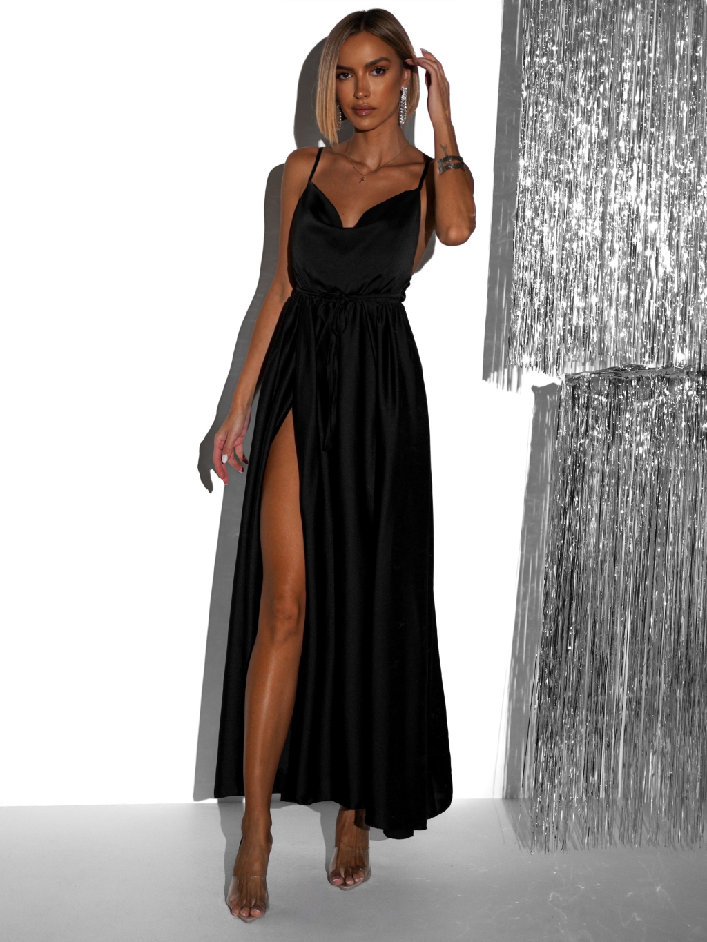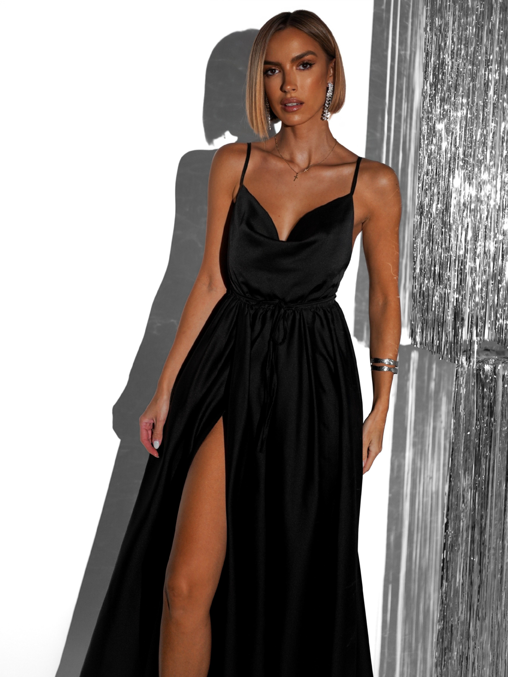 Černé lesklé elegantní šaty YASMINE s rozparkem