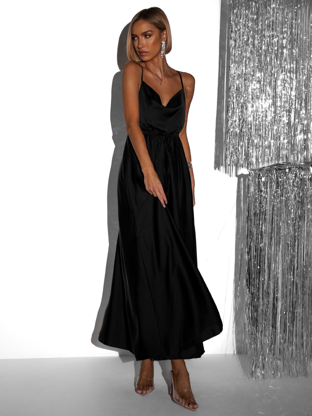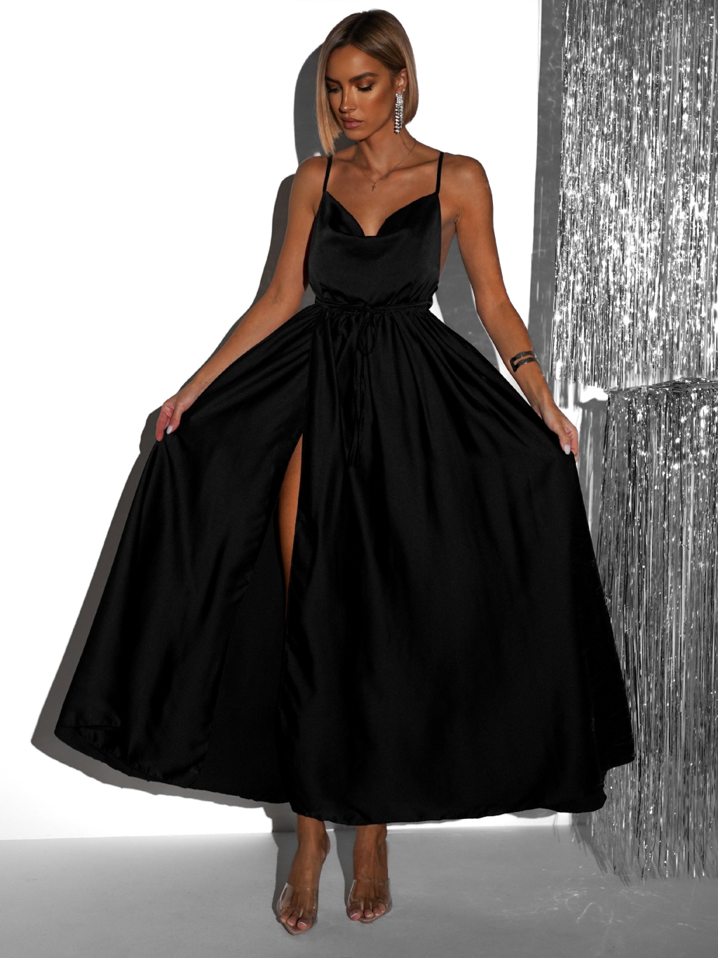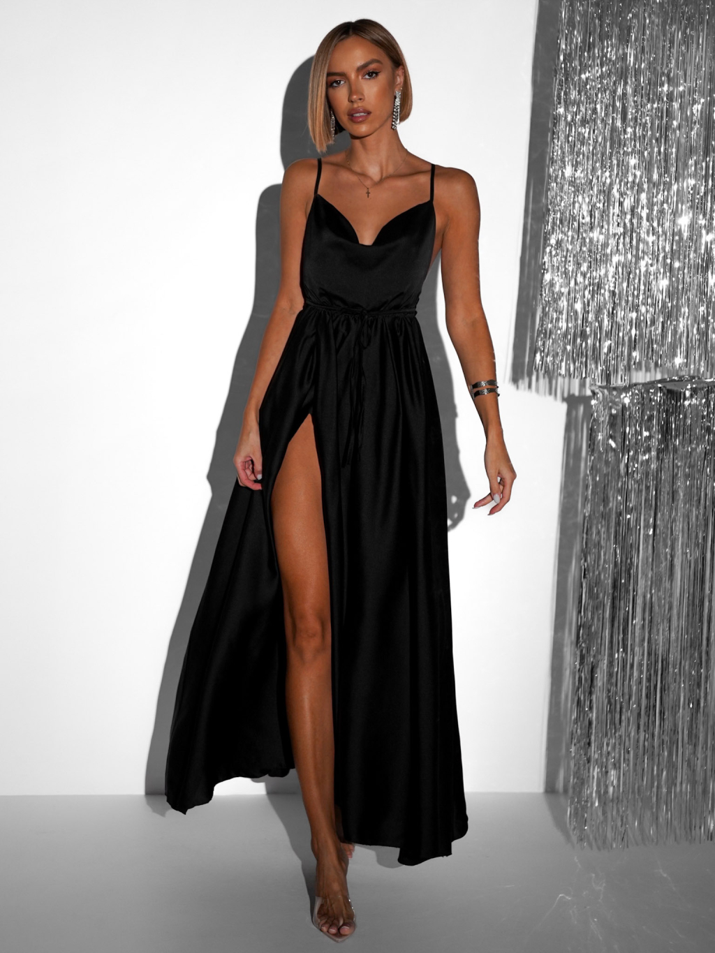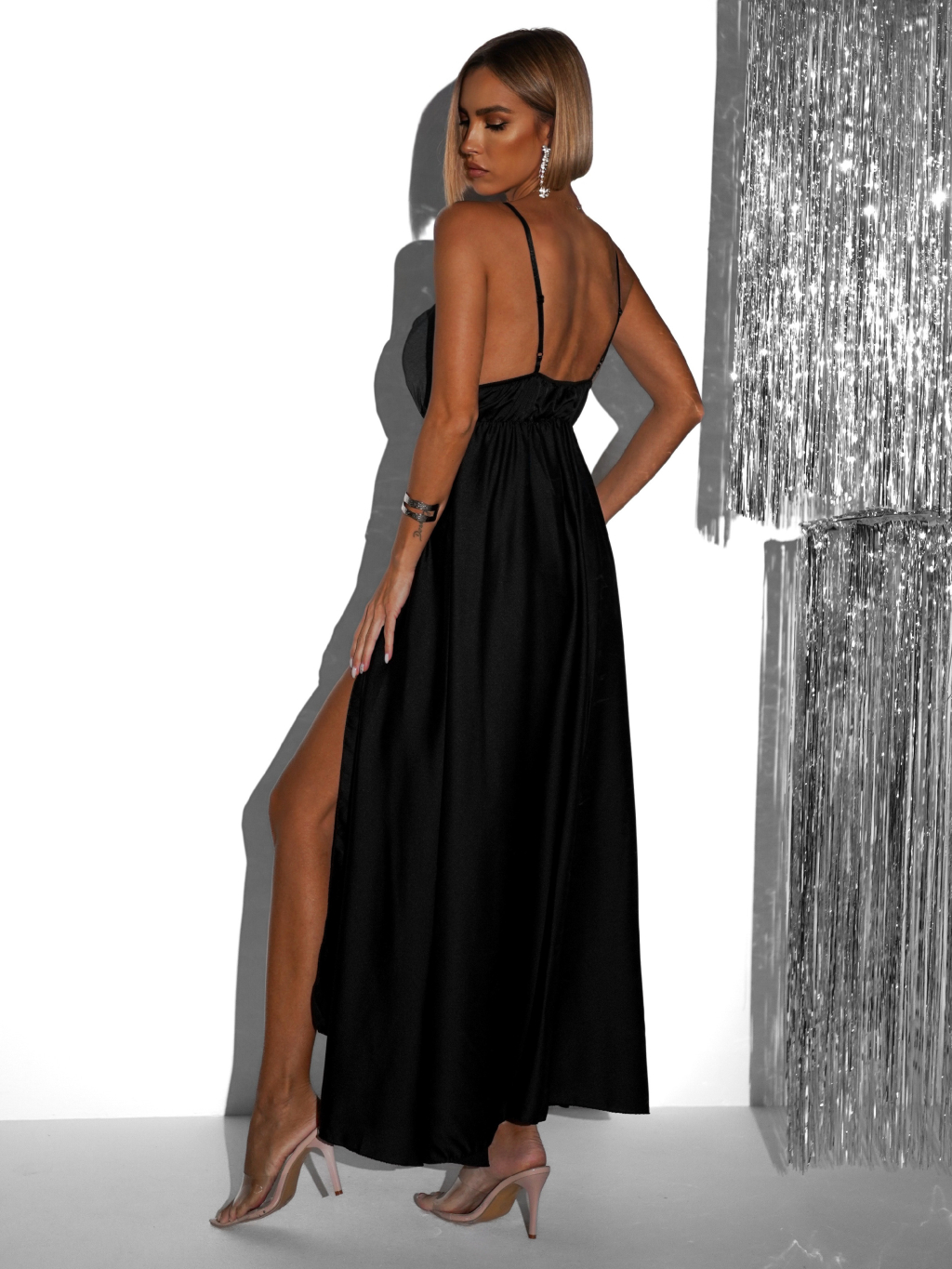 Černé lesklé elegantní šaty YASMINE s rozparkem