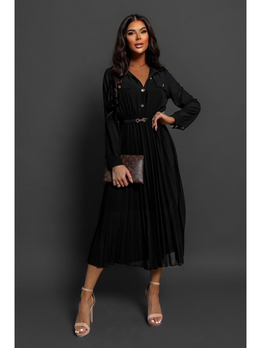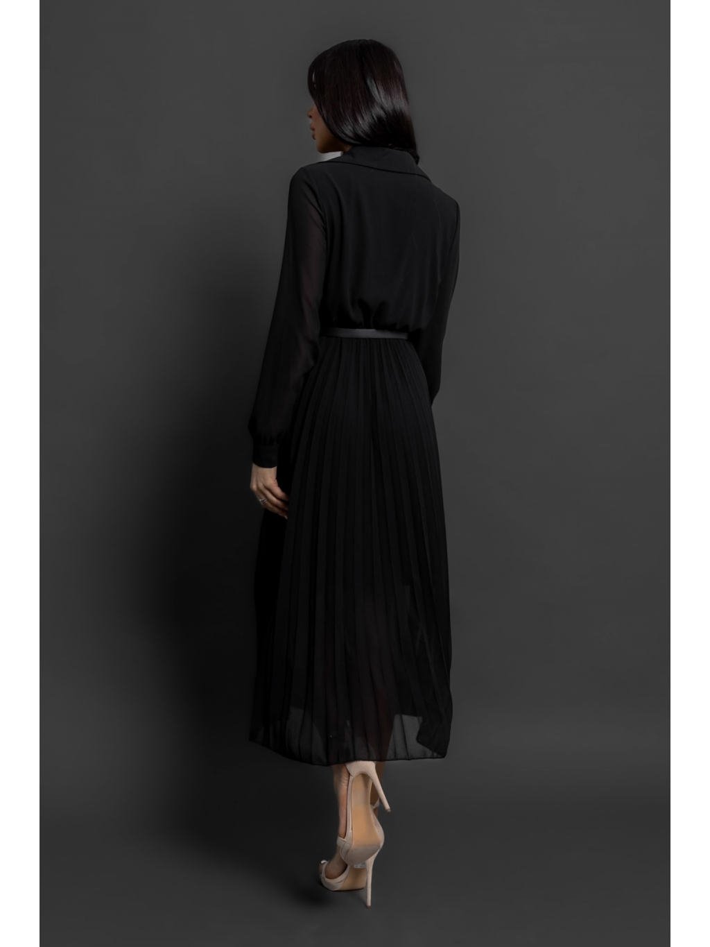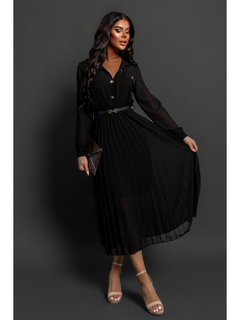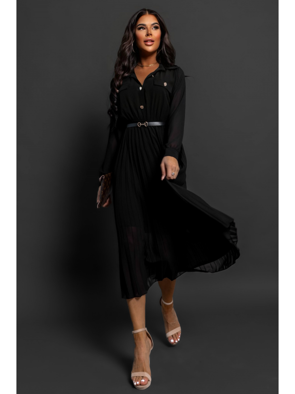 Černé plisované elegantní šaty NADYA s páskem