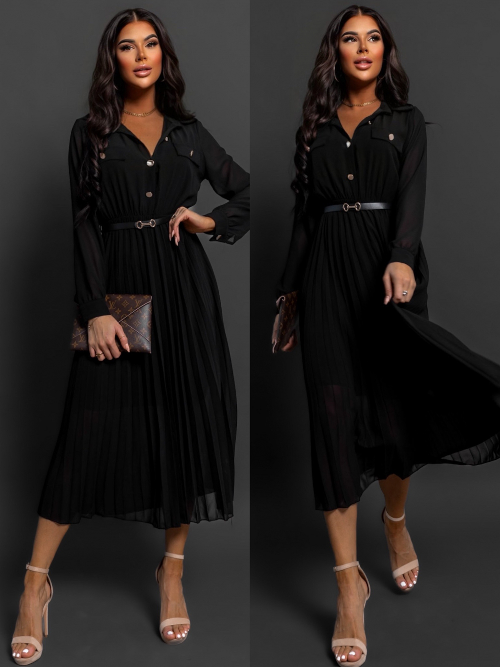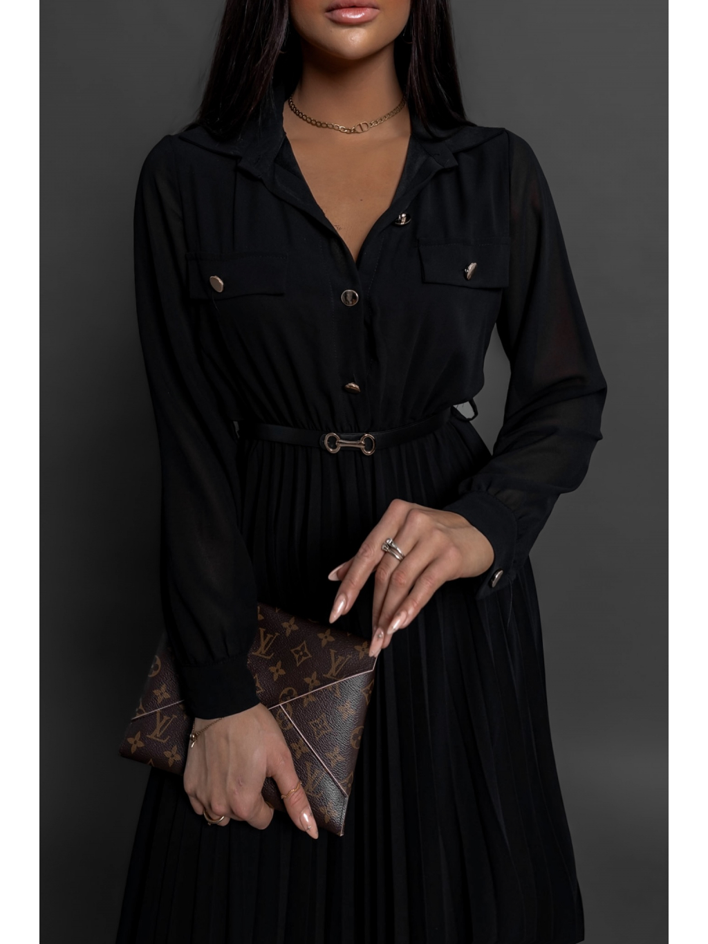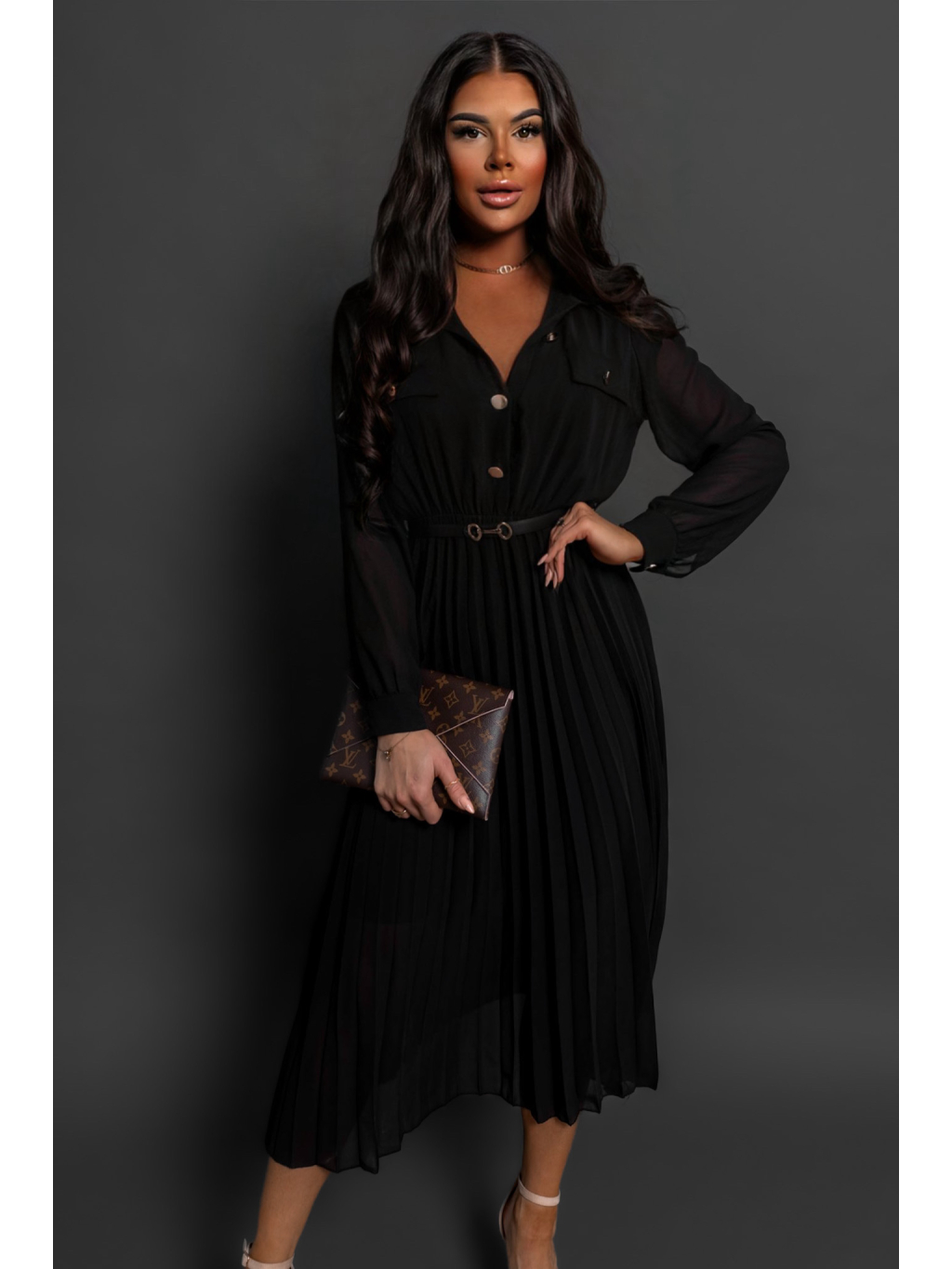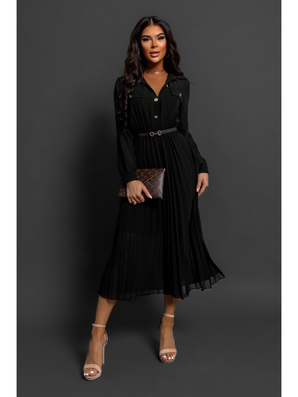 Černé plisované elegantní šaty NADYA s páskem