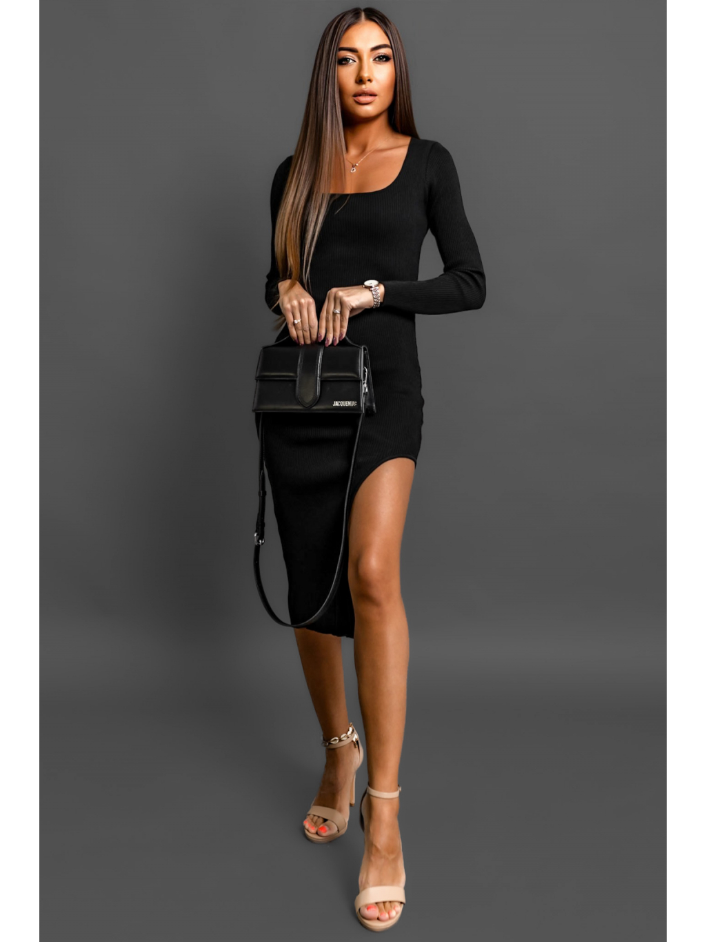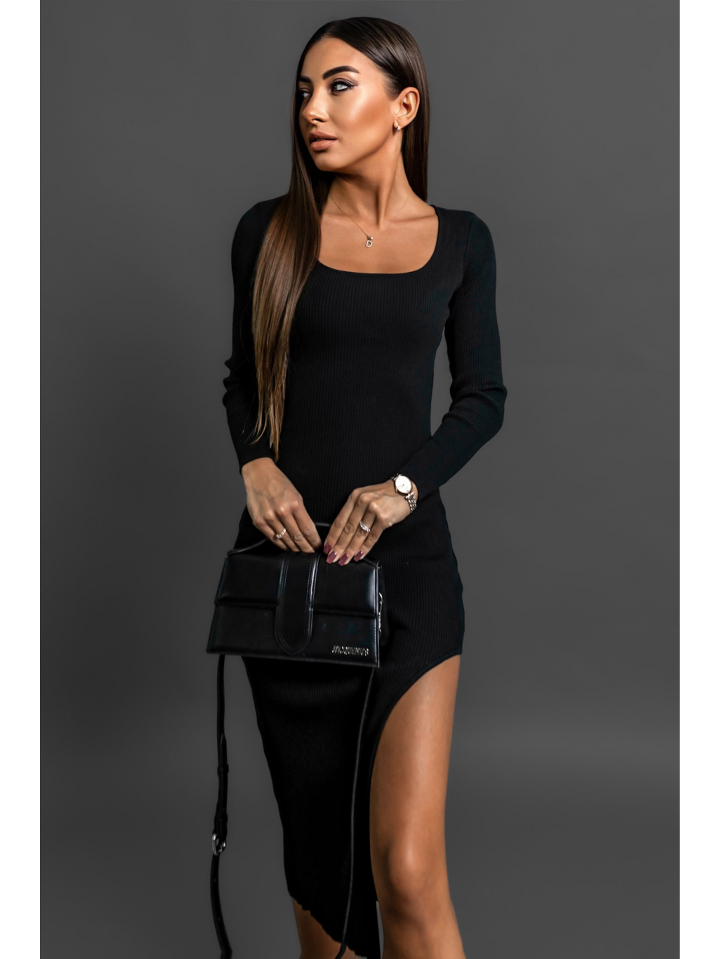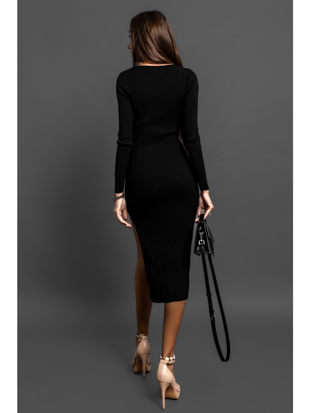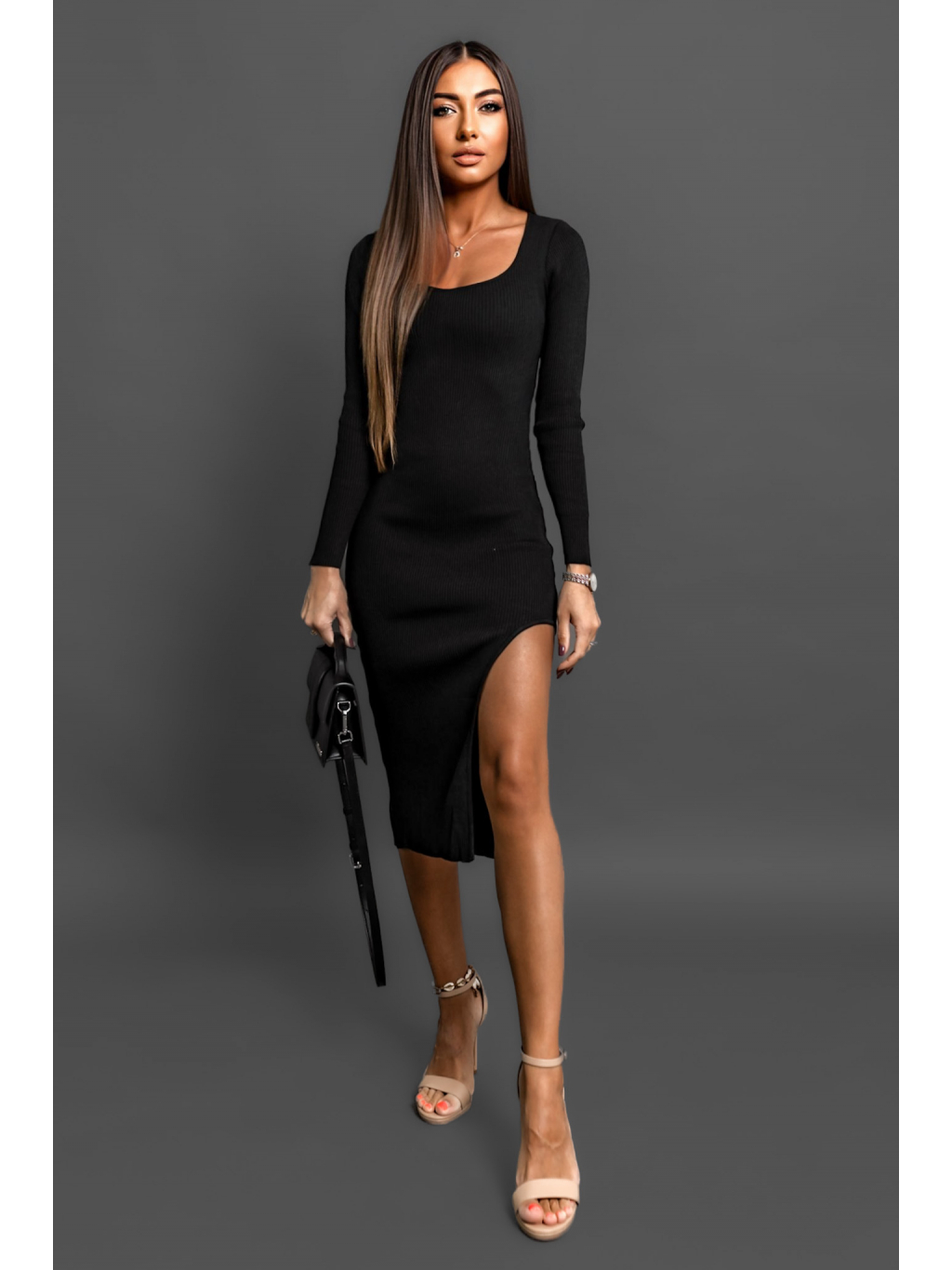 Černé úpletové šaty MOHEGAN s rozparkem