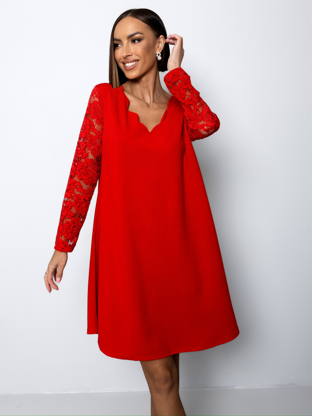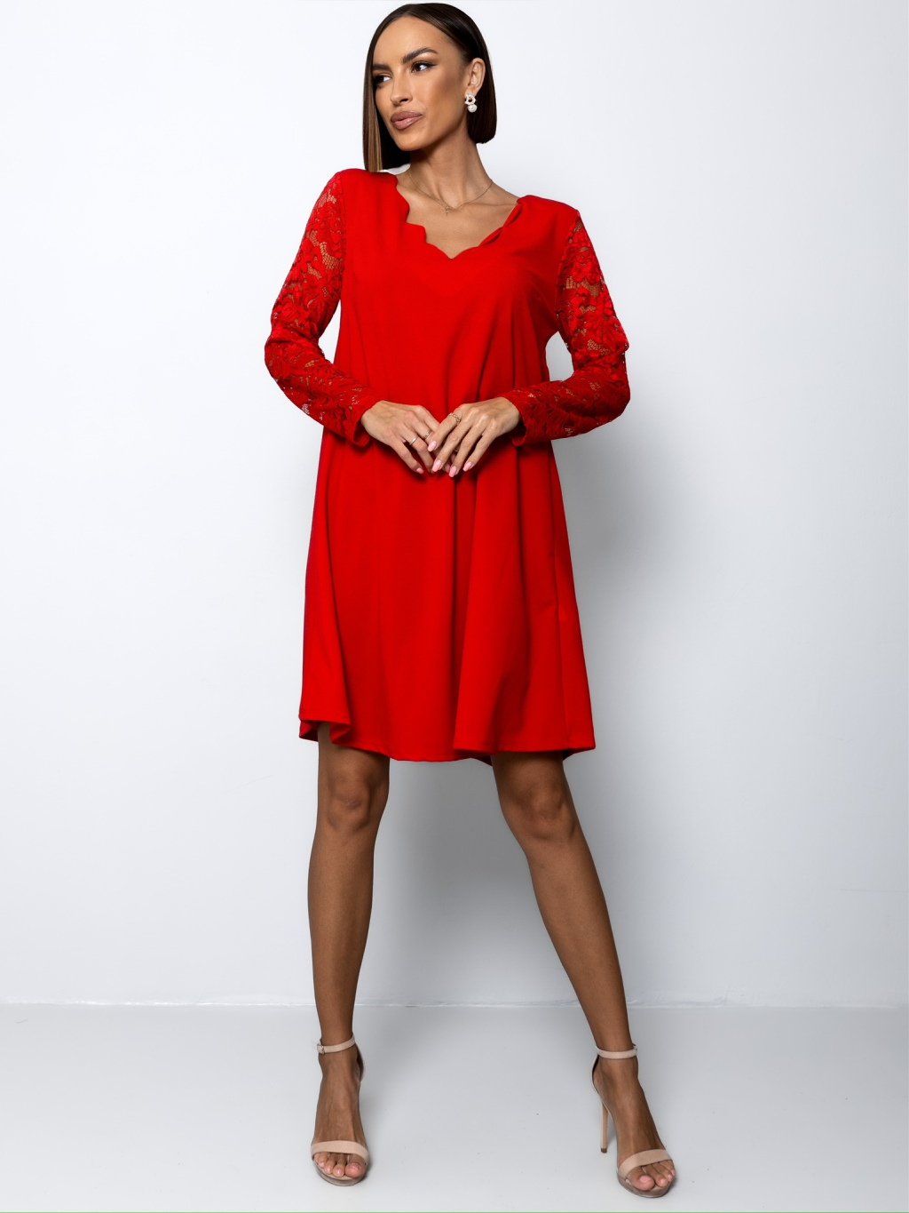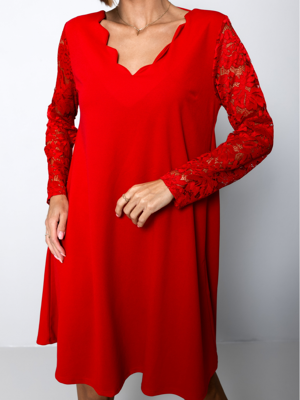 Červené áčkové šaty EPOFIS s krajkovými rukávy