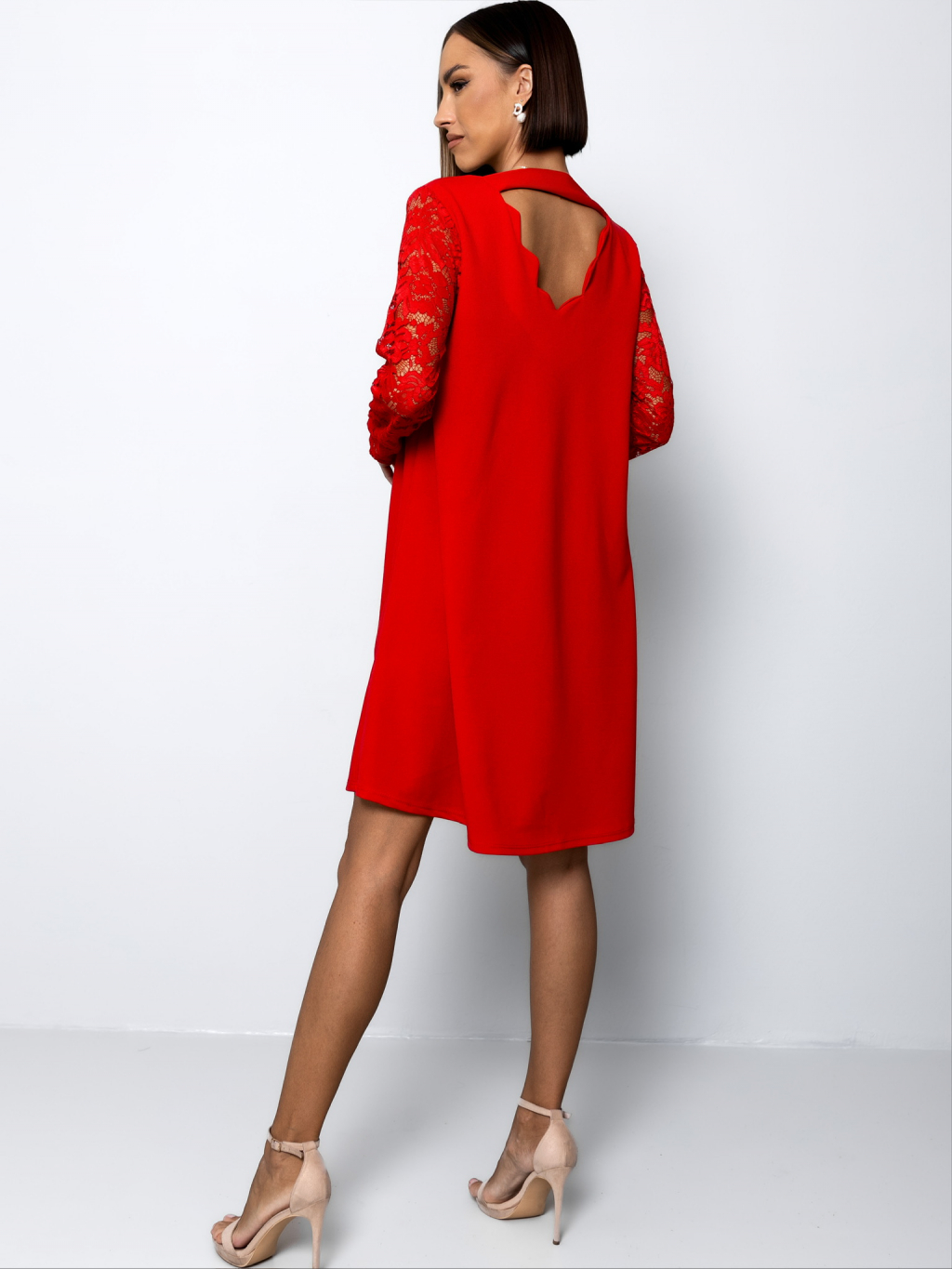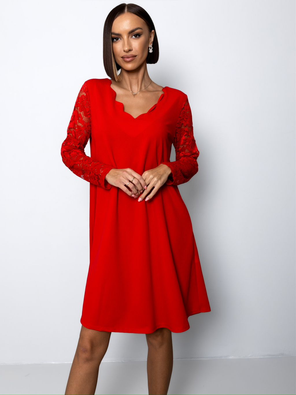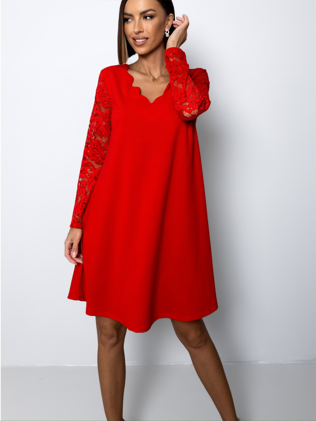 Červené áčkové šaty EPOFIS s krajkovými rukávy
