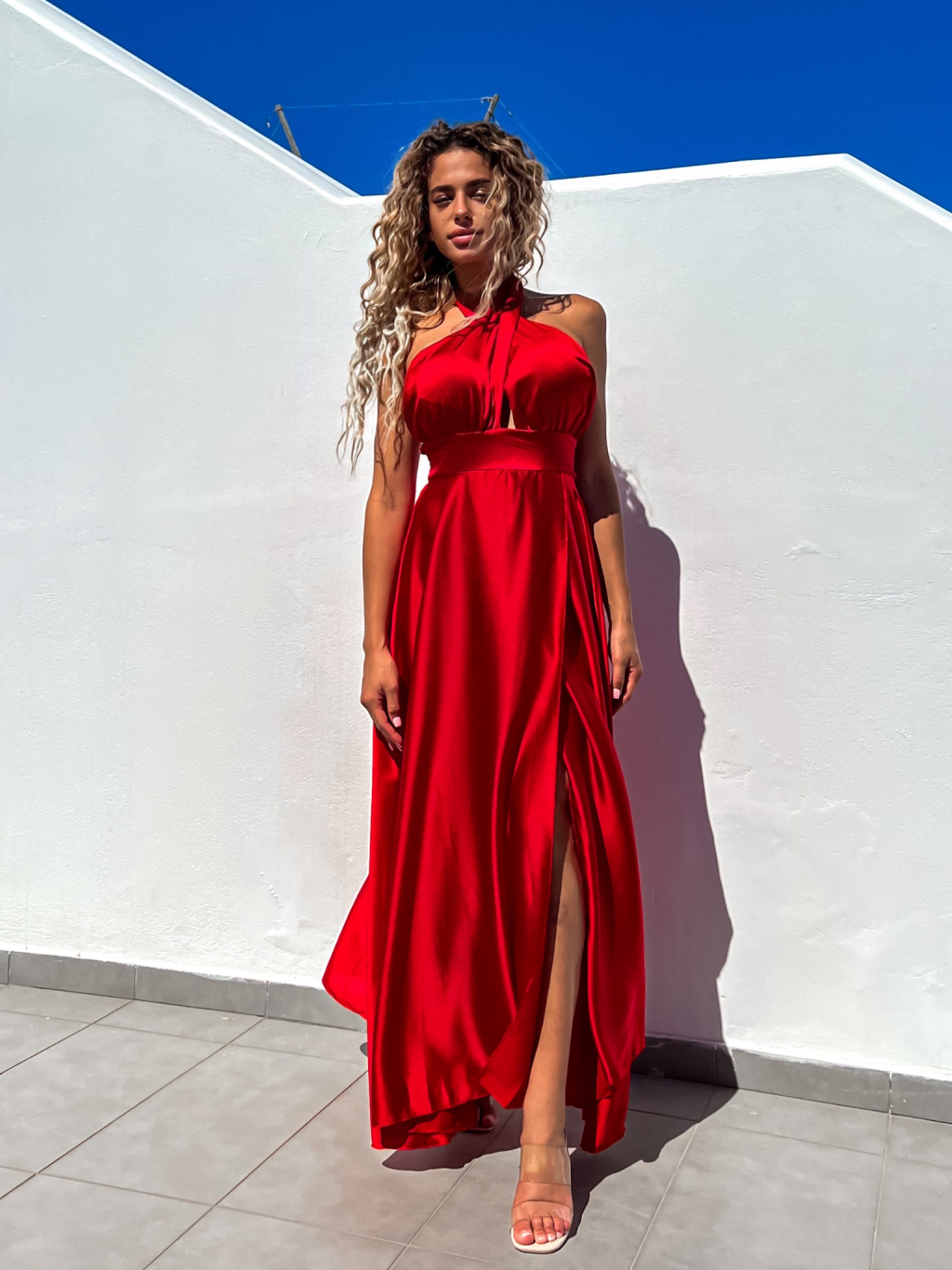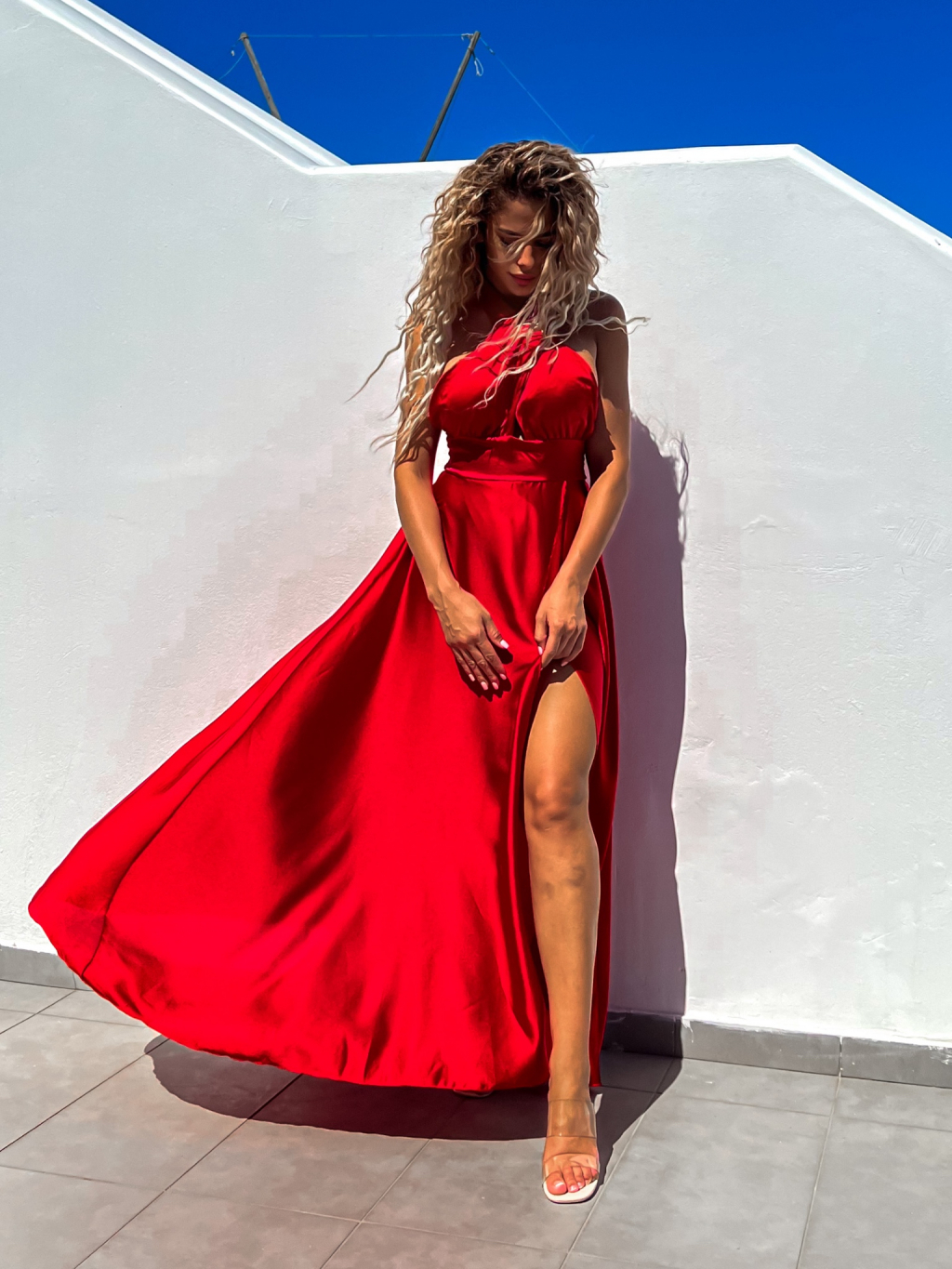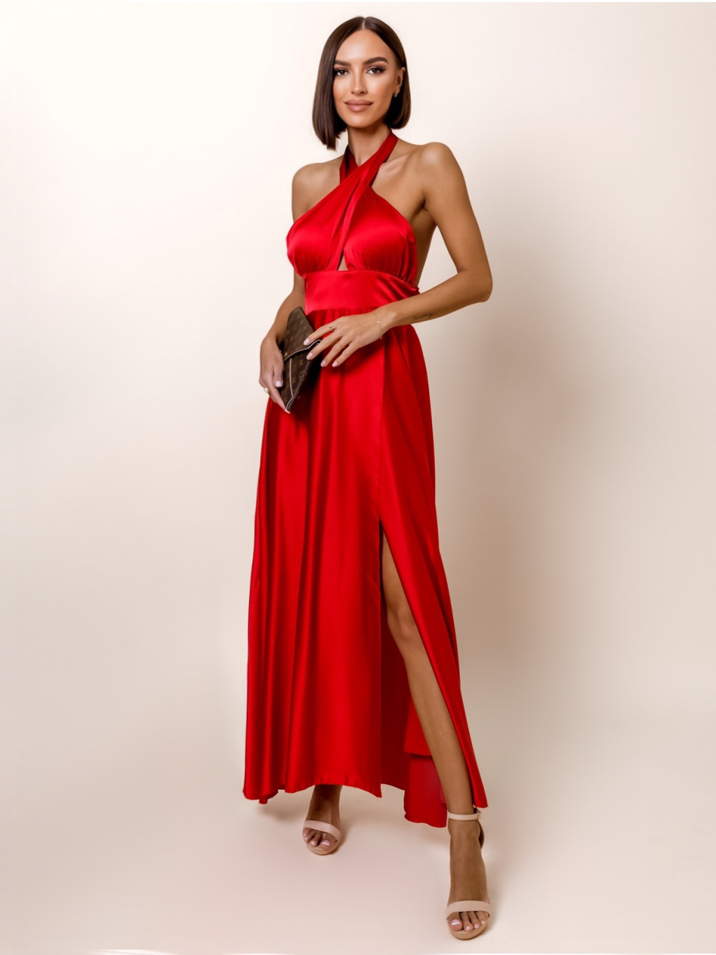 Červené dlouhé elegantní lesklé šaty TARRISA s rozparkem